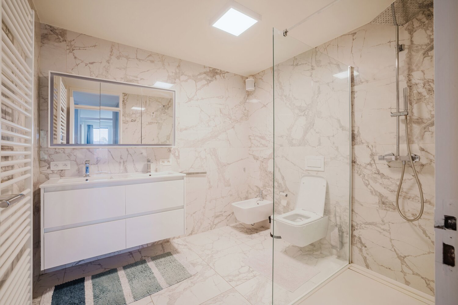 L'appartement est situé au 3e étage et comprend : un hall d'entrée spacieux, des toilettes pour invités, un salon lumineux avec coin repas et une cuisine ouverte entièrement équipée avec accès à la terrasse, une buanderie avec douche à l'italienne, la première chambre avec terrasse, une salle de bains avec douche à l'italienne et double lavabo, un débarras supplémentaire, la deuxième chambre avec lit double et la troisième chambre. Chaque pièce est chauffée et climatisée par une pompe à chaleur. Cet appartement offre la possibilité d'acheter une place de parking, un atout indéniable pour le confort quotidien.