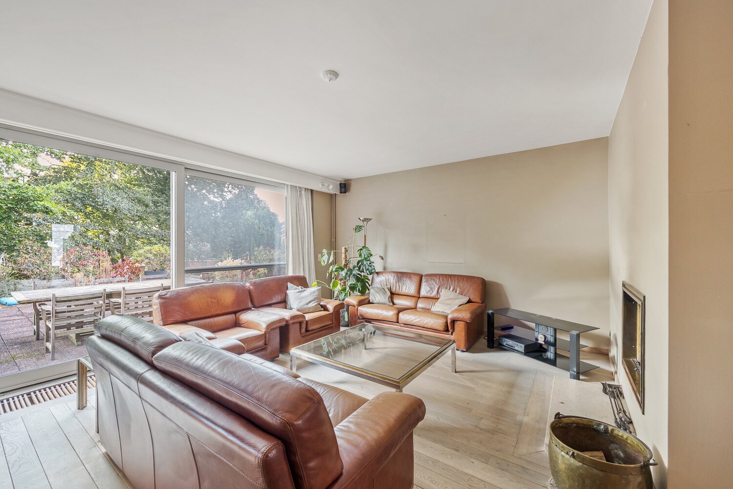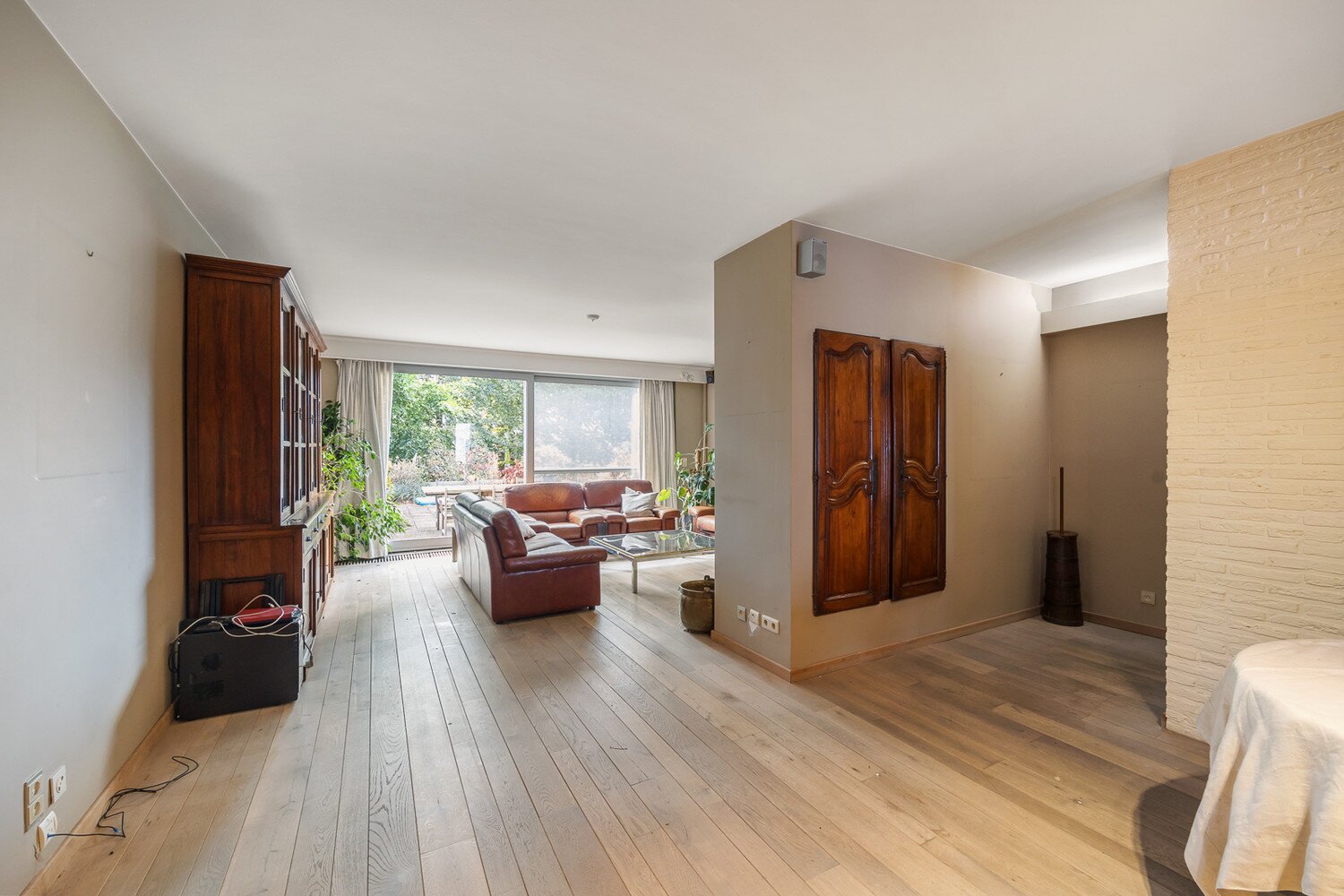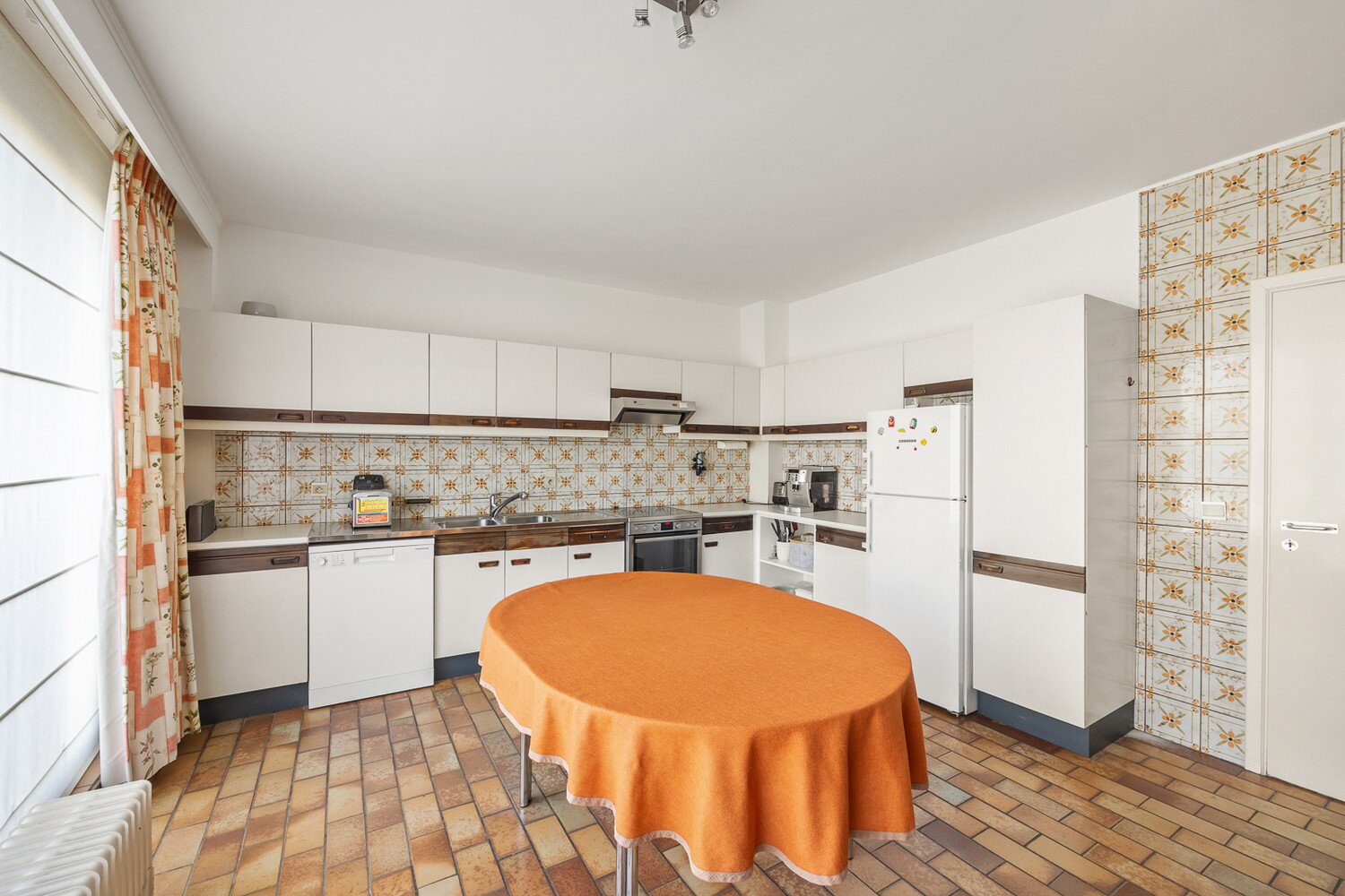 Via de draaitrap of de lift (!) bereikt u de eerste verdieping. De zeer ruime leefruimte met massieve parketvloer geniet van veel lichtinval dankzij het zuidoost-georiënteerde terras met schuifdeur. De ruime keuken dient opgefrist te worden. (PS: de muur tussen keuken en leefruimte is geen dragende muur). Verder beschikt de eerste verdieping over een hal met ingemaakte kast en een apart toilet.