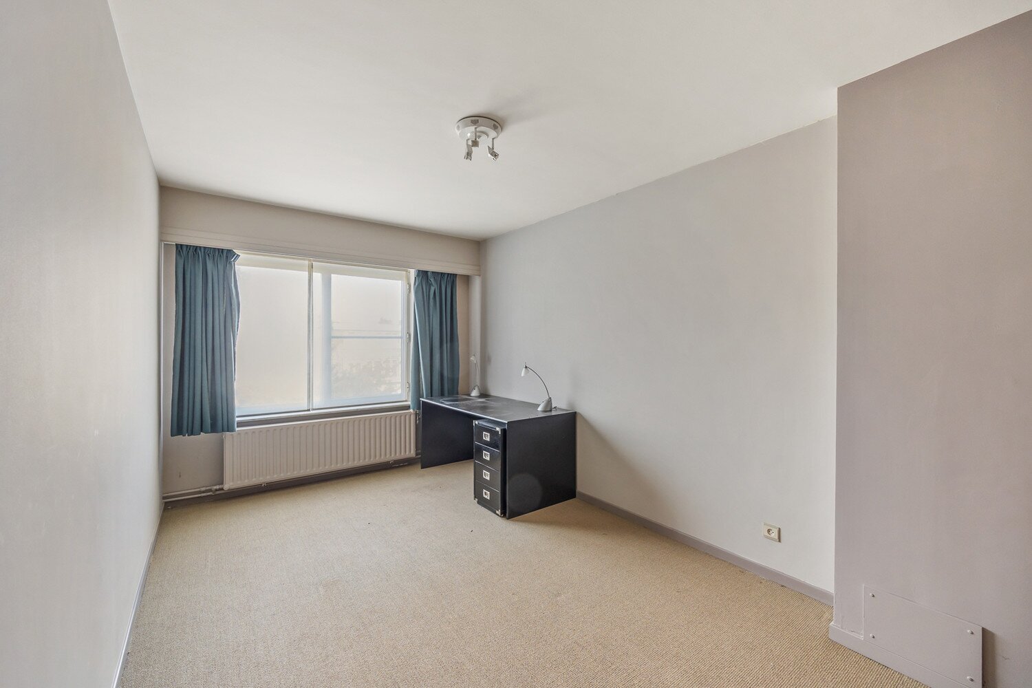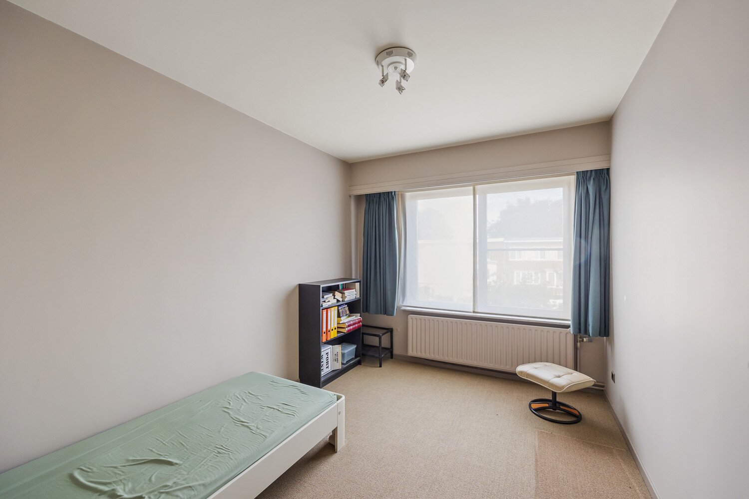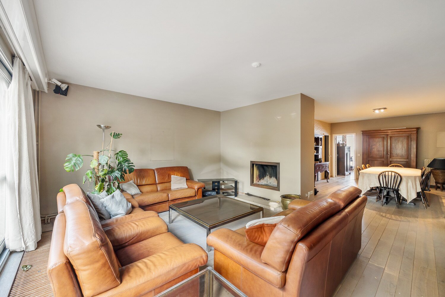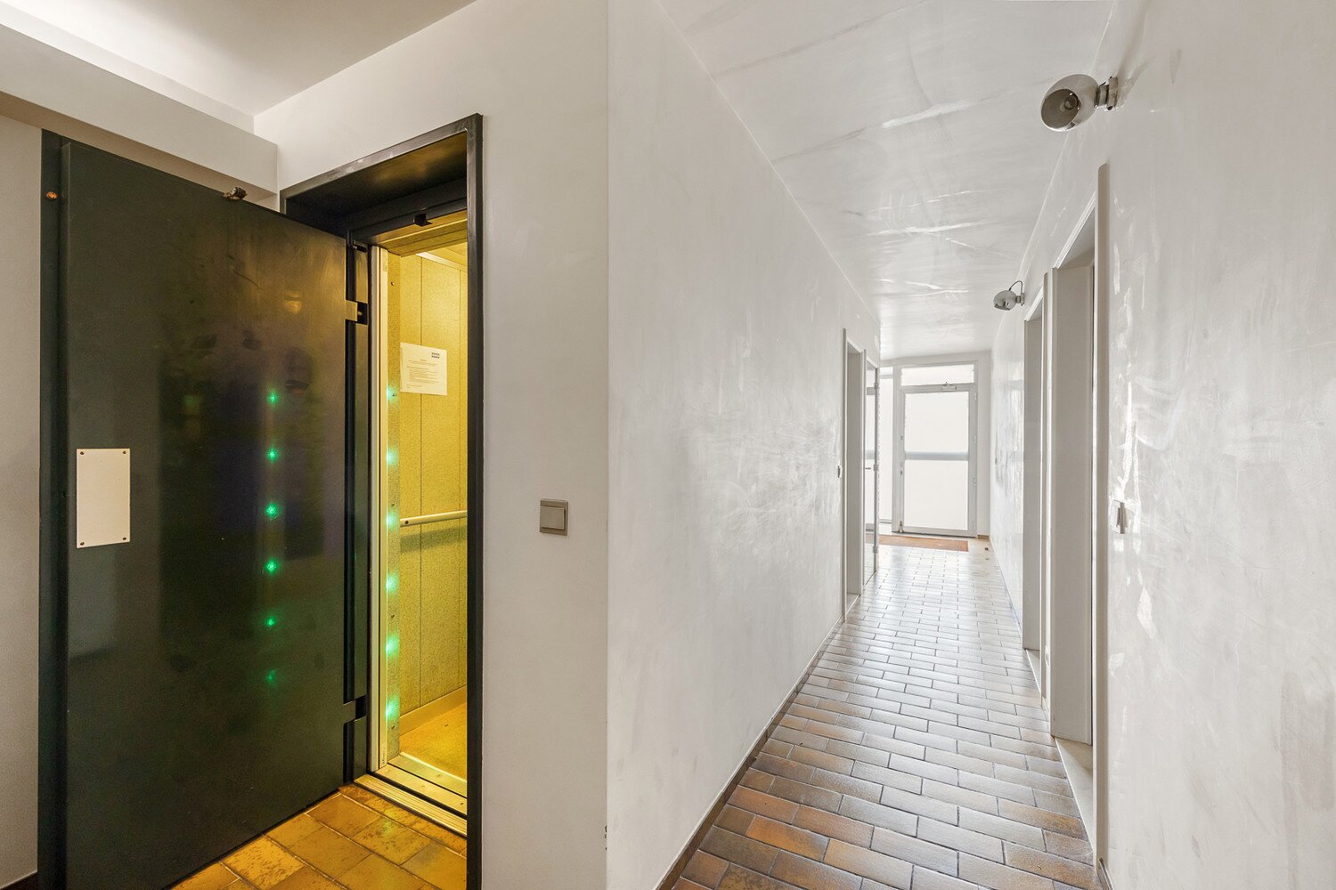 Via de draaitrap of de lift (!) bereikt u de eerste verdieping. De zeer ruime leefruimte met massieve parketvloer geniet van veel lichtinval dankzij het zuidoost-georiënteerde terras met schuifdeur. De ruime keuken dient opgefrist te worden. (PS: de muur tussen keuken en leefruimte is geen dragende muur). Verder beschikt de eerste verdieping over een hal met ingemaakte kast en een apart toilet.