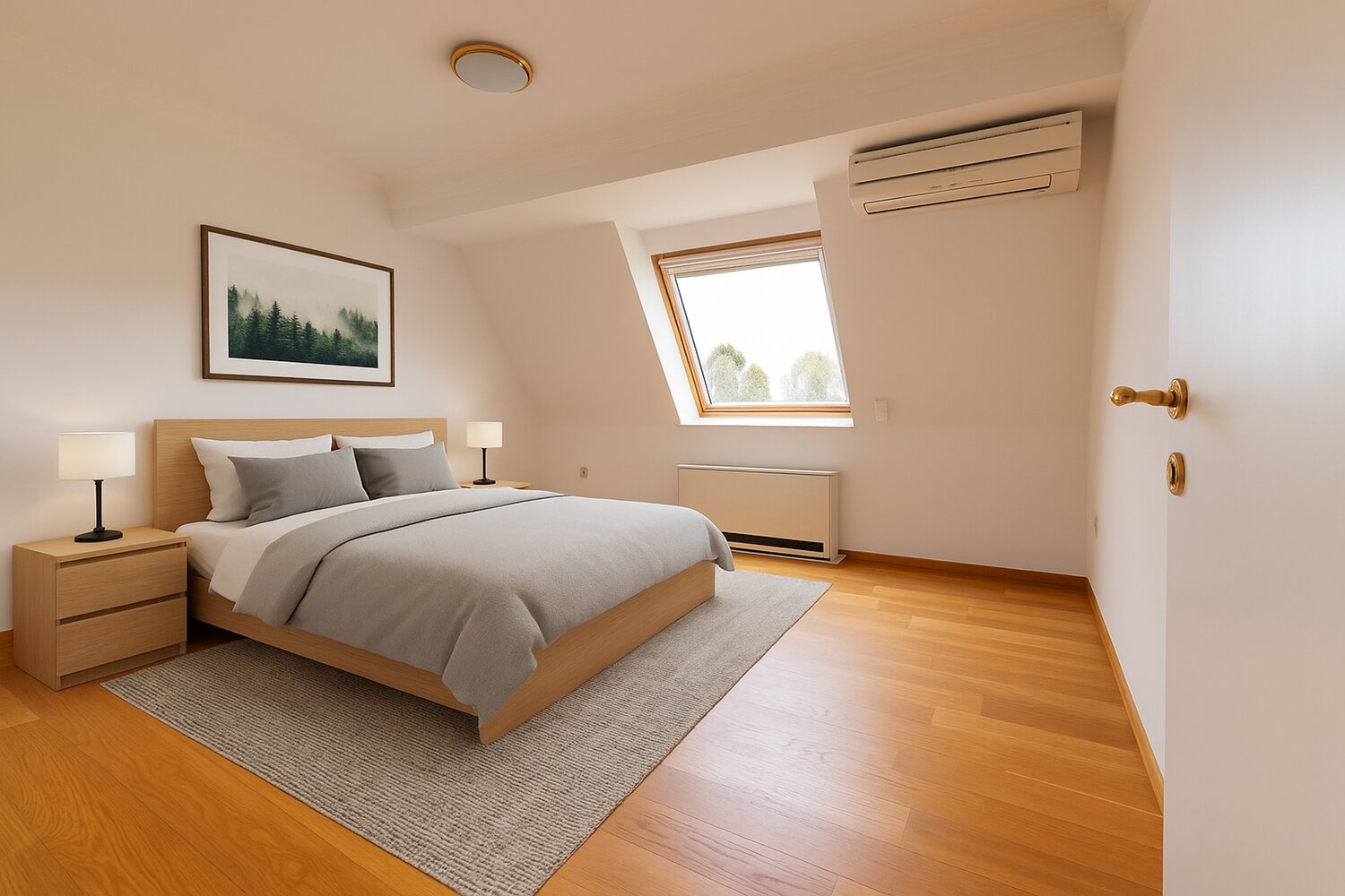 Het appartement bestaat uit een ruime inkomhal, een lichtrijke woonkamer met eetplaats en terras, de afzonderlijke ingerichte keuken, de nachthal, een badkamer met lavabo/douche/toilet alsook twee ruime slaapkamers met automatische veluxen. Er is airconditioning aanwezig.