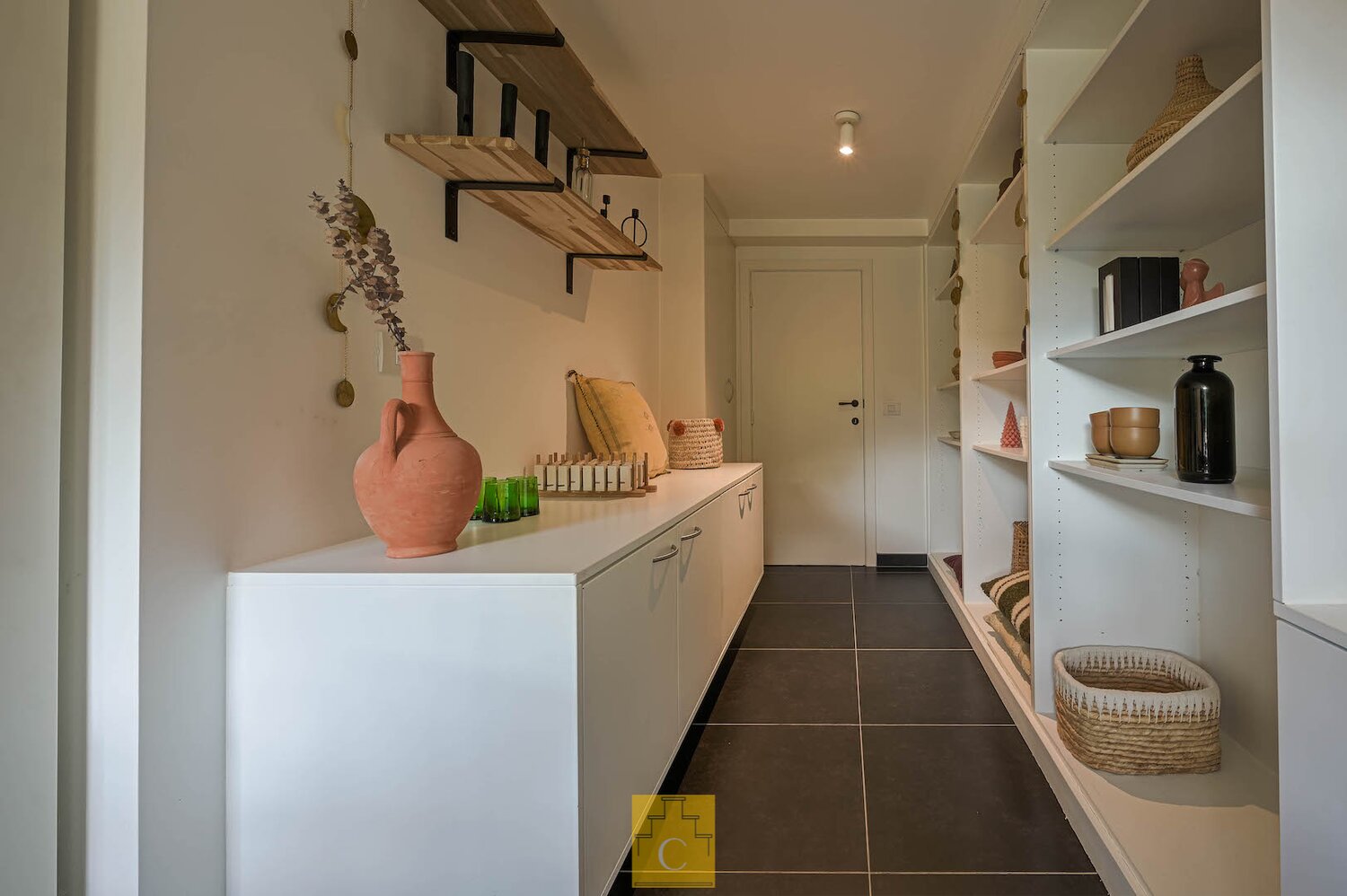 De sfeervolle inkomhal geeft toegang tot een ingericht bureel met zicht op de tuin, een zeer ruime garage met ingemaakte kasten en een praktische wasplaats met doorgang naar het zongerichte terras en de tuin. De tuin biedt volledige privacy dankzij de volwassen hagen en is de ideale plek om te ontspannen.