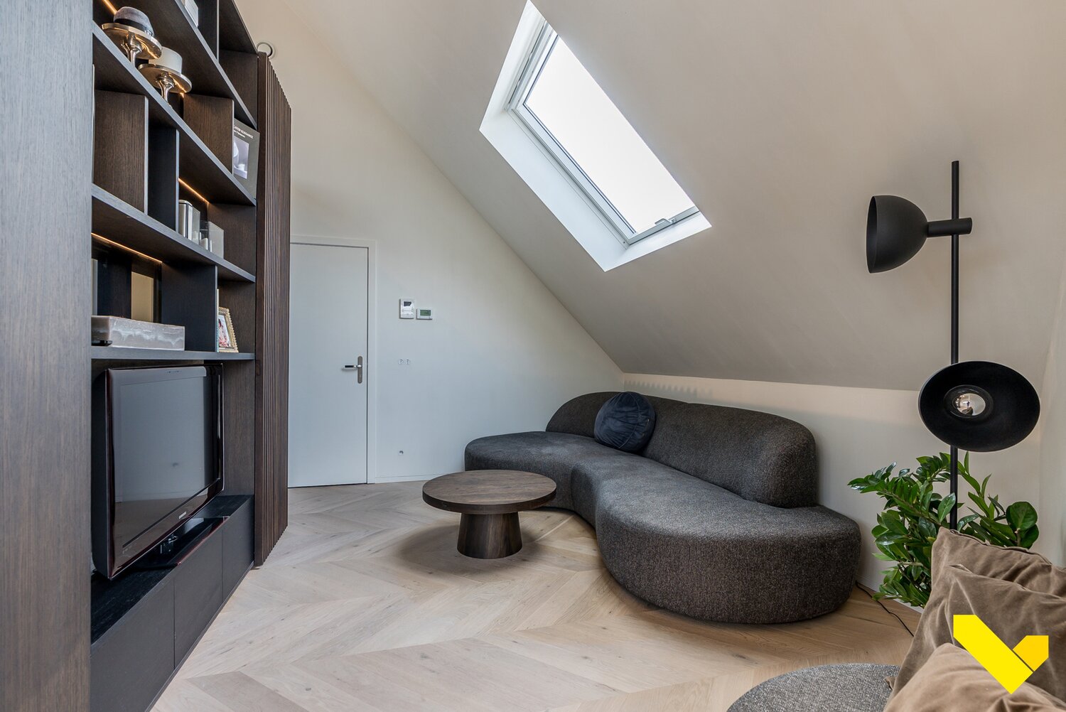 We betreden dit recent appartementsgebouw via de gemeenschappelijke inkomhal om vervolgens via de trap of lift tot de 2de verdieping te gaan. Hier stappen we het volledig high-end afgewerkte appartement binnen en wat ons meteen opvalt is al het perfecte maatwerk dat hier werd uitgevoerd over heel de lijn.