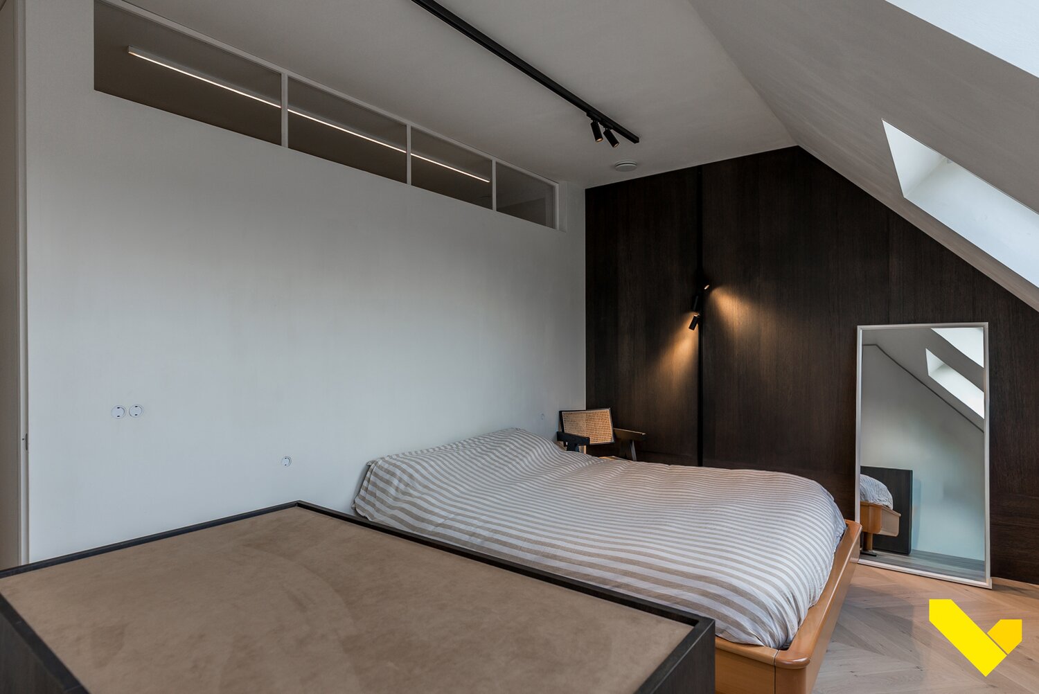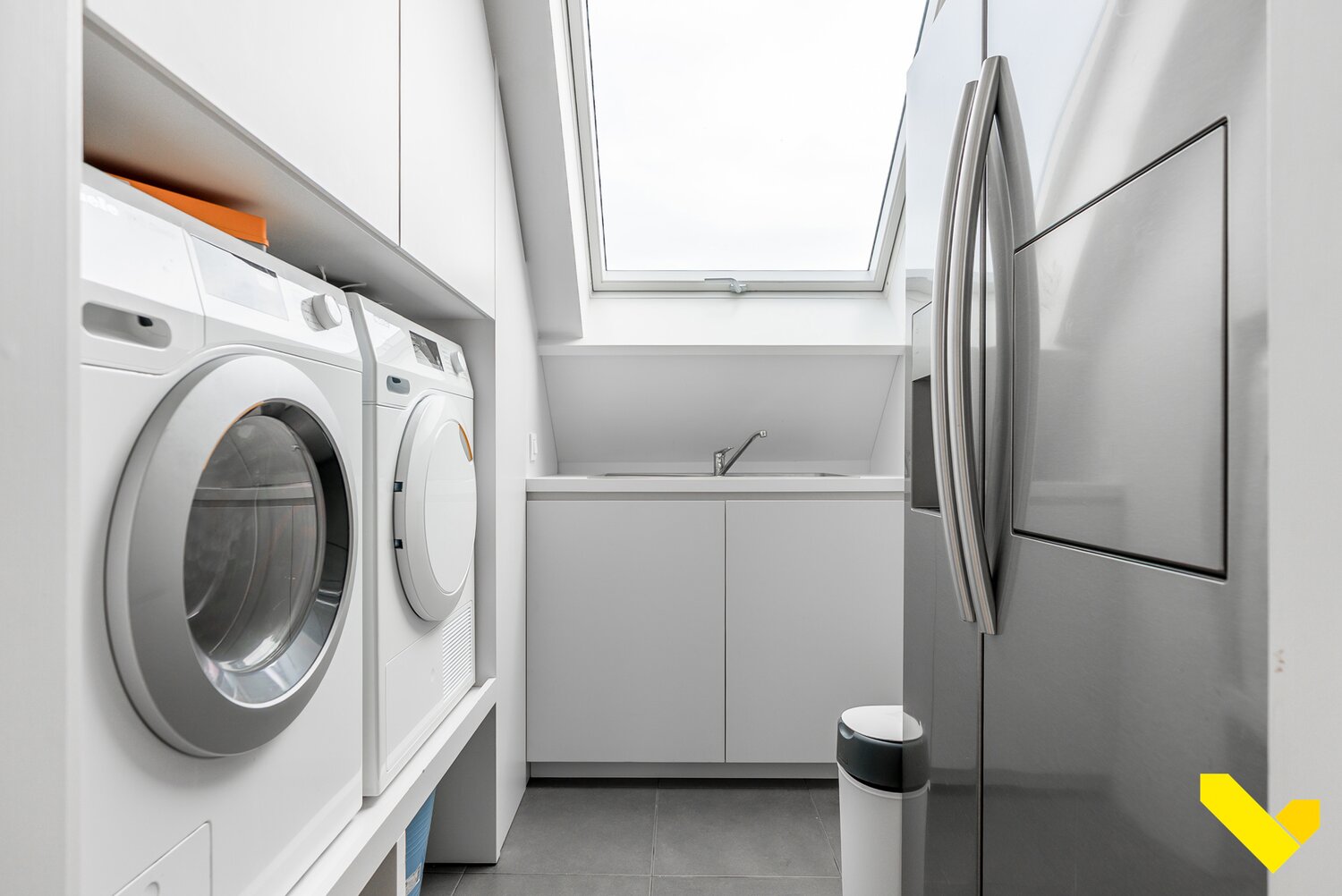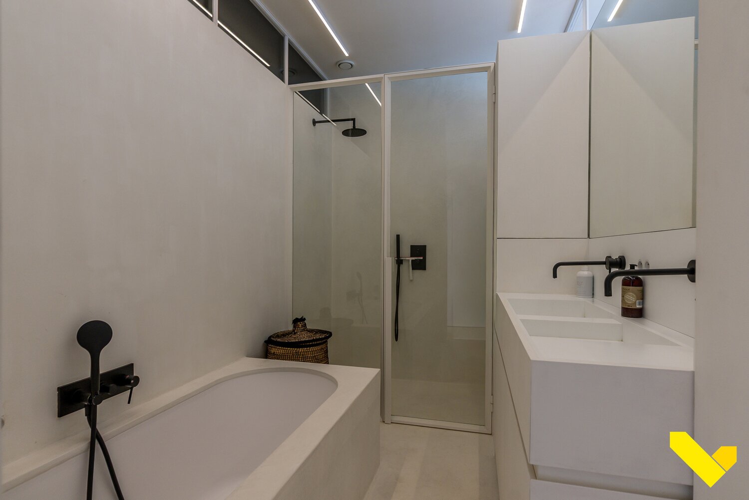 Ingemaakte kasten voor zowel de wasplaats/berging, als de bureau en slaapkamer. Ingewerkt kraanwerk voor lavabo, bad en douche, alles makkelijk in onderhoud en stijlvol!