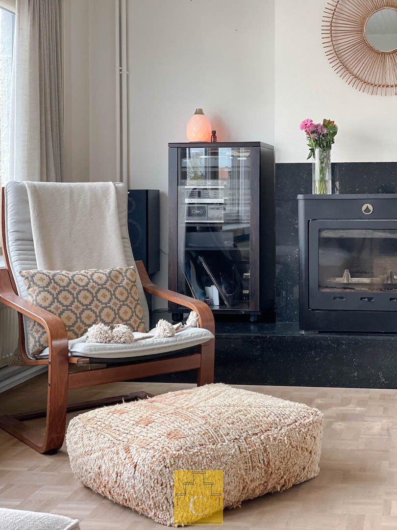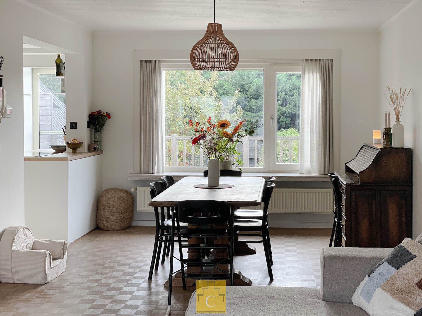 Op de eerste verdieping vind je een lichte en gezellige leefruimte met eetplaats en een aparte zithoek met kachel. De halfopen maatkeuken is uitgerust met tal van kasten, legplanken, opbergruimte en de nodige toestellen. Grote raampartijen (met vliegramen) zorgen voor een overvloed aan natuurlijk licht en een prachtig zicht op de tuin.
