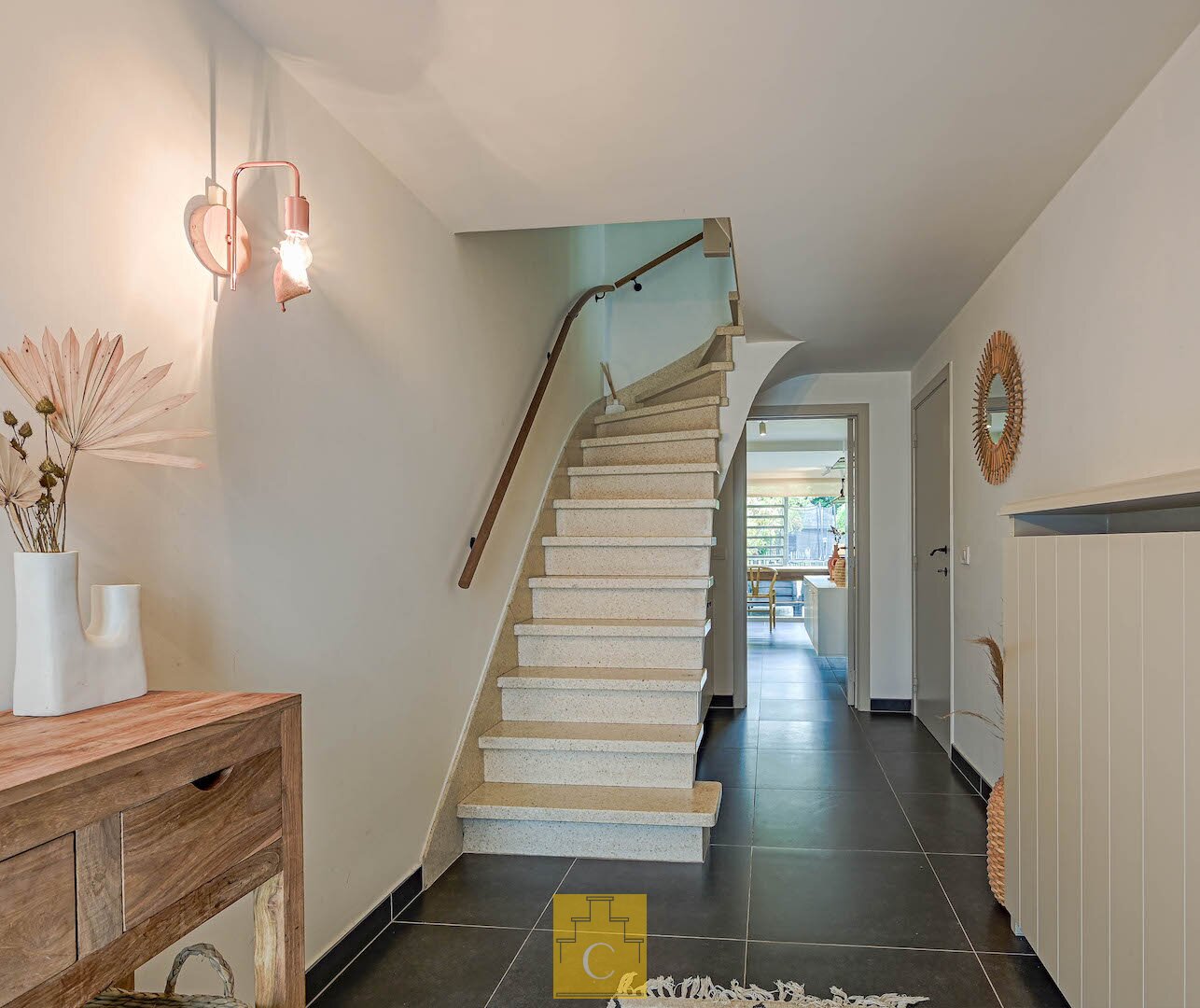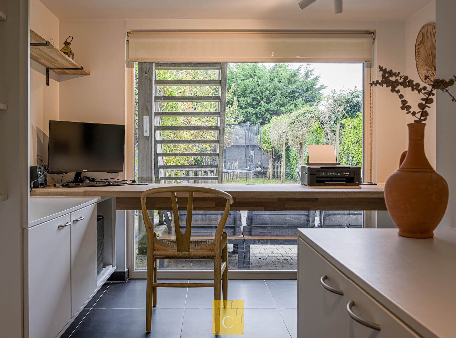 De sfeervolle inkomhal geeft toegang tot een ingericht bureel met zicht op de tuin, een zeer ruime garage met ingemaakte kasten en een praktische wasplaats met doorgang naar het zongerichte terras en de tuin. De tuin biedt volledige privacy dankzij de volwassen hagen en is de ideale plek om te ontspannen.
