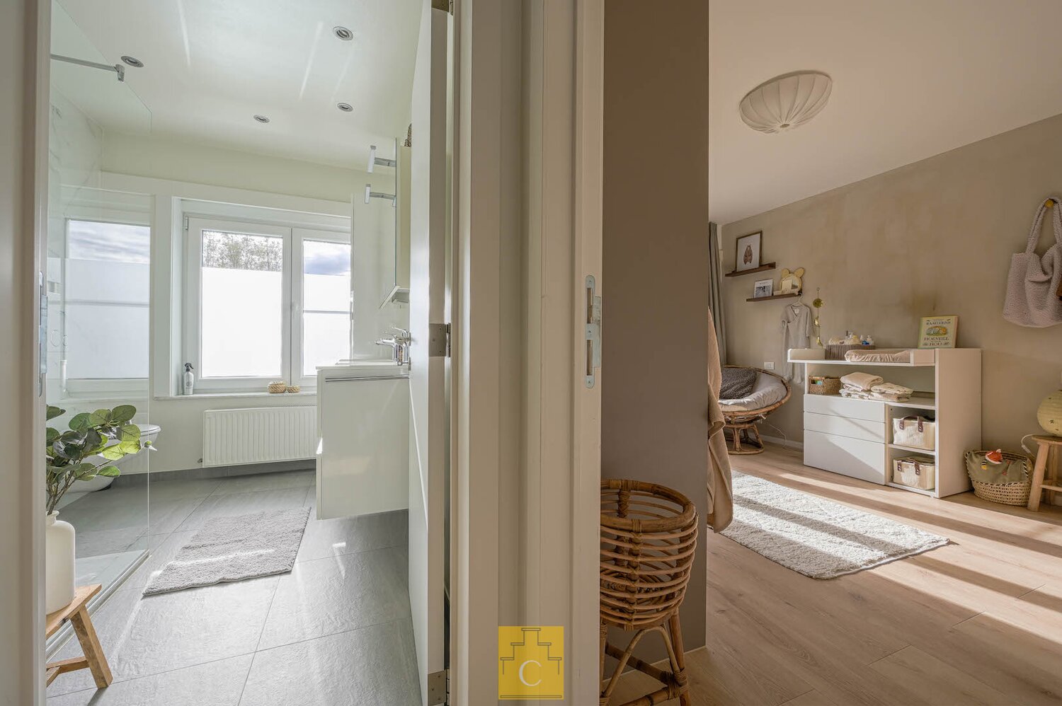 De tweede verdieping omvat twee ruime slaapkamers, dressing en een badkamer met inloopdouche, toilet, dubbele lavabo in meubel en spiegelkast.