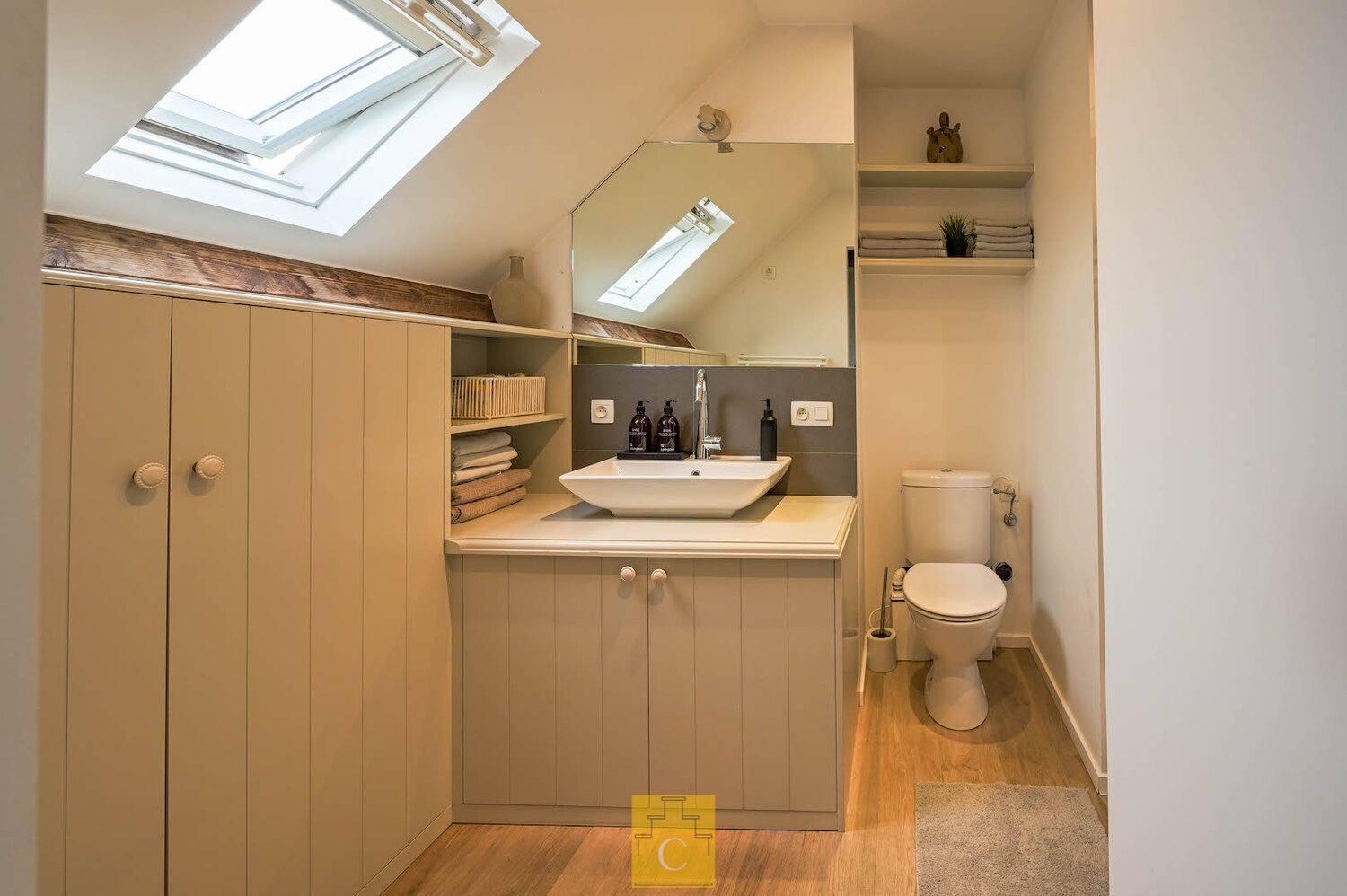 Via de vaste trap bereik je de derde verdieping, waar de master bedroom zich bevindt, voorzien van tal van ingemaakte kasten, airco en een eigen badkamer met douche, toilet en lavabo.