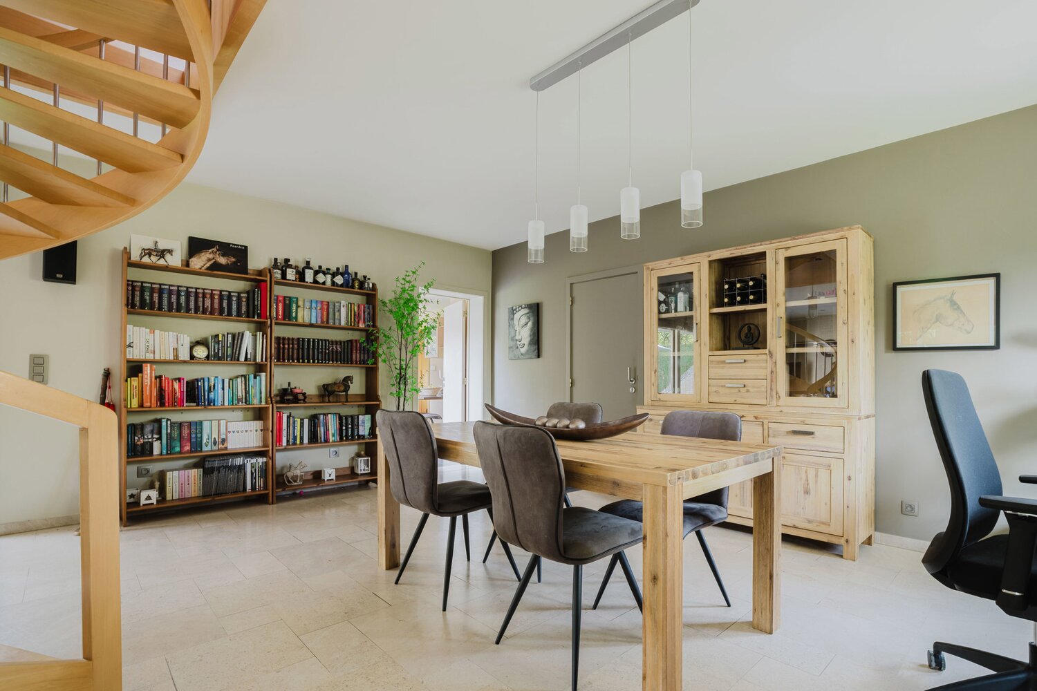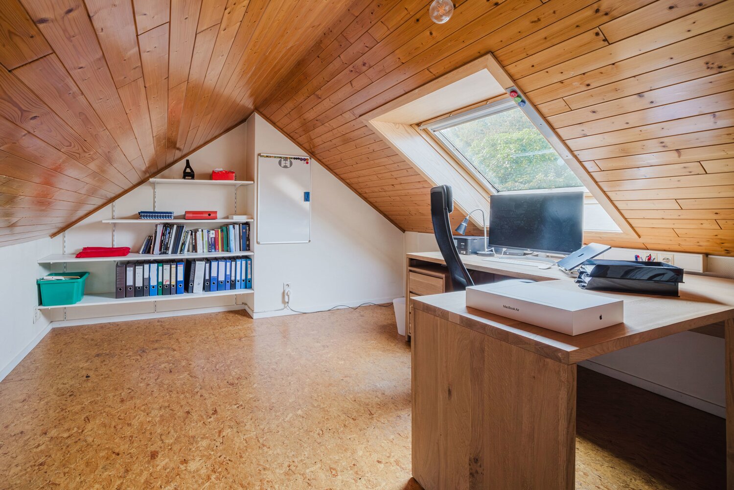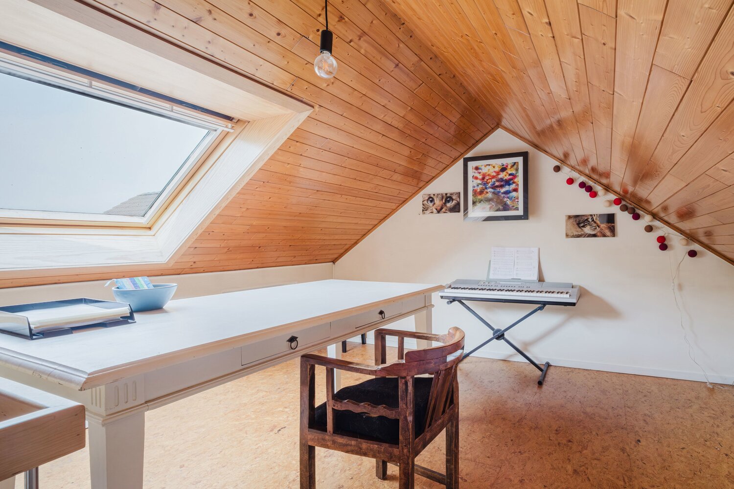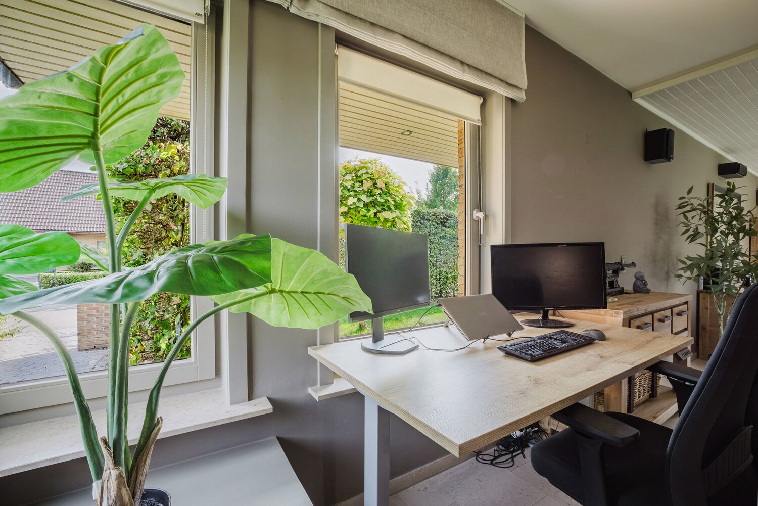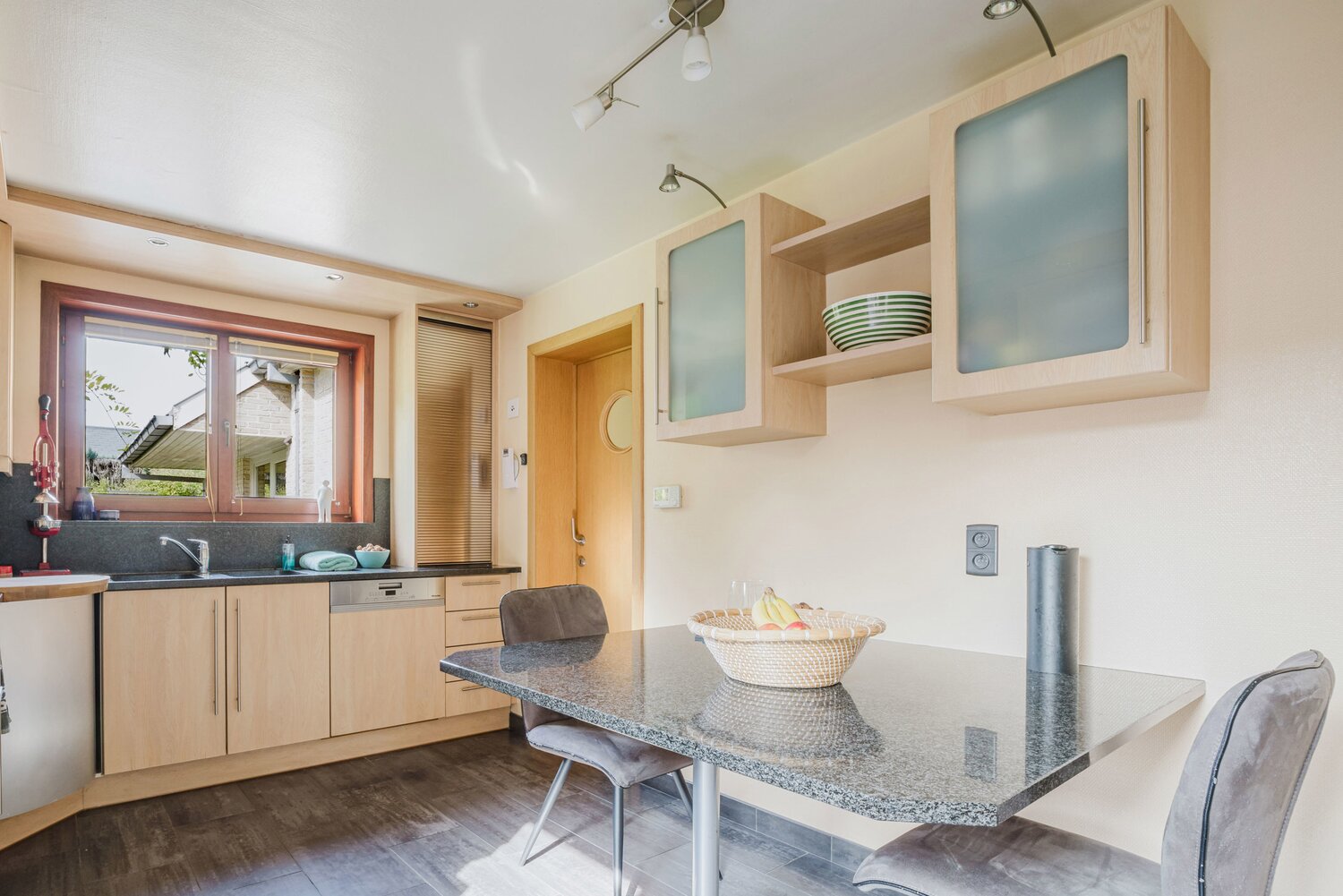 Cette maison soignée et prête à emménager vous accueille dans un vaste hall d'entrée doté de toilettes pour invités et d'un placard encastré pratique. D'un côté se trouve un salon particulièrement spacieux et lumineux, prolongé par un bureau — idéal pour le télétravail ou comme espace de loisirs. L'espace de vie s'ouvre naturellement sur une cuisine moderne entièrement équipée, offrant tout le confort nécessaire.