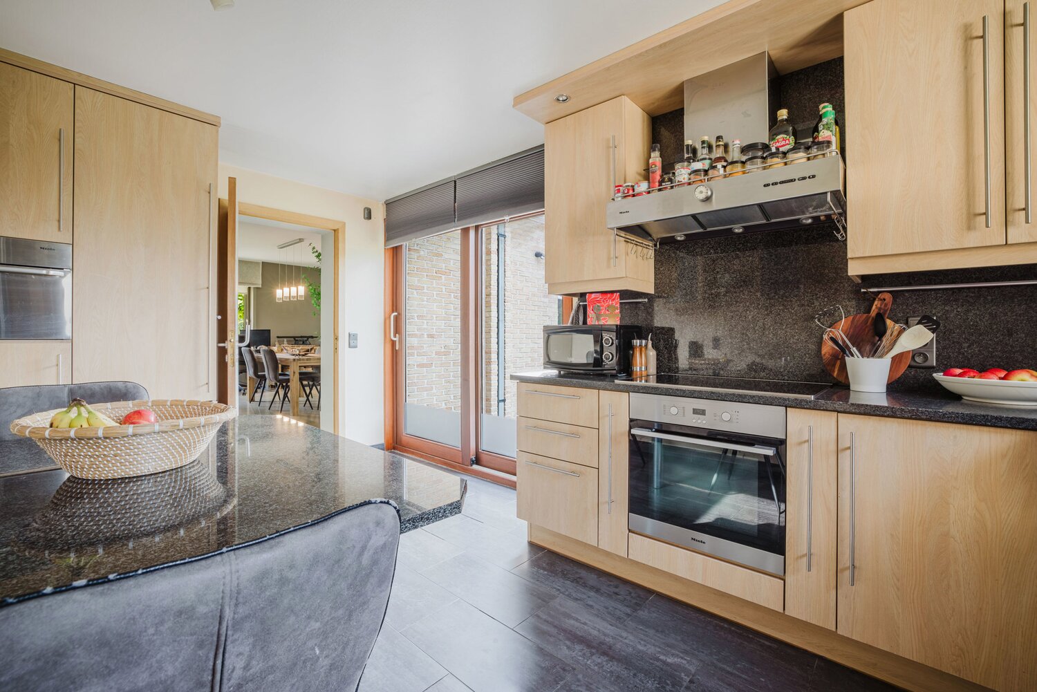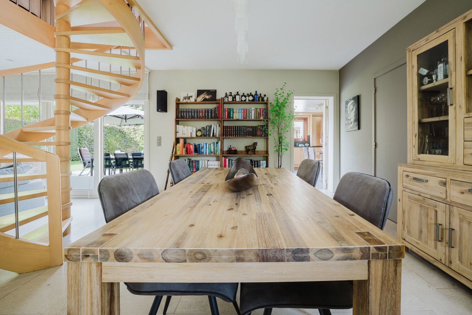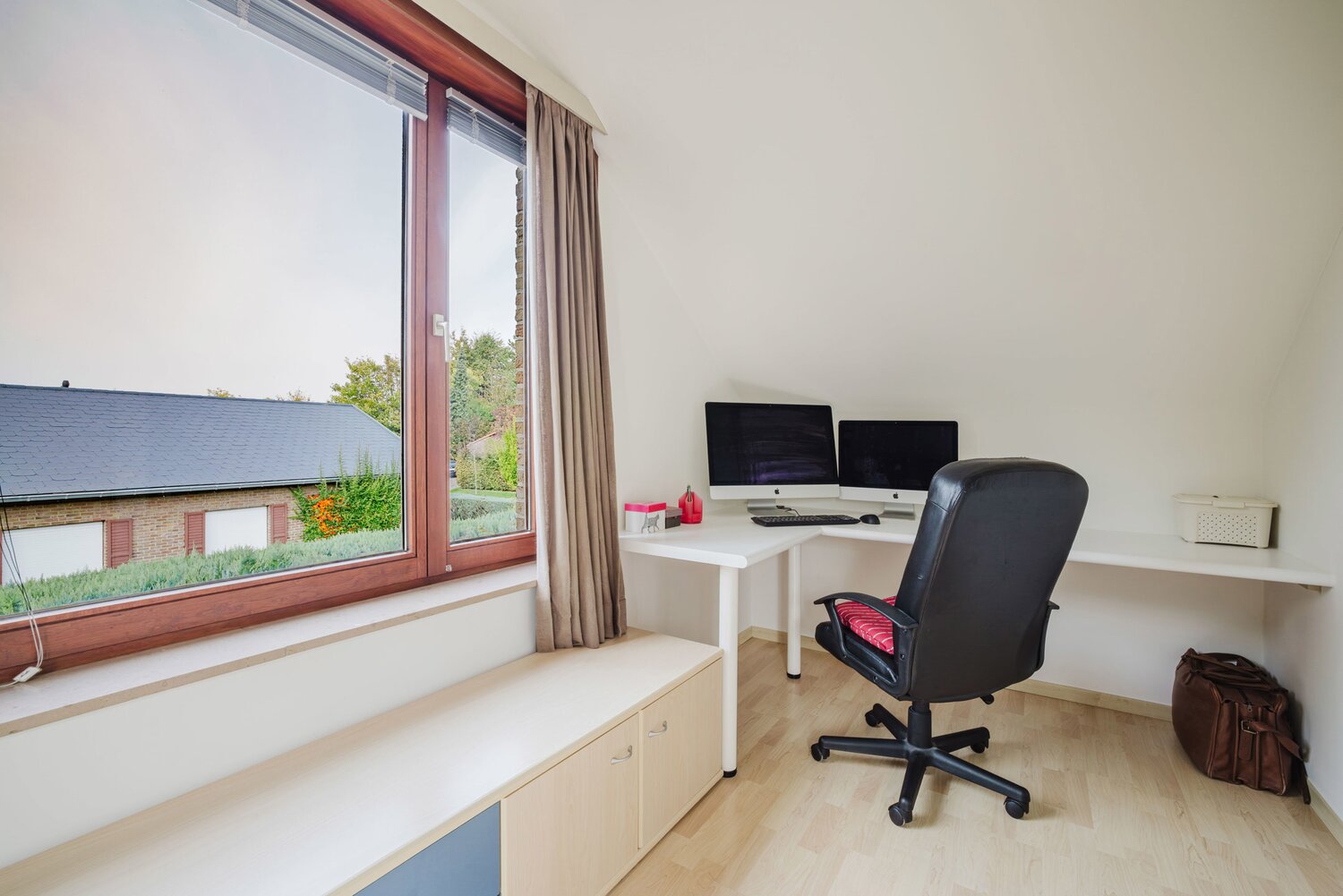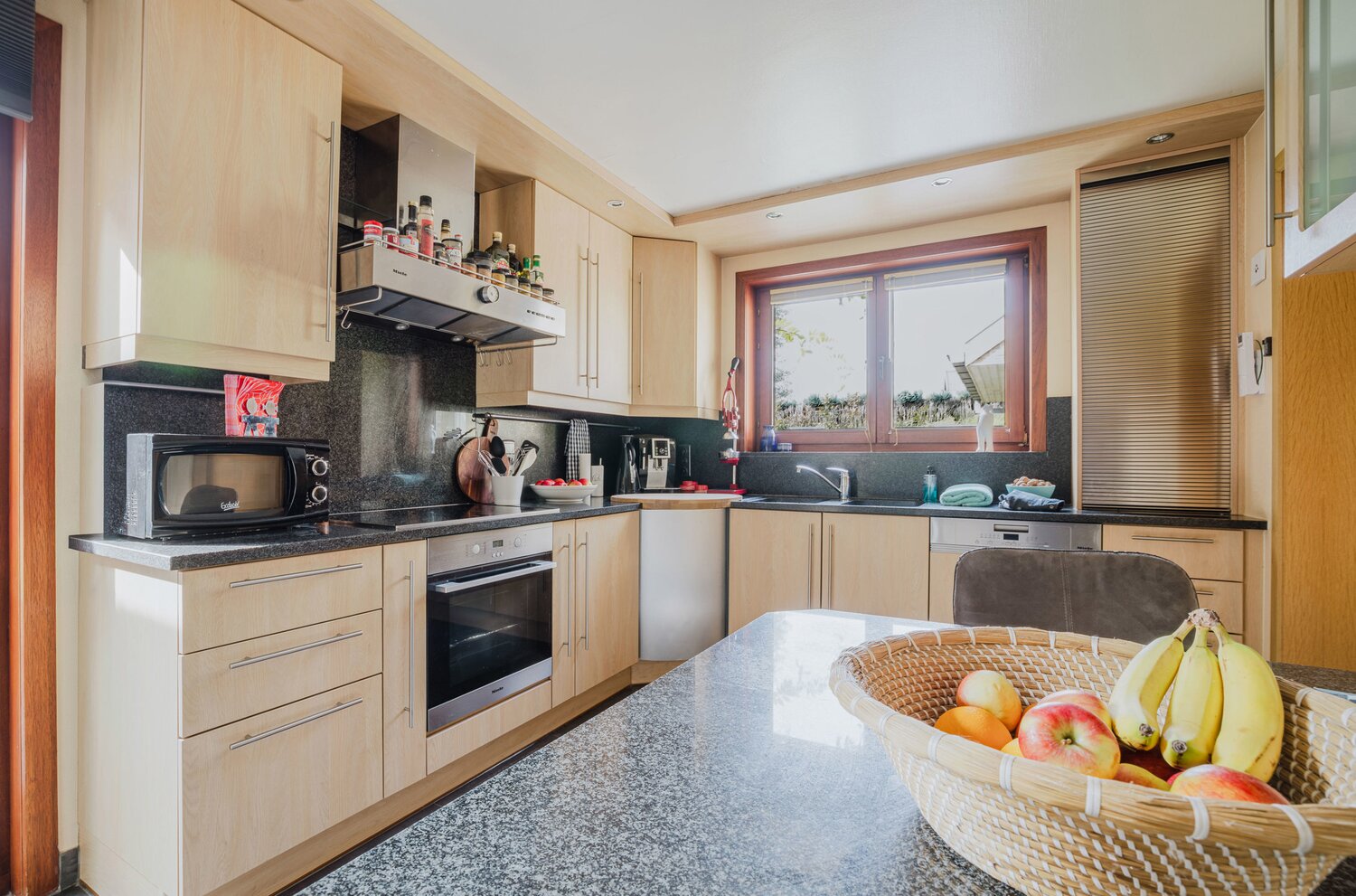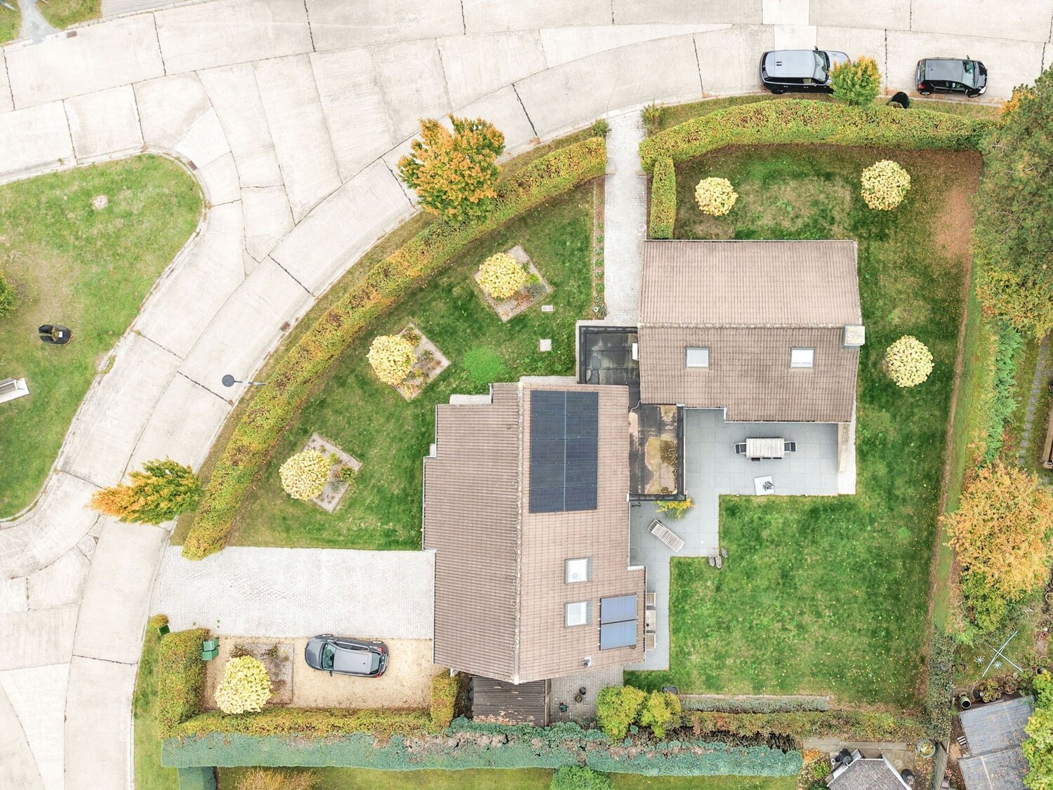 Cette maison soignée et prête à emménager vous accueille dans un vaste hall d'entrée doté de toilettes pour invités et d'un placard encastré pratique. D'un côté se trouve un salon particulièrement spacieux et lumineux, prolongé par un bureau — idéal pour le télétravail ou comme espace de loisirs. L'espace de vie s'ouvre naturellement sur une cuisine moderne entièrement équipée, offrant tout le confort nécessaire.