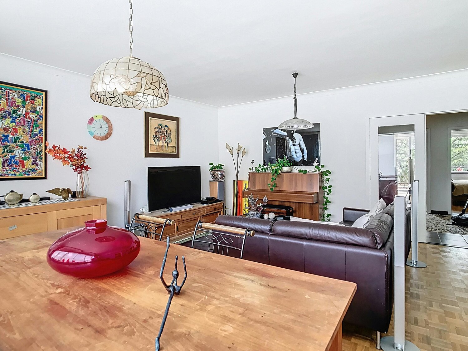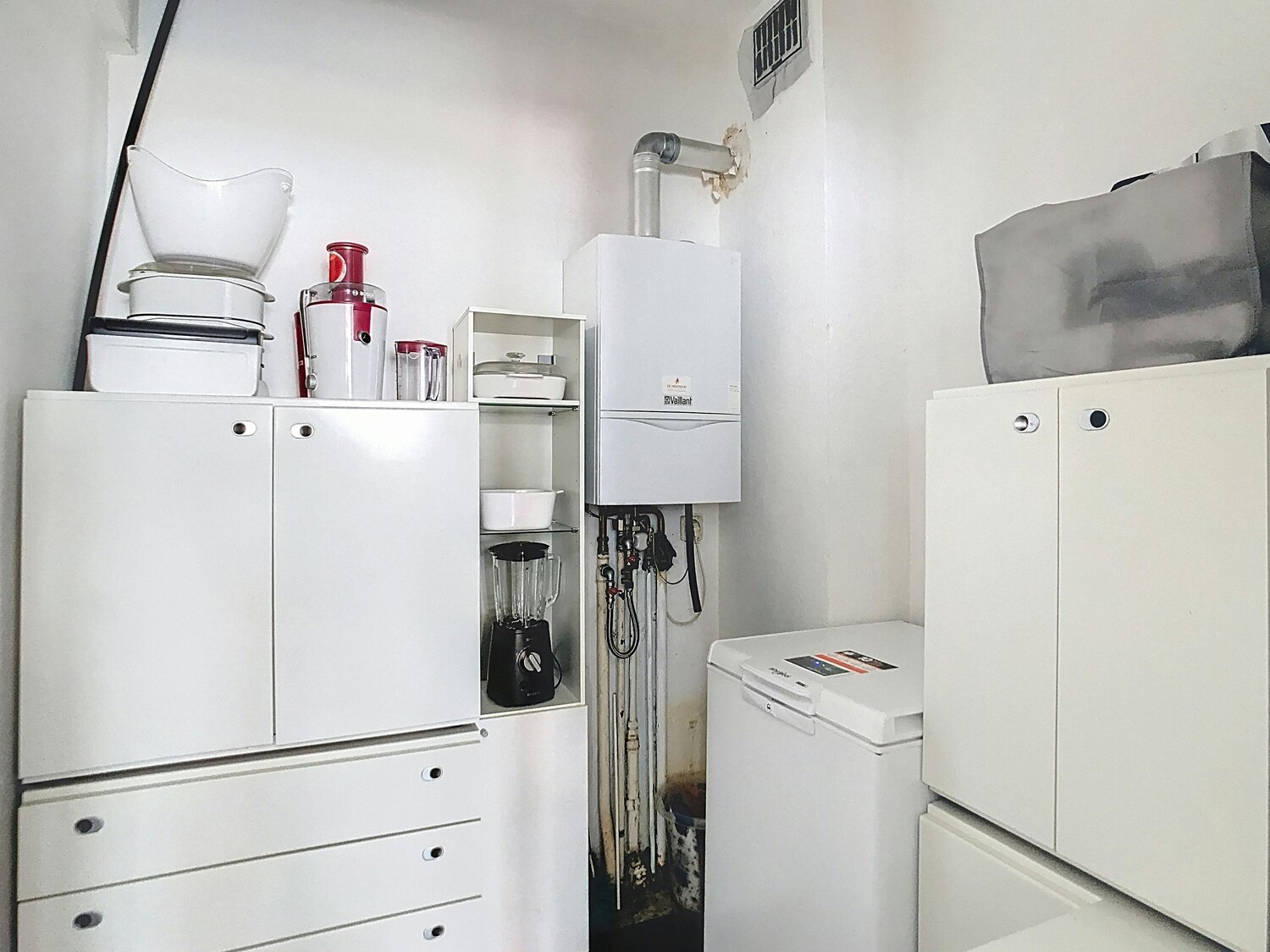 En entrant au 1er étage, vous remarquerez immédiatement le hall d'entrée spacieux, qui mène à un salon lumineux avec des fenêtres sur toute la largeur, créant une merveilleuse sensation d'espace. La cuisine bien entretenue est équipée d'une plaque vitrocéramique, d'une hotte et d'un réfrigérateur, et il y a un débarras attenant très pratique. Depuis le hall d'entrée, vous pouvez accéder aux toilettes invités et à la salle de bain avec baignoire.