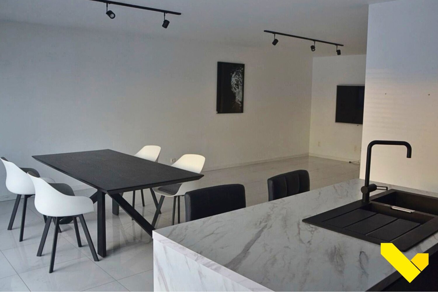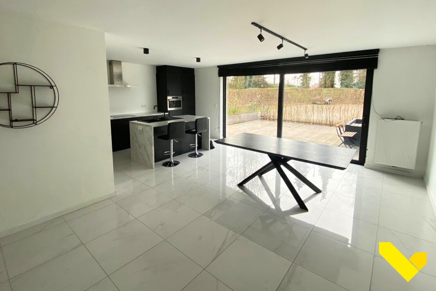 Via de inkomhal, met ruimte voor vestiaire, betreden we de woonkamer met open keuken en eiland. Vanuit deze ruimte kijkt u via de grote schuifraam op het achtergelegen terras.