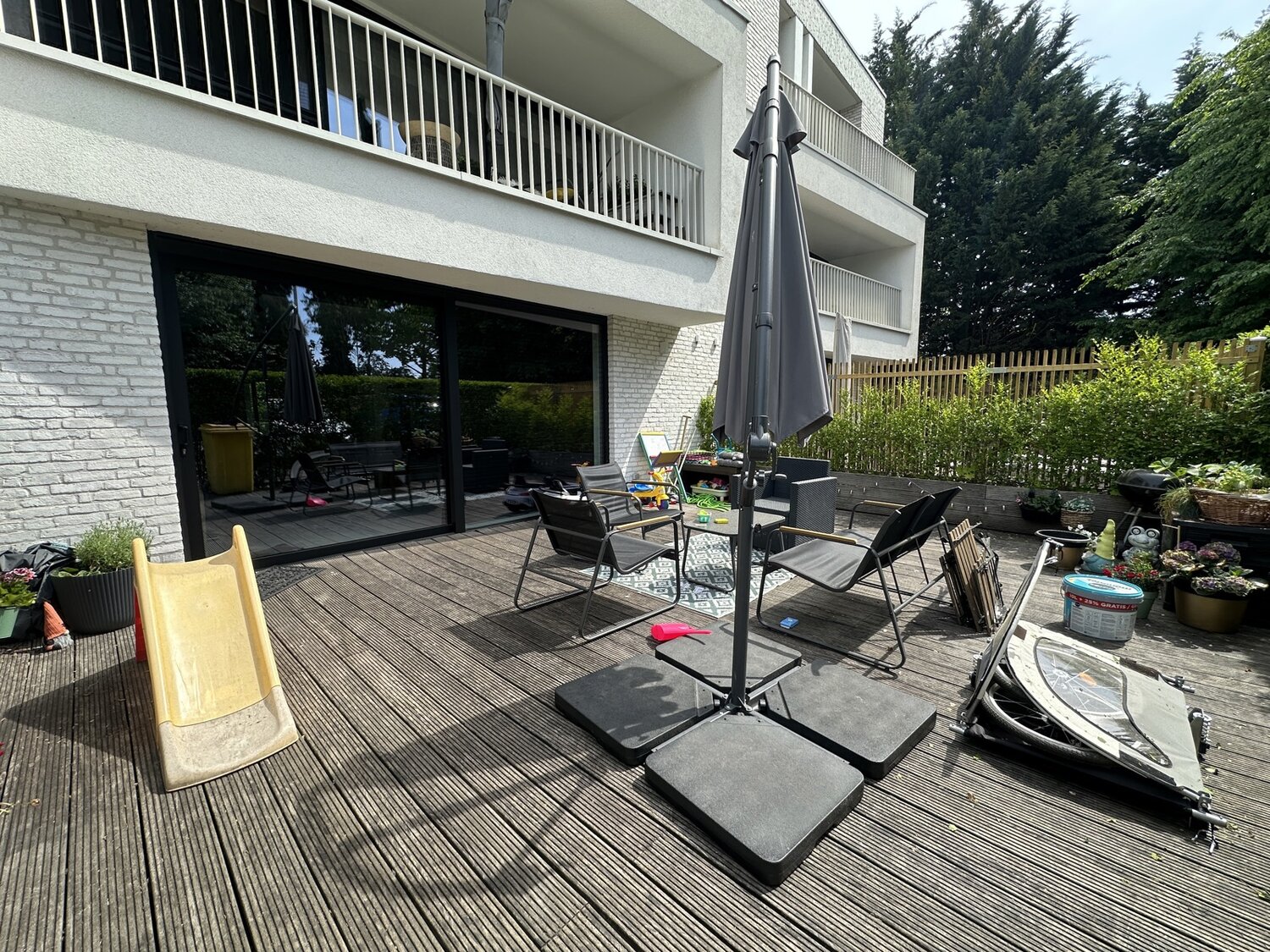 De autostaanplaats is gelegen achter het terras en via deze weg kan u ook het appartement betreden. In de kelder is er een ruime private kelderberging waar u veilig fietsen en andere spullen kan opbergen. Beiden zijn aan te kopen mits meerprijs van 20.000 euro.