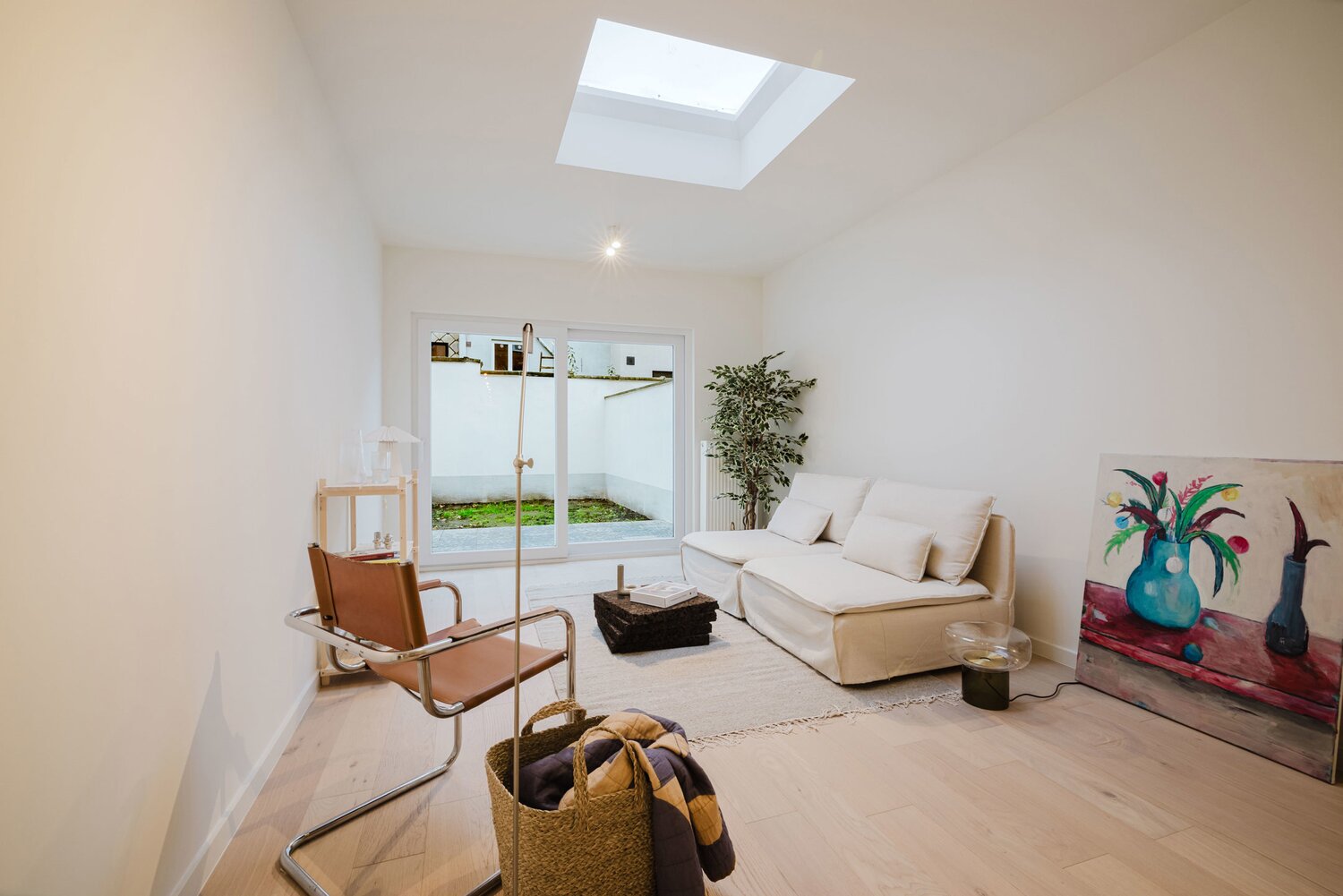 Gezellige leefruimte met veel natuurlijk licht en zicht op de tuin