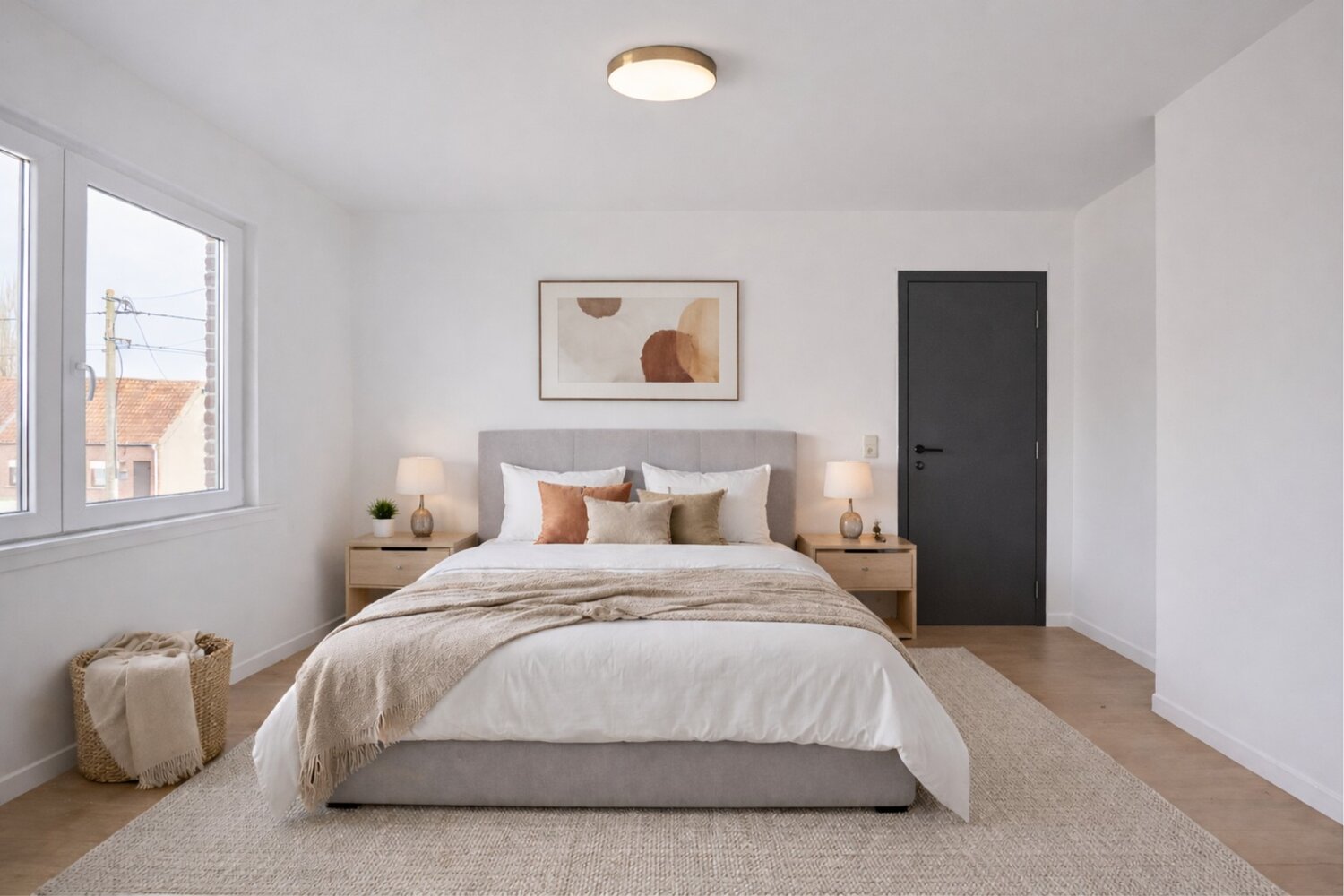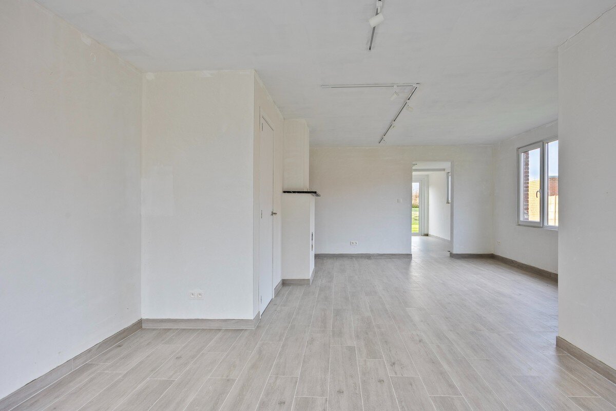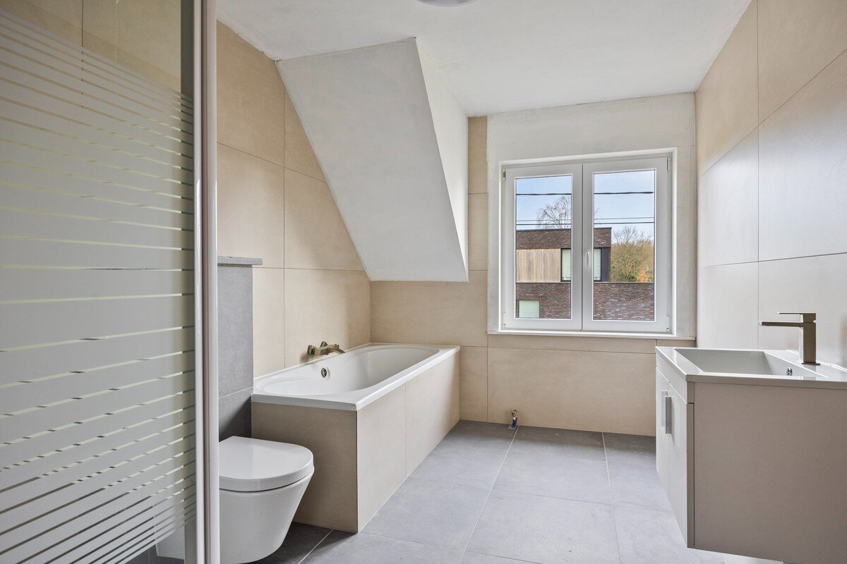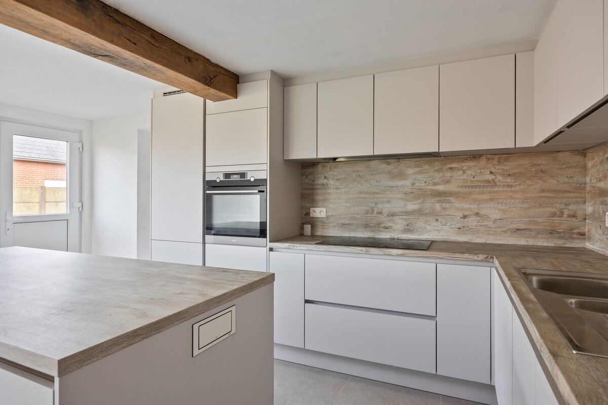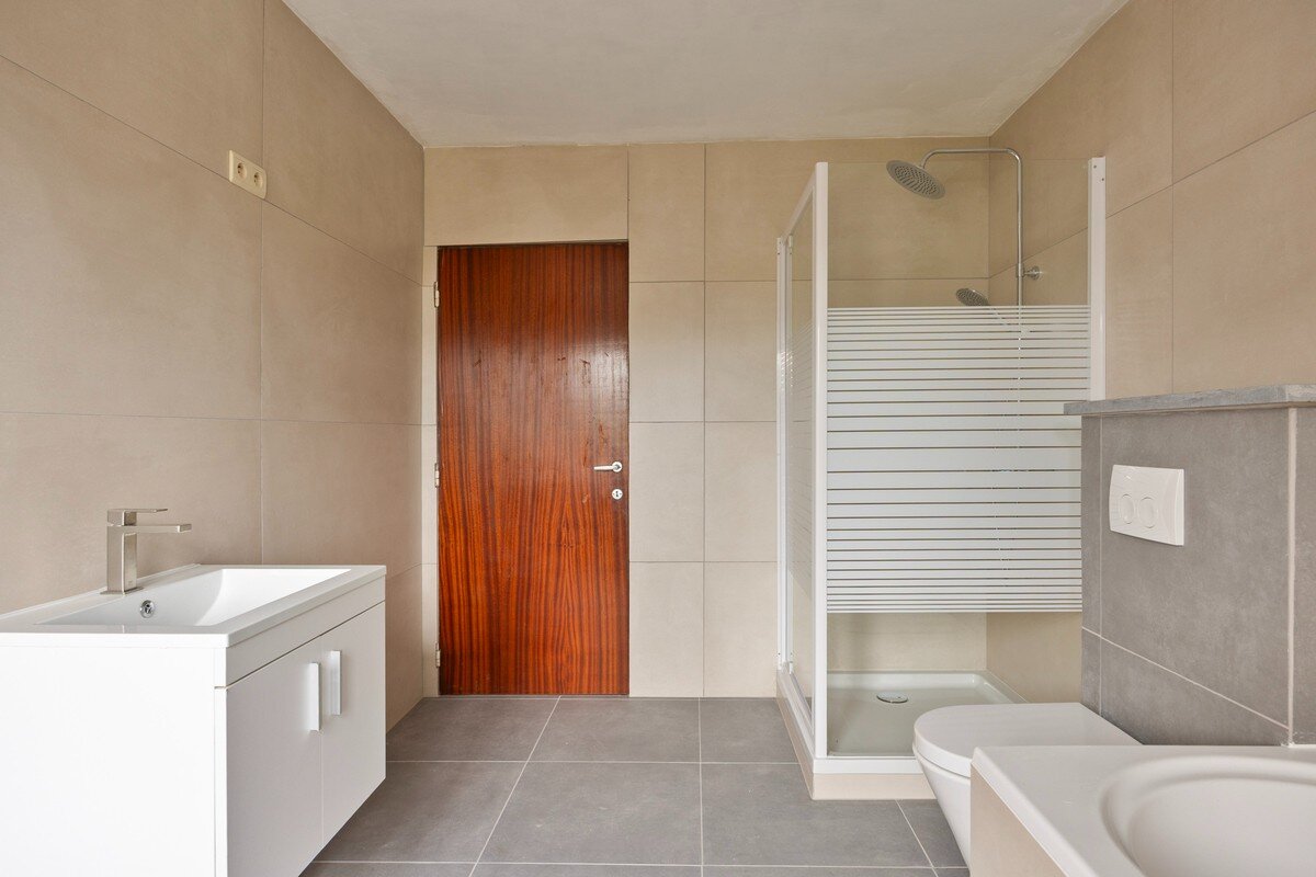 Het gelijkvloers werd volledig vernieuwd en is afgewerkt met vloerverwarming, nieuwe tegels en warme houtaccenten. De muren zijn schilderklaar. De volledig nieuwe, geïnstalleerde keuken sluit naadloos aan op de leefruimte en is uitgerust met alle nodige toestellen. Verder bevinden zich hier een gastentoilet en een praktische berging onder de trap. Achteraan is er een aparte wasruimte met aansluitingen voor wasmachine en droogkast. Vanuit deze ruimte leidt een trap naar een volledig afgewerkte mezzanine met geïsoleerd dak, die extra ruimte en flexibiliteit biedt. Vanuit het gelijkvloers is er tevens toegang tot de tuin, die recent volledig opnieuw werd ingezaaid.
