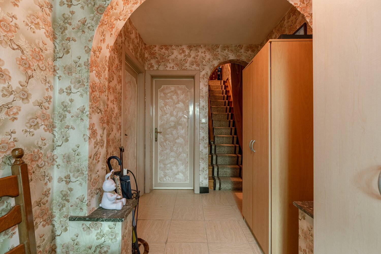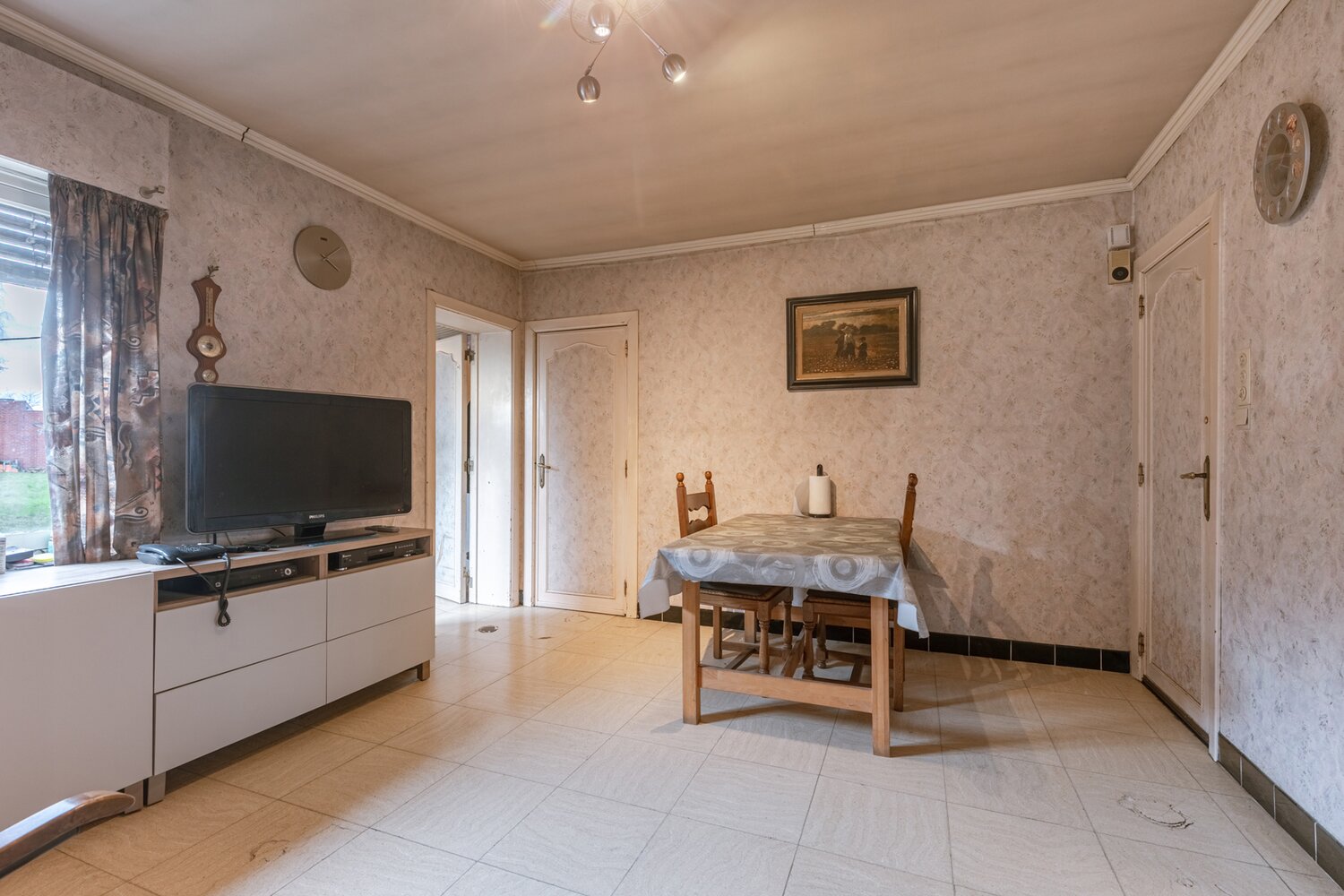 Au rez-de-chaussée, la maison dispose d'un double salon qui offre un espace de vie agréable avec différentes possibilités d'aménagement. La cuisine et un débarras supplémentaire se trouvent à proximité, ce qui contribue au confort quotidien et à l'organisation pratique de la maison.