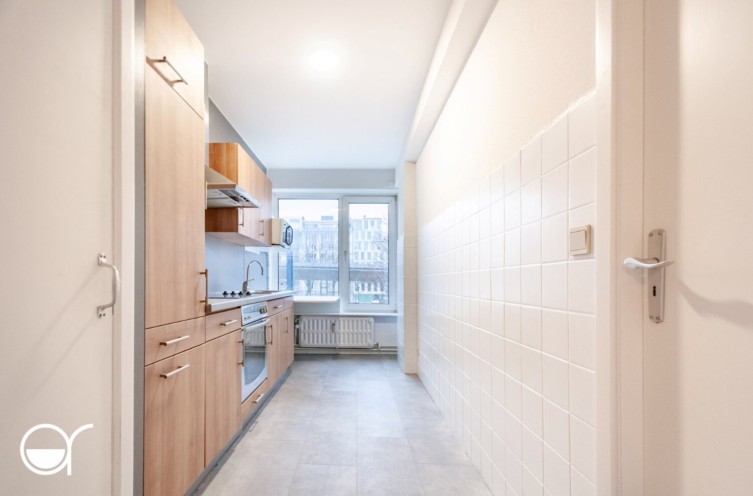 Via de inkomhal betreedt u via een charmante tussendeur de ruime woonkamer met aangename lichtinval. Aansluitend bevindt zich de geïnstalleerde keuken, uitgerust met een koelkast, elektrische kookplaat, oven, dampkap, spoelbak en microgolfoven.