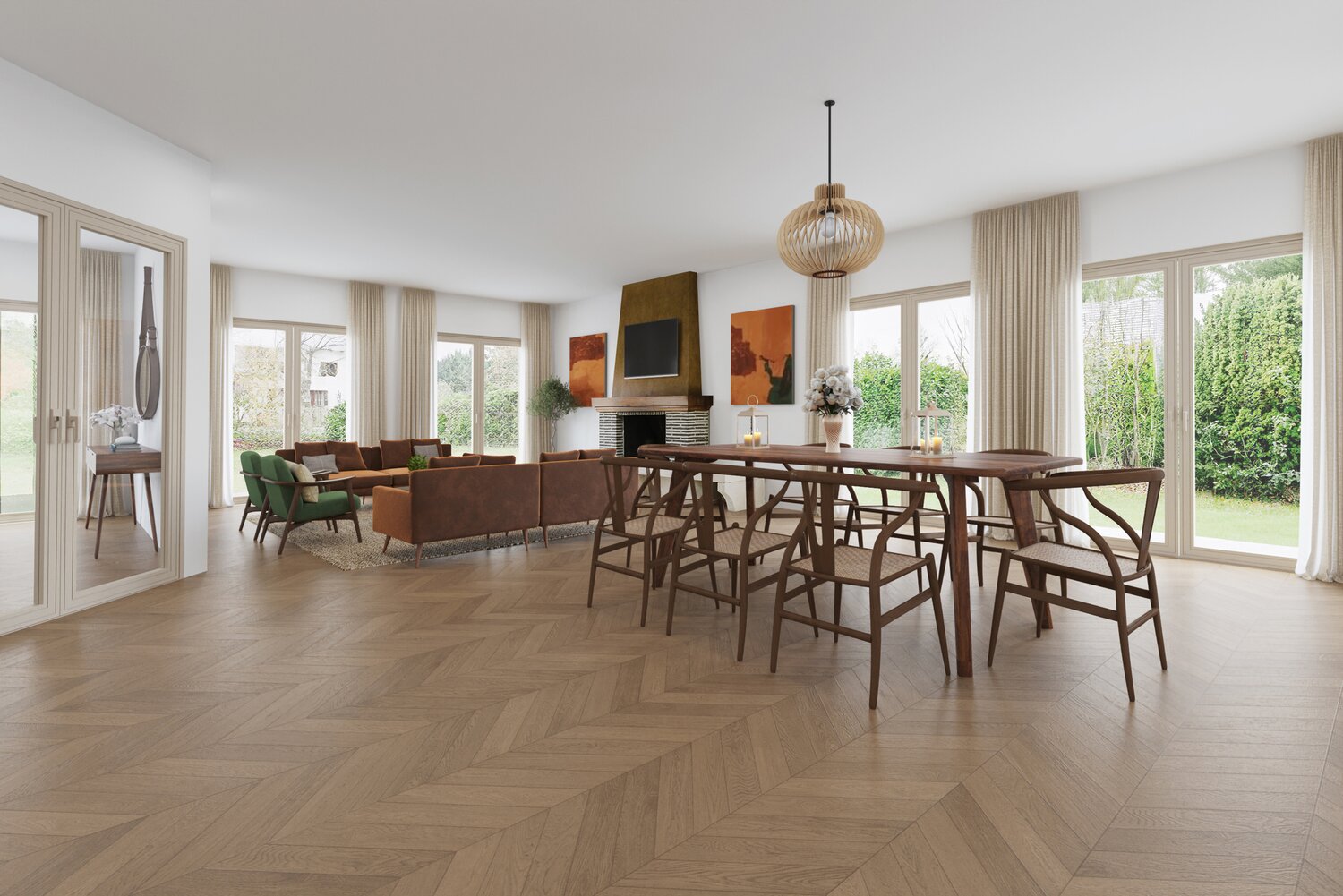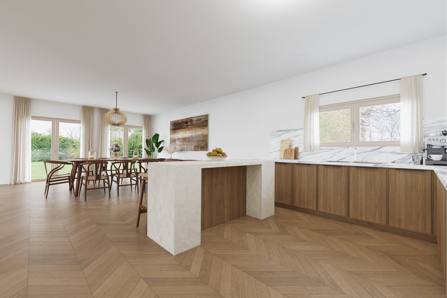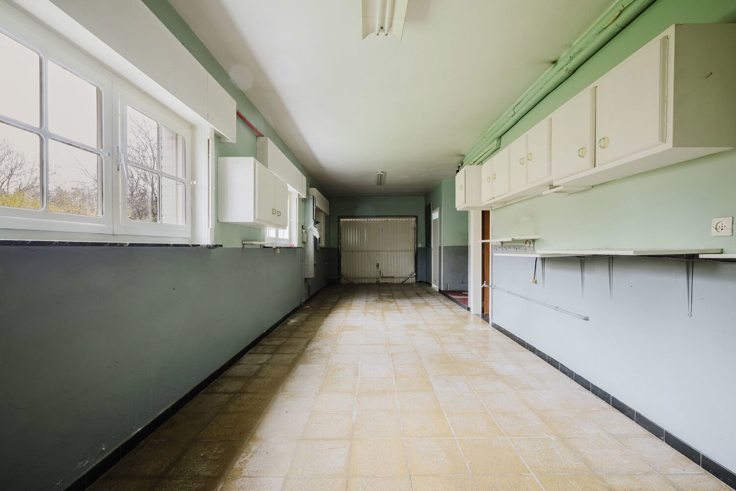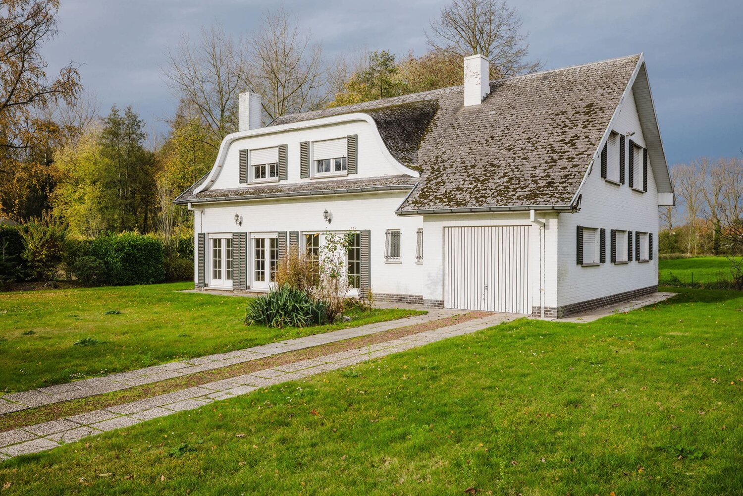 De woning beschikt over een dubbele garage en een ruime oprit met plaats voor meerdere wagens. Binnenkomen gebeurt via een royale inkomhal die toegang biedt tot de zeer ruime en lichtrijke leefruimte met zicht op de tuin. De keuken, bereikbaar via inkomhal en leefruimte, geniet eveneens van een groen uitzicht. Verder zijn er op het gelijkvloers twee toiletten, een koele berging. Vanuit de tuin hebt u een wijds zicht op natuur.
