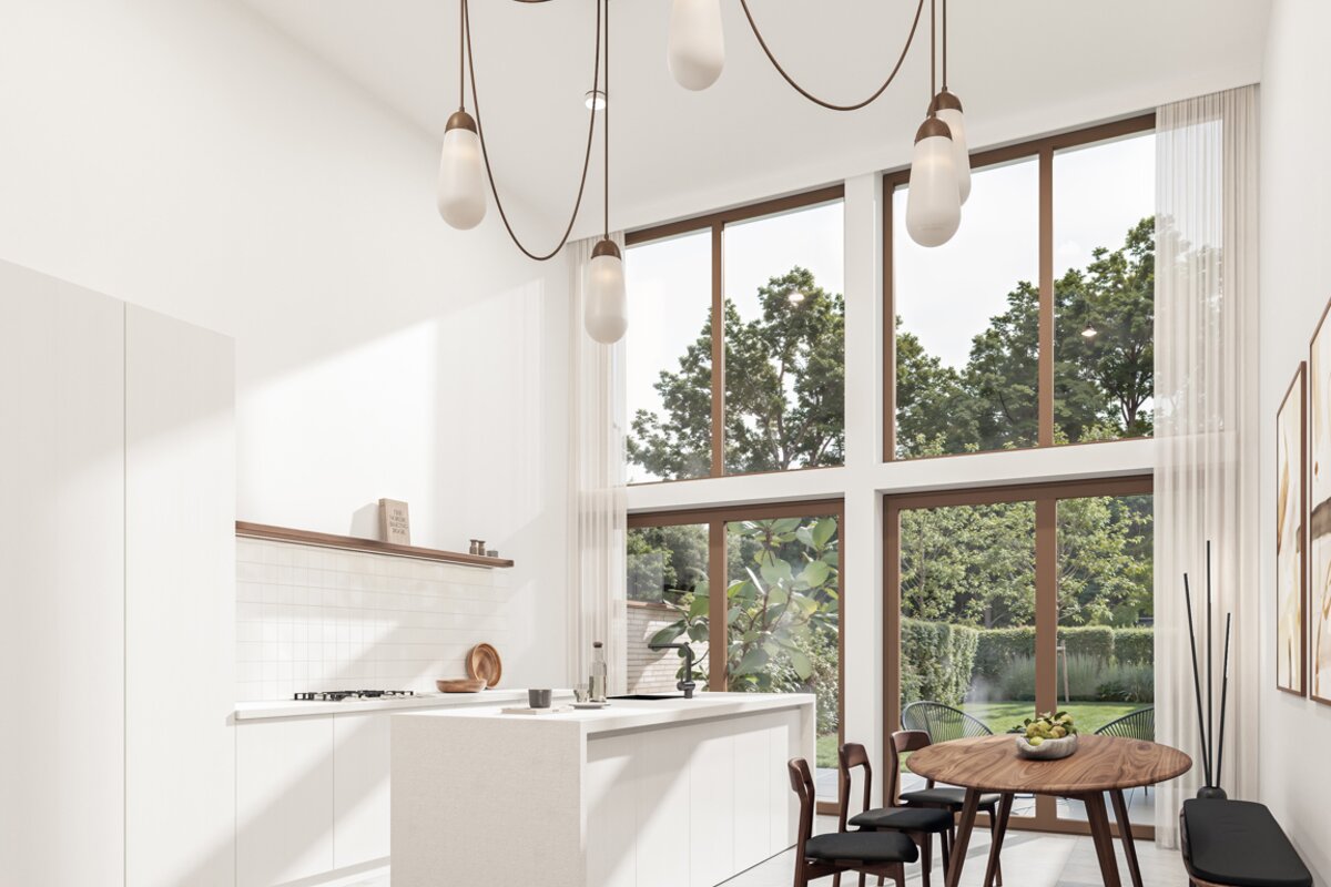 Au rez-de-chaussée se trouve une cuisine ouverte et lumineuse avec une grande baie vitrée à l'arrière, qui donne sur la terrasse et le jardin privé. Depuis la cuisine, un escalier en béton mène au salon spacieux situé à l'étage intermédiaire.