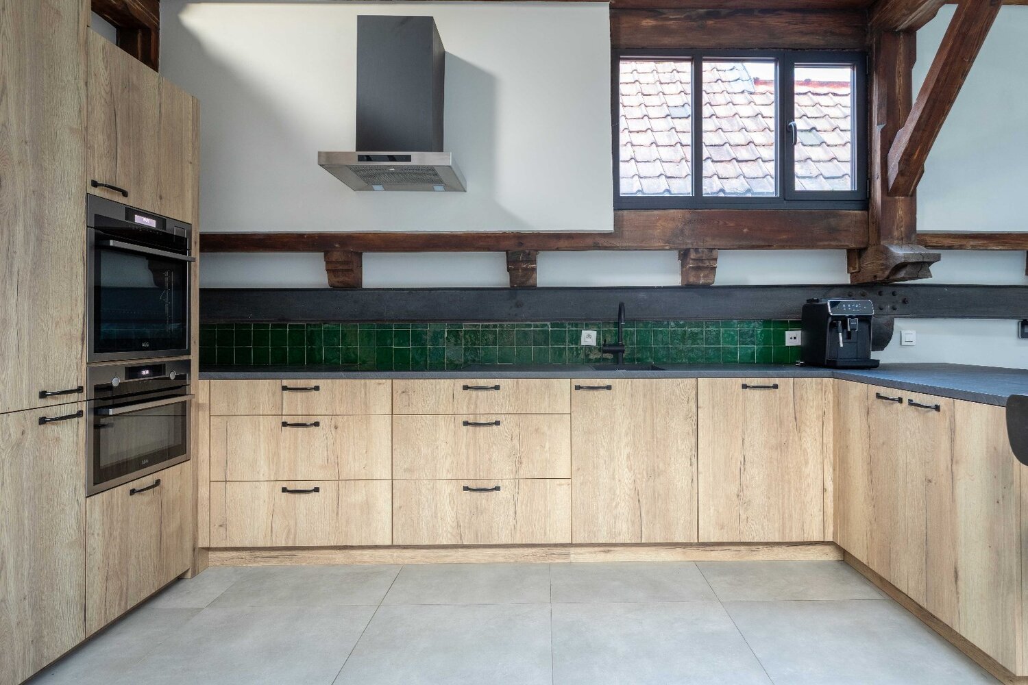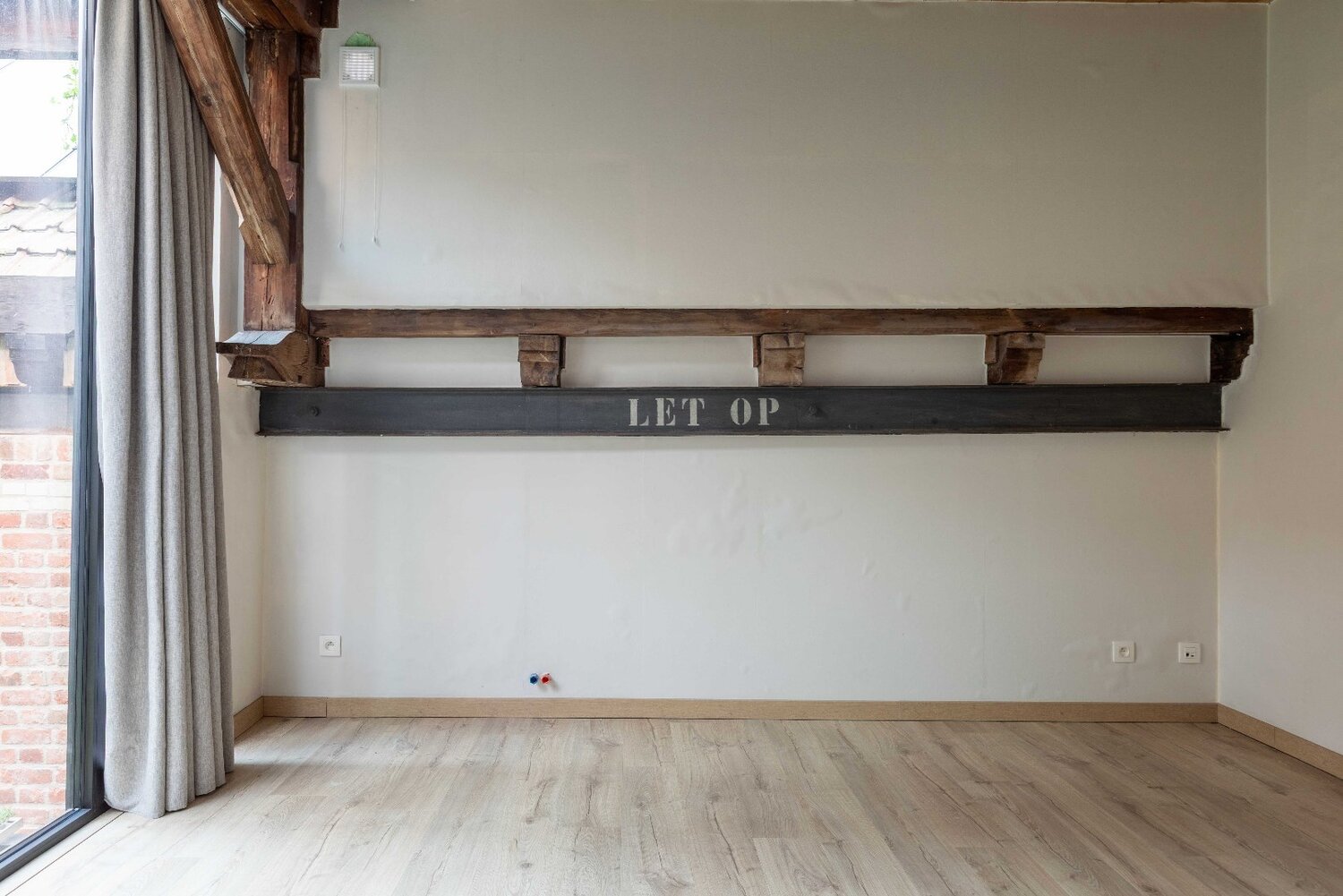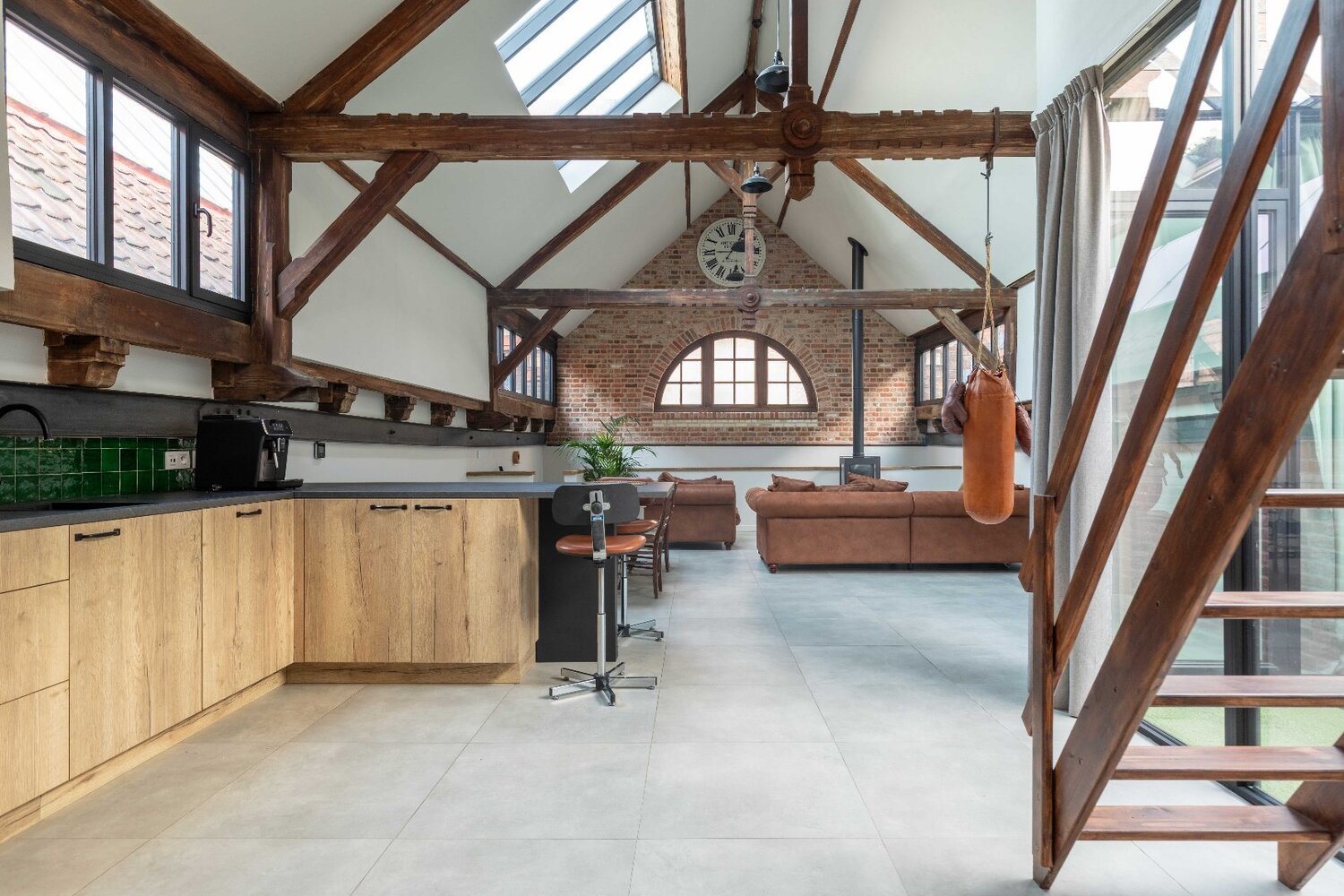 Hier werd ook alles grondig vernieuwd en werden de karaktervolle elementen zoals het dakgebinte bewaard, prachtig!