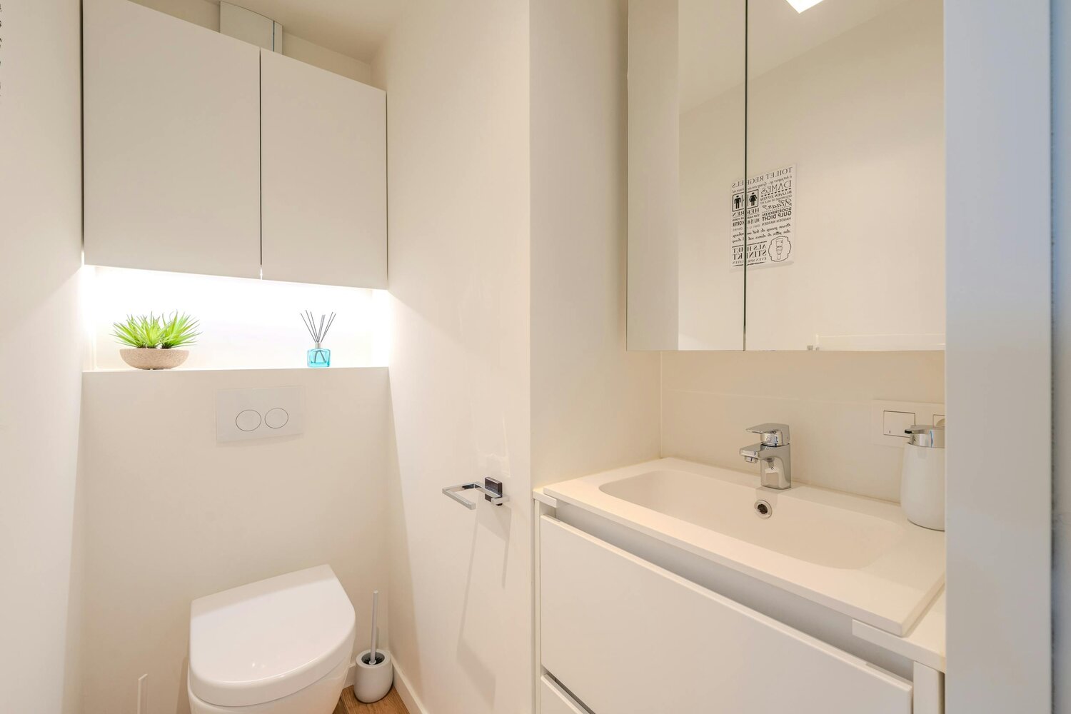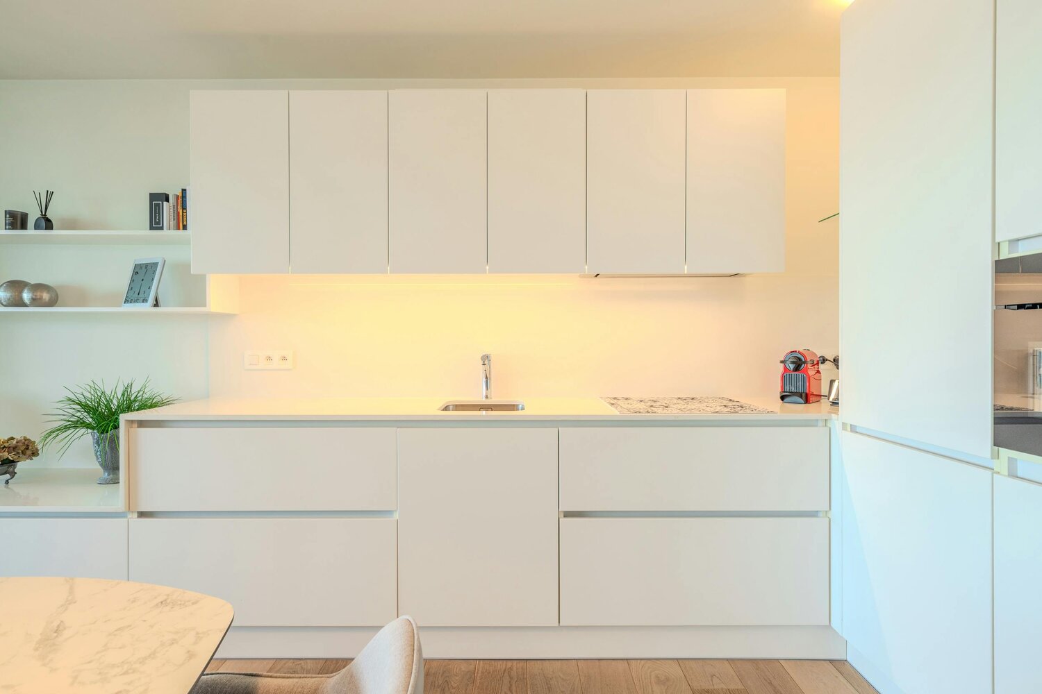 Le salon est recouvert d'un parquet chaleureux en chêne français. La cuisine moderne s'intègre parfaitement et est équipée d'un plan de travail en composite et de nombreux rangements. Tous les appareils sont de qualité supérieure, y compris un four à micro-ondes, un réfrigérateur et un lave-vaisselle, tous de la marque Miele. L'appartement dispose également de toilettes séparées avec lavabo et d'un débarras.