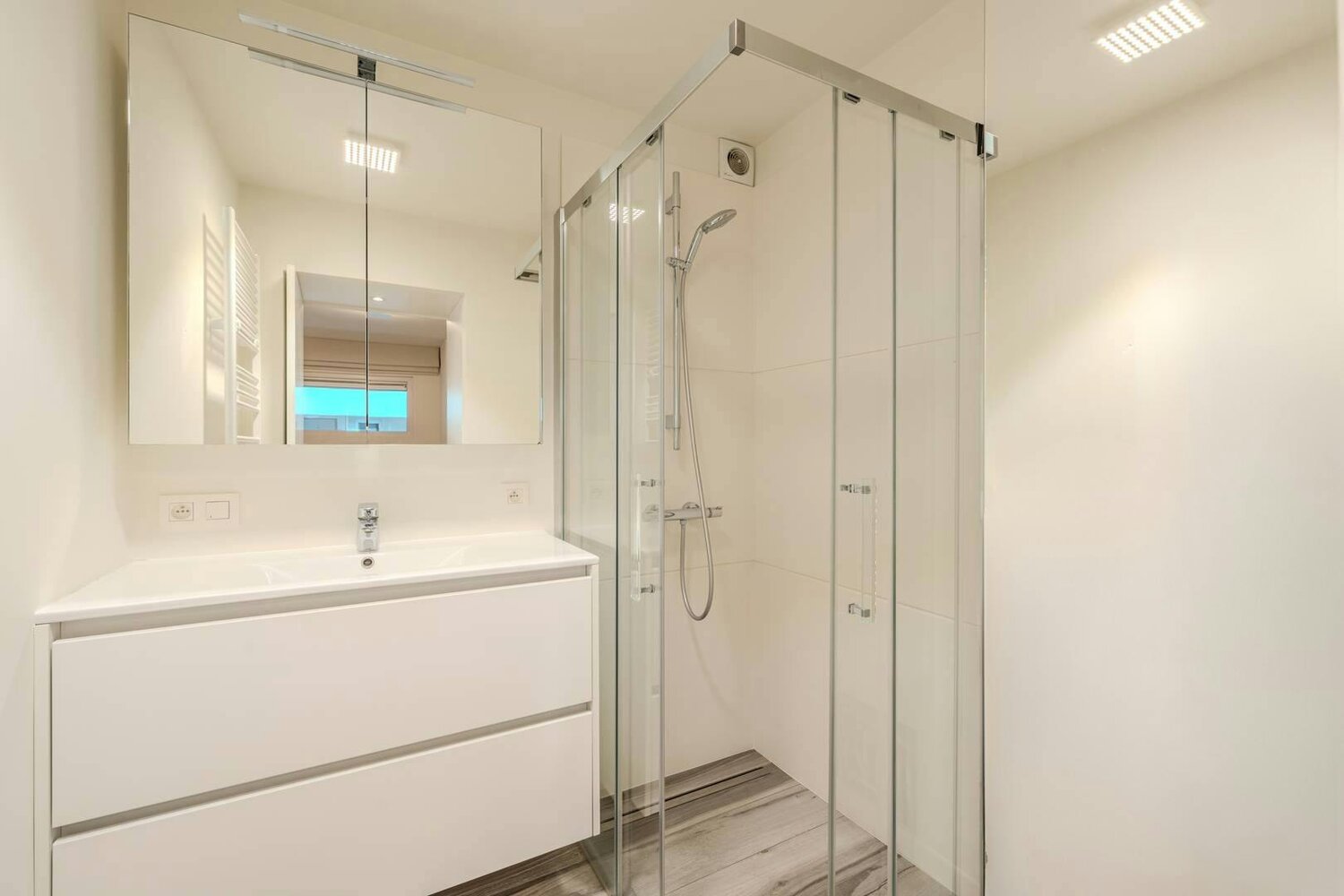 La chambre est spacieuse et équipée de placards pratiques et fabriqués sur mesure. À côté se trouve la salle de bain meublée avec lavabo, douche et armoire à glace.