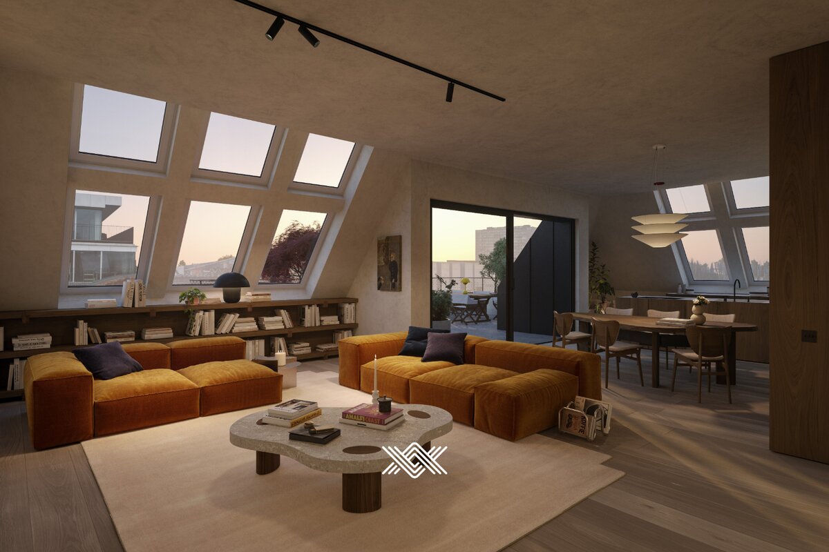 Deze riante penthouse van 188 m² beschikt over een lichtrijke leefruimte met toegang tot het zonneterras van 35 m² met een uitzonderlijk uitzicht op de Gentse Skyline en de nieuwe parktuin. De leefruimte is voorzien van een open keuken met kookeiland, 2 praktische bergingen en een bureauruimte.