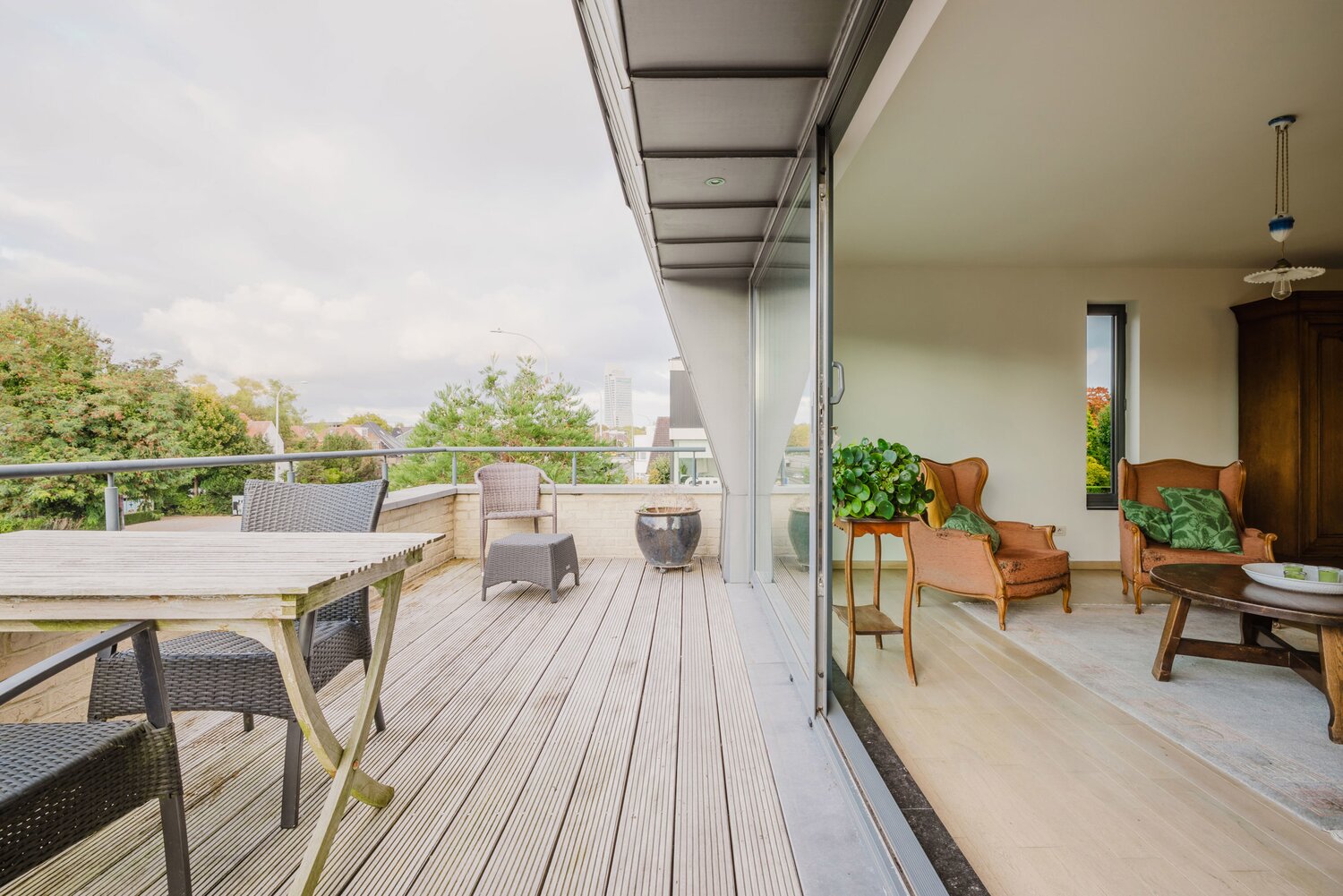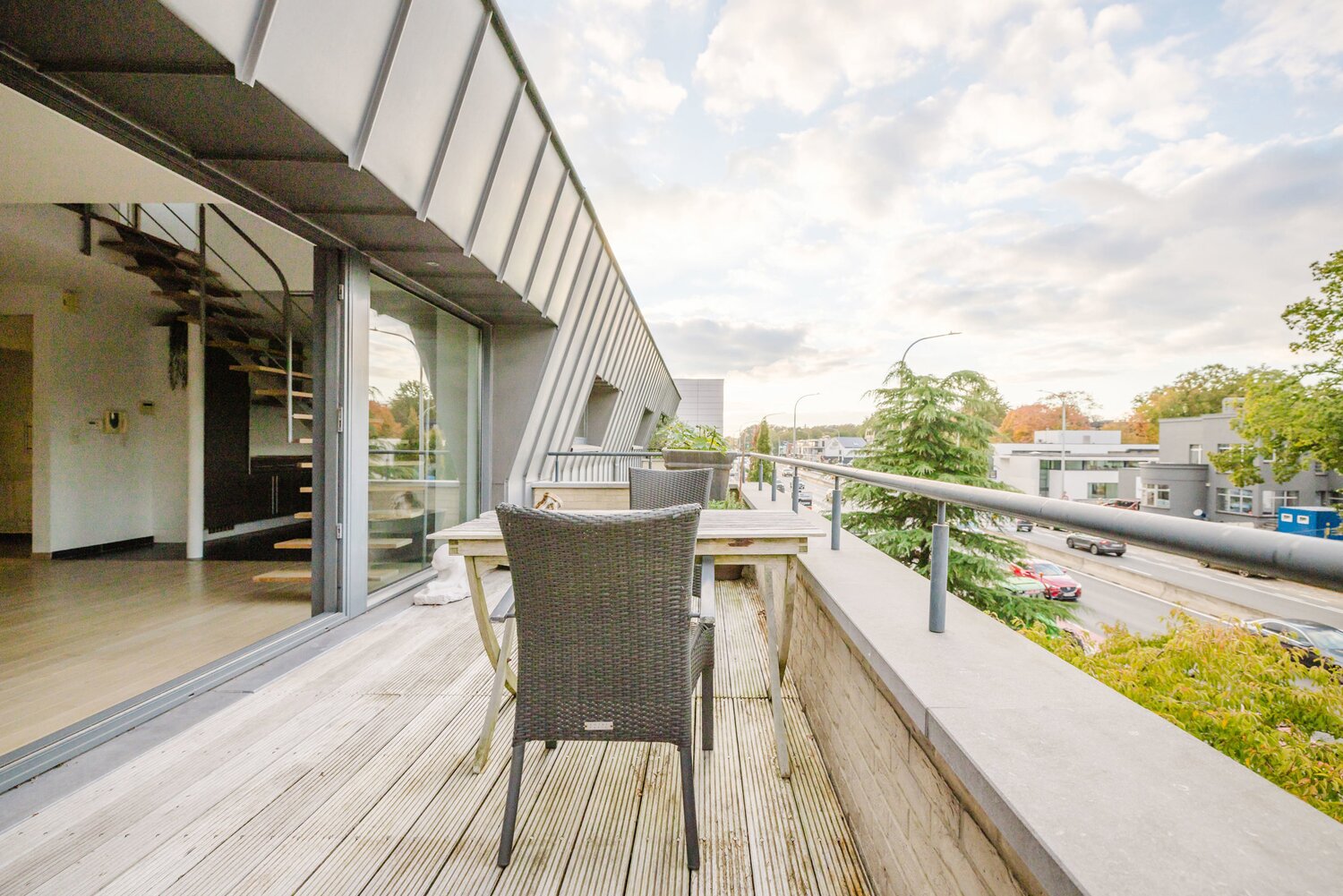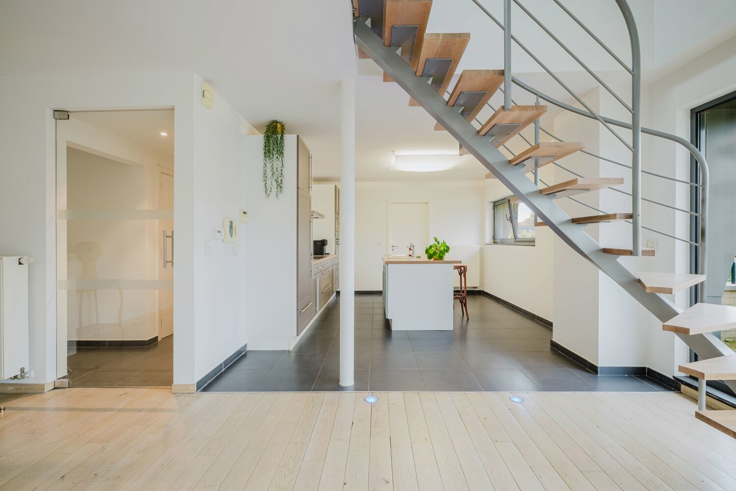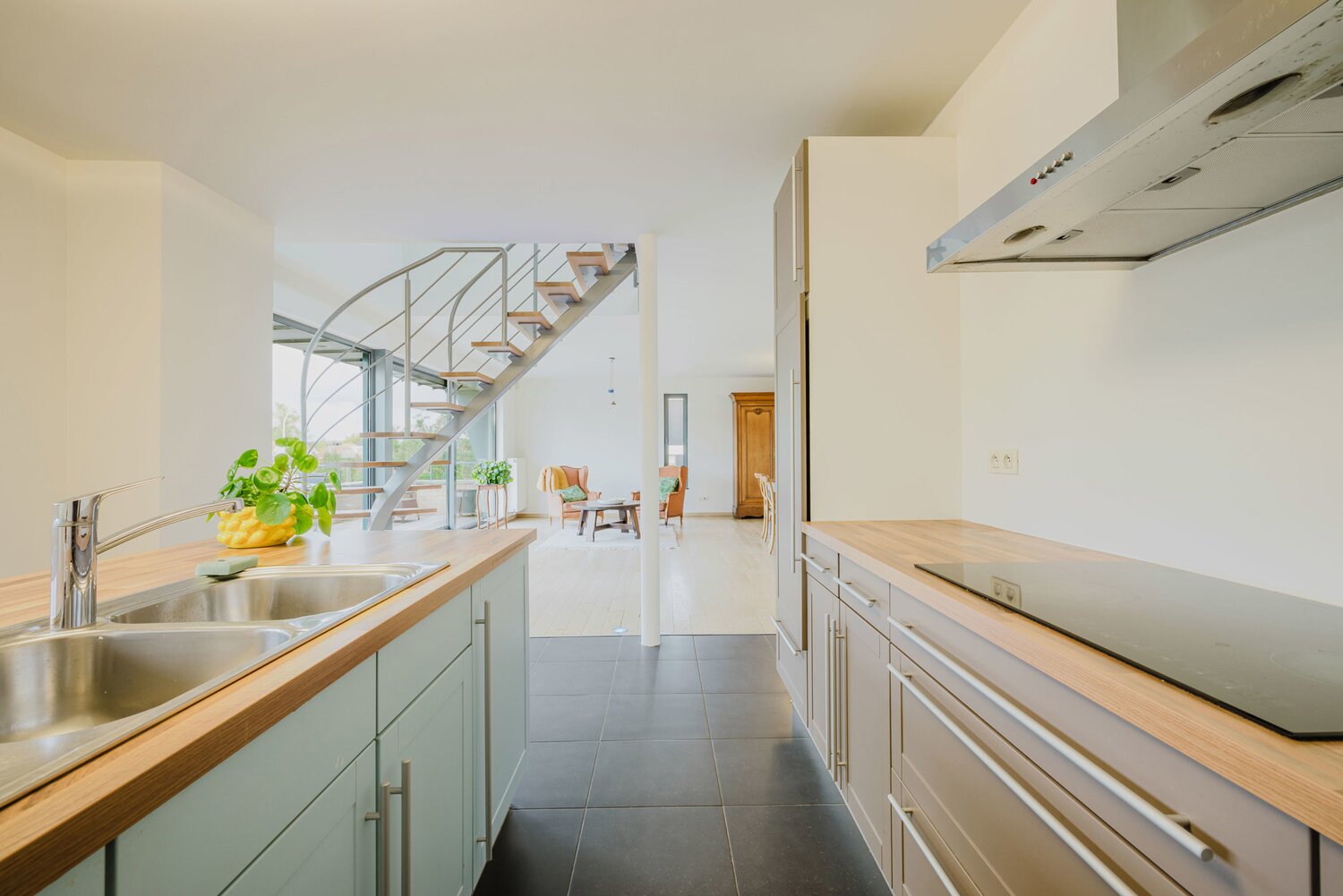En entrant dans cet appartement en duplex, on remarque immédiatement la surface habitable généreuse de pas moins de 150 m². Le grand espace de vie ouvert offre un accès direct à la terrasse de 20 m². La cuisine équipée forme un tout avec l'espace de vie. À côté se trouve un débarras.