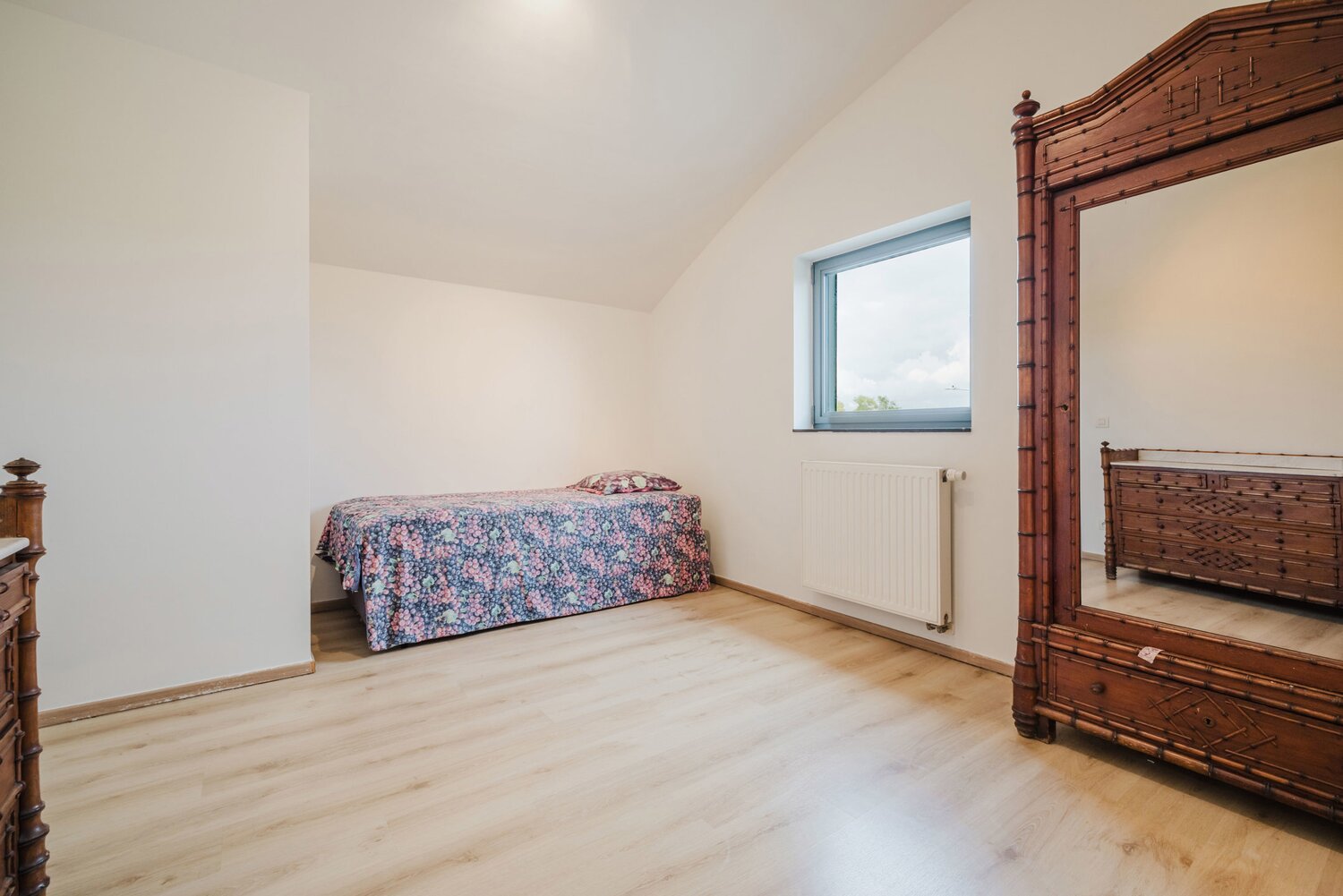 Un escalier ouvert mène au deuxième étage, où se trouvent deux chambres à coucher spacieuses. La chambre principale dispose d'une salle de bains attenante et d'une salle de douche. Entre les deux chambres se trouve un espace ouvert multifonctionnel.