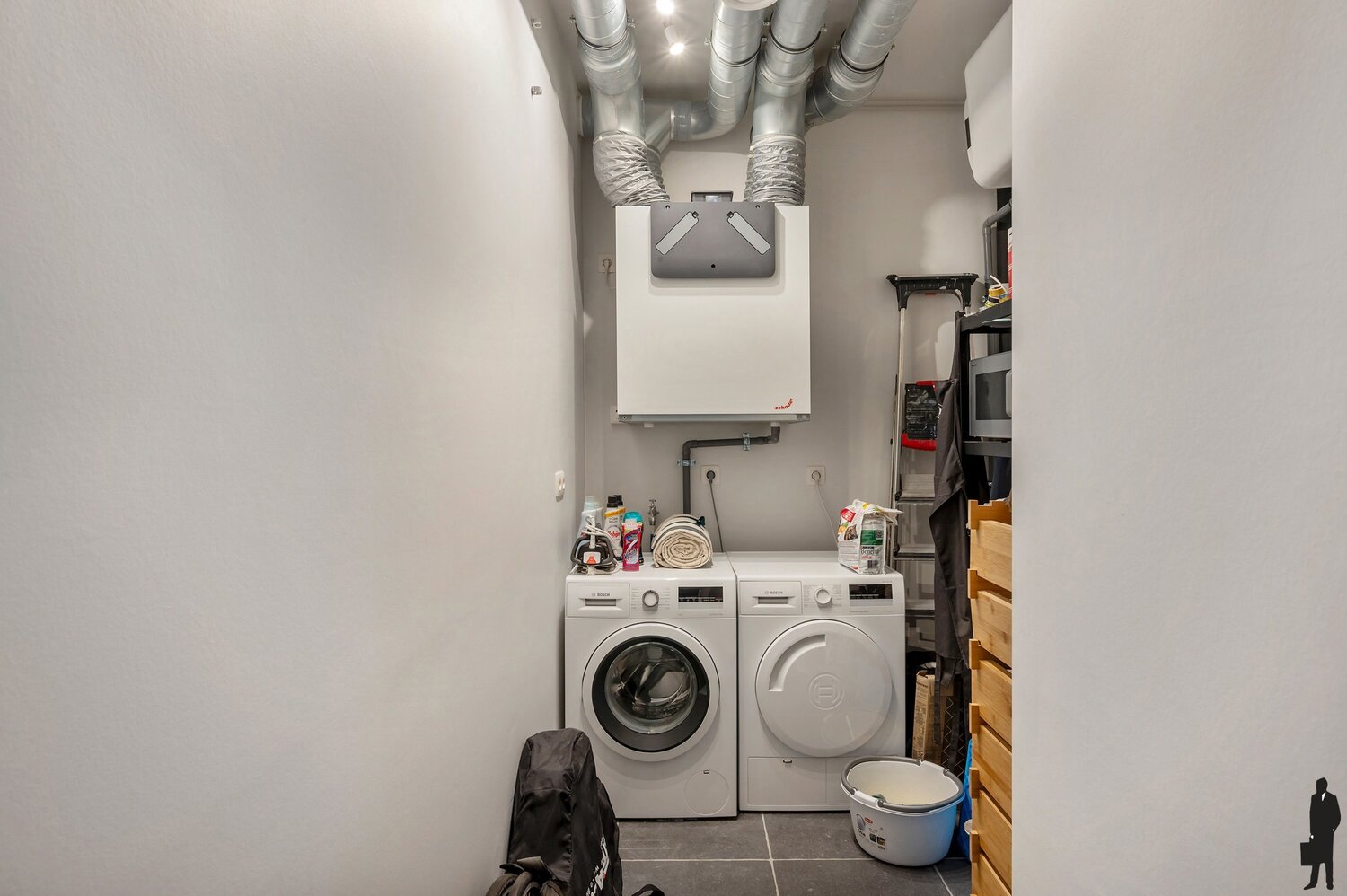 - Praktische technische berging met ventilatiesysteem en aansluiting wasmachine en droogkast