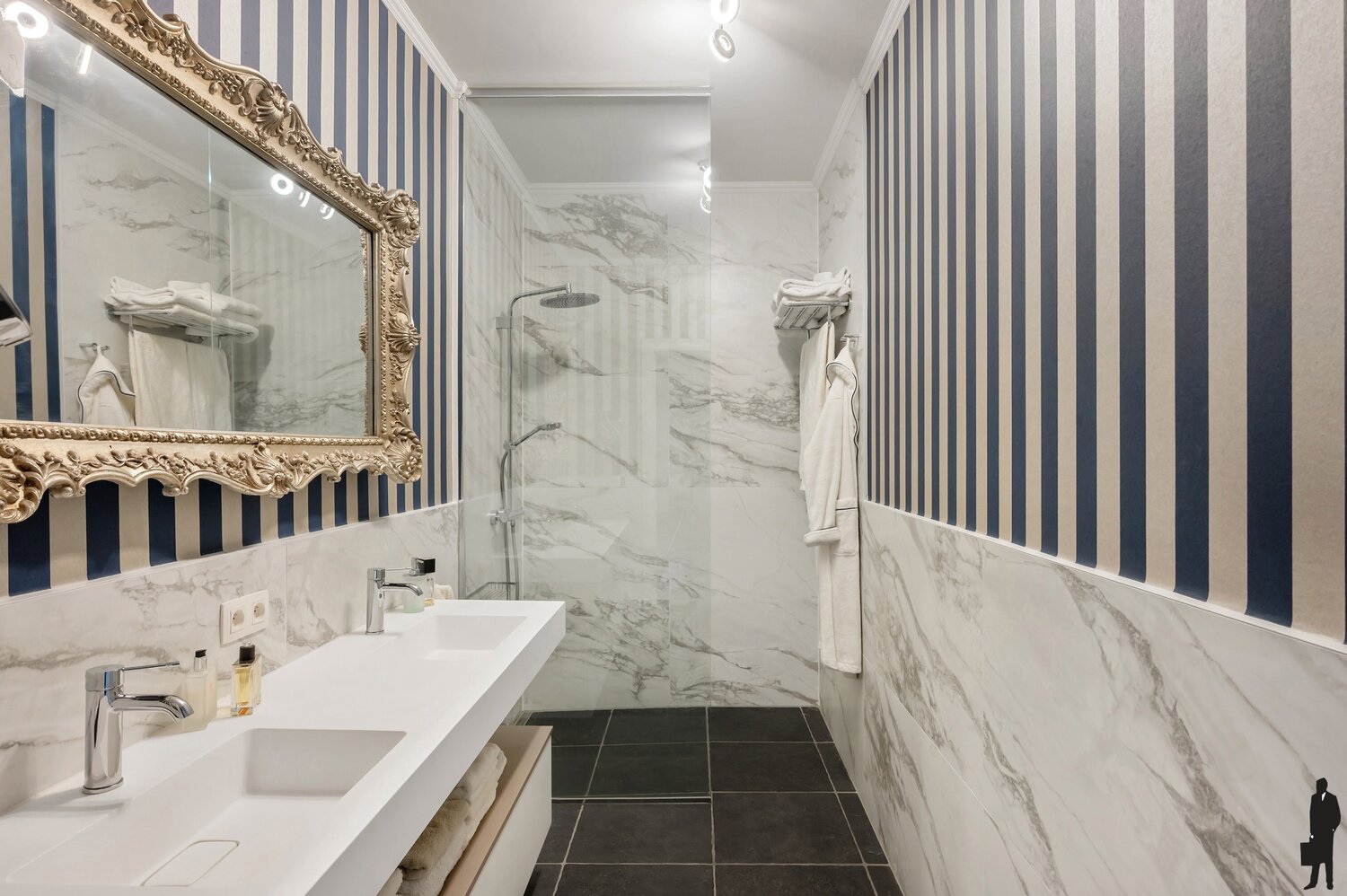 - Verzorgde badkamer met ruime inloopdouche, dubbele lavabo met meubel