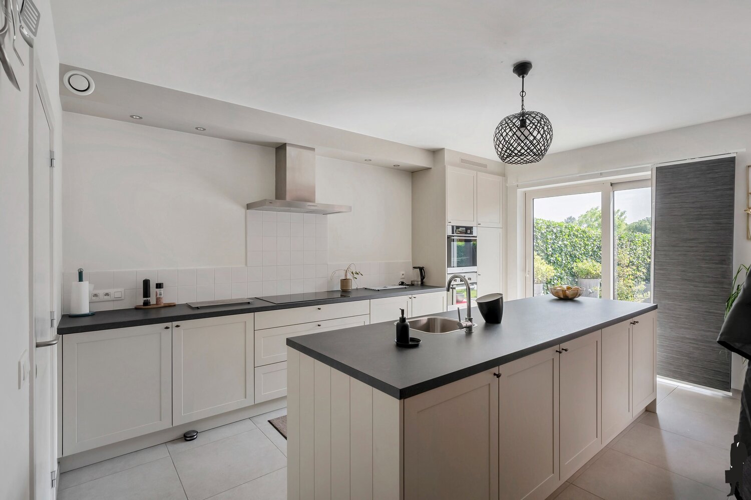 - Een open keuken met centraal eiland, volledig uitgerust met inductiekookplaat, ingebouwde heteluchtoven, koelkast, vaatwasser en gootsteen, eveneens met schuifraam naar het terras