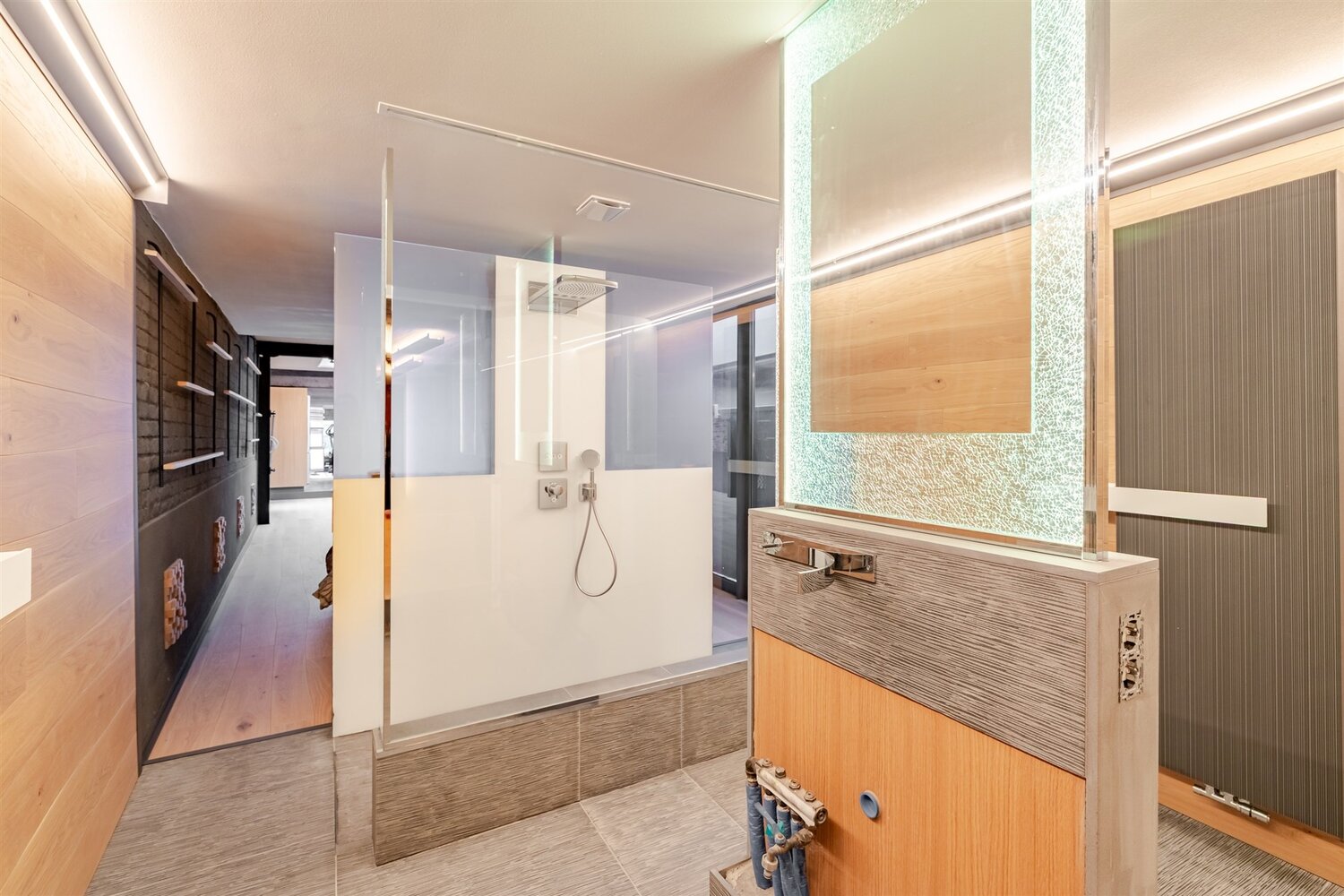 Rechtdoor betreed je de hoofdwoning, een indrukwekkende loft die dankzij de open structuur wordt gekenmerkt door royale volumes, warme parketvloeren en een hoogwaardige afwerking. De leefruimte biedt talloze mogelijkheden voor indeling en vormt het hart van de woning. Rechts bevindt zich een eerste badkamer, terwijl links een open kamer aansluit die perfect dienstdoet als slaapruimte of private zone. Verderop ligt een tweede, luxueus ingerichte badkamer met een open douche, ruimte voor dubbele wastafels en een achterliggende kamer die kan functioneren als dressing of wellnessruimte.