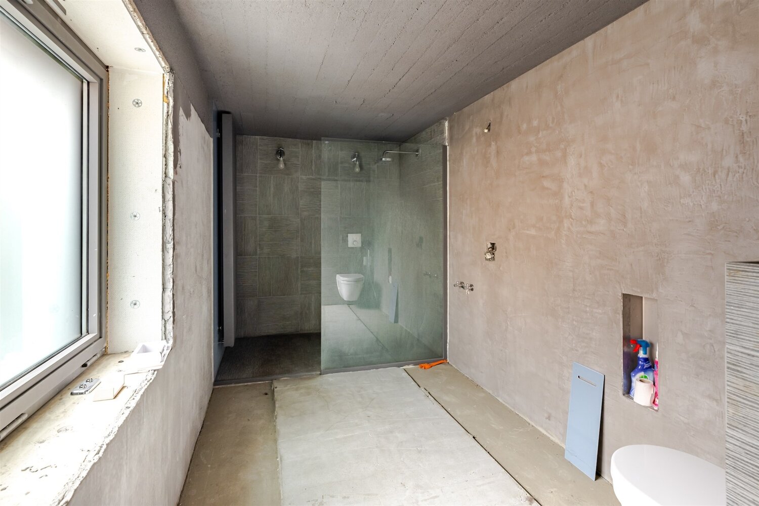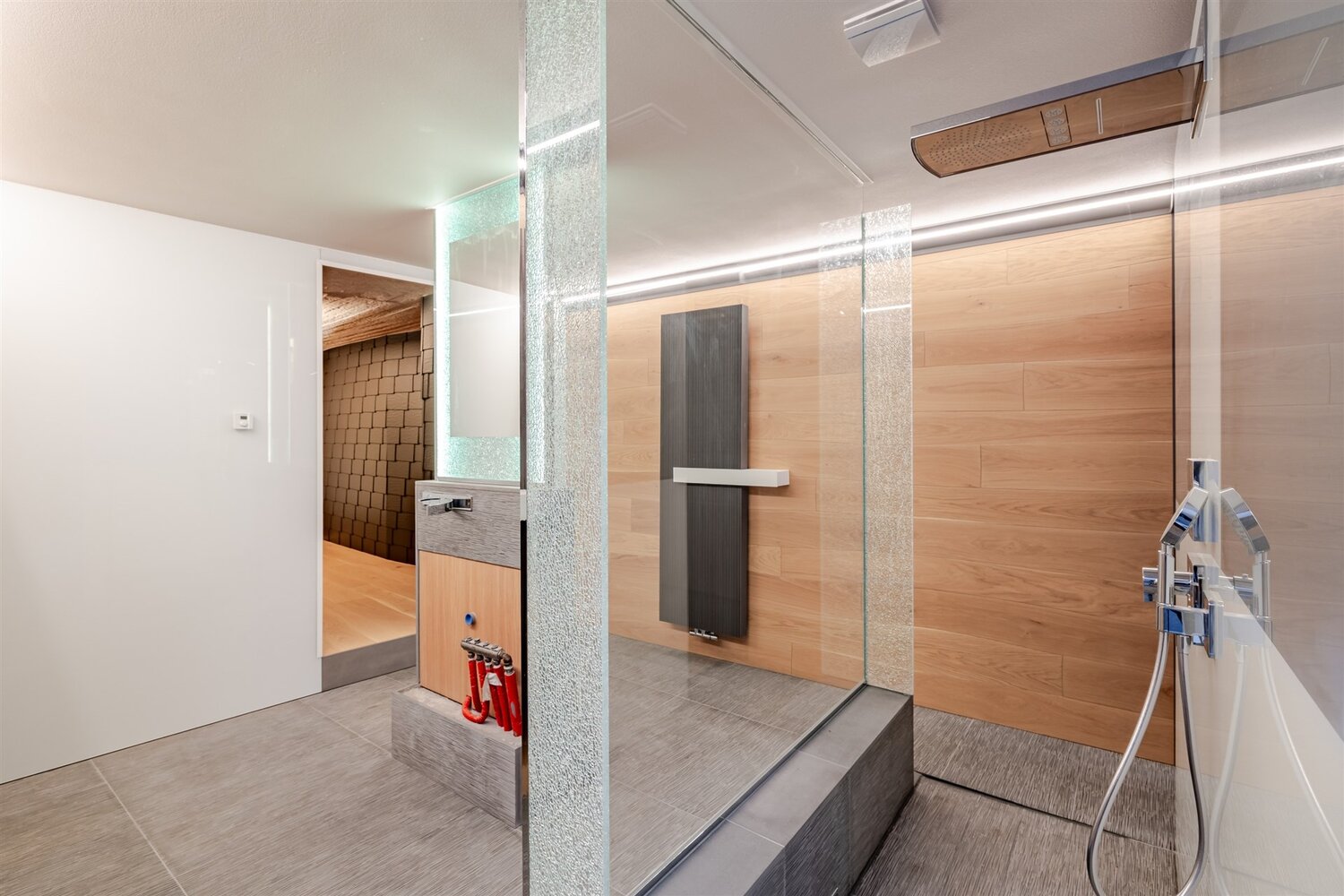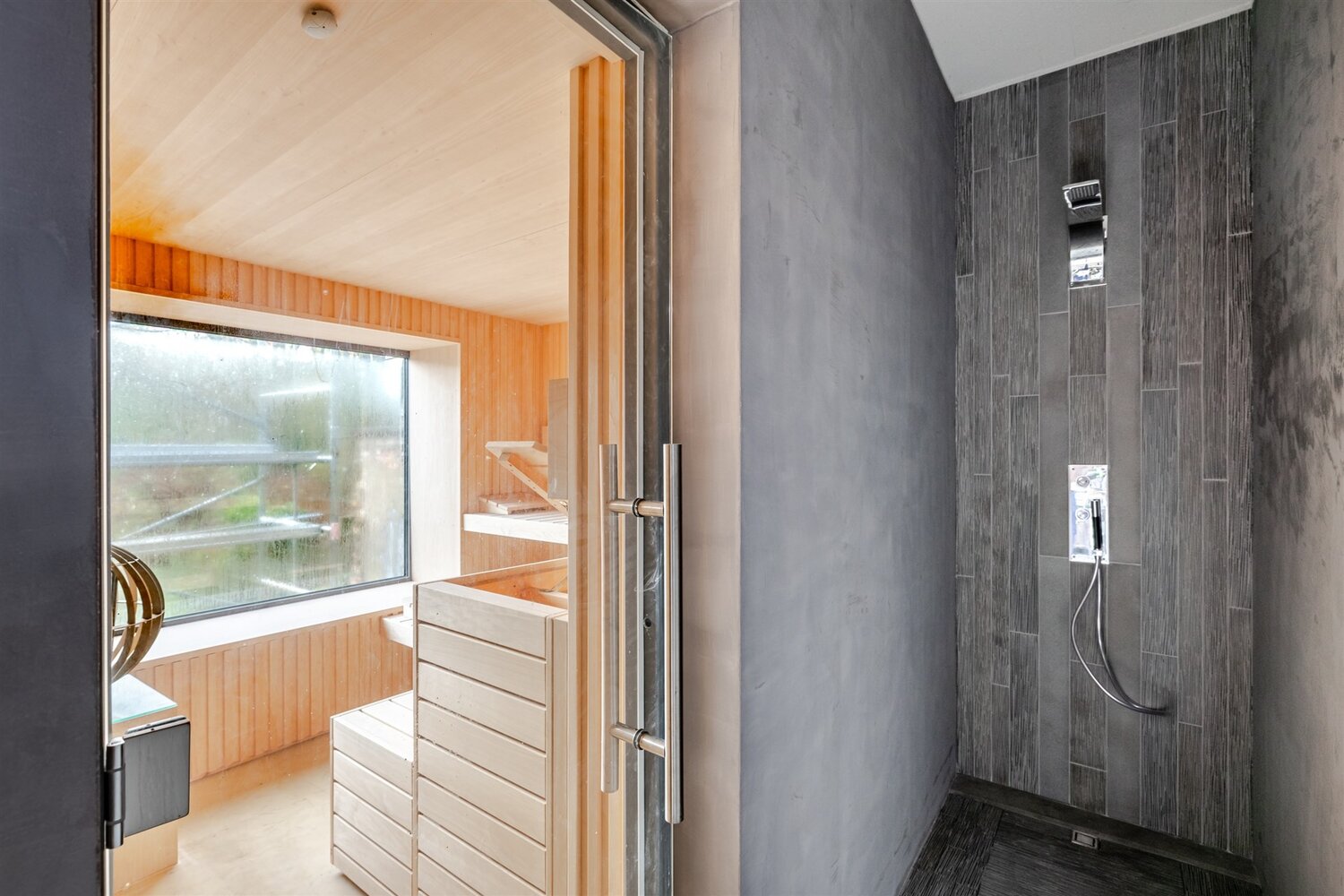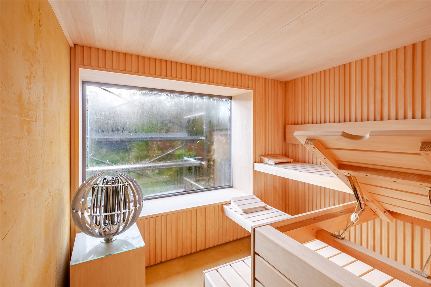 In de centrale leefruimte vormt de volledig ingebouwde keuken met keukeneiland een mooi geheel met de eet- en zithoek. De keuken is uitgerust met twee koelkasten, een ingebouwde Bosch-oven en talrijke opbergmogelijkheden, wat zorgt voor comfort en functionaliteit. Achteraan biedt een groot schuifraam uitzicht op de tuin en toegang tot een overdekte veranda die kan worden gebruikt als atelier, hobbyruimte of thuiskantoor. Aansluitend bevindt zich een afzonderlijke wellnessruimte met inloopdouche en sauna die uitkijkt op het groen.