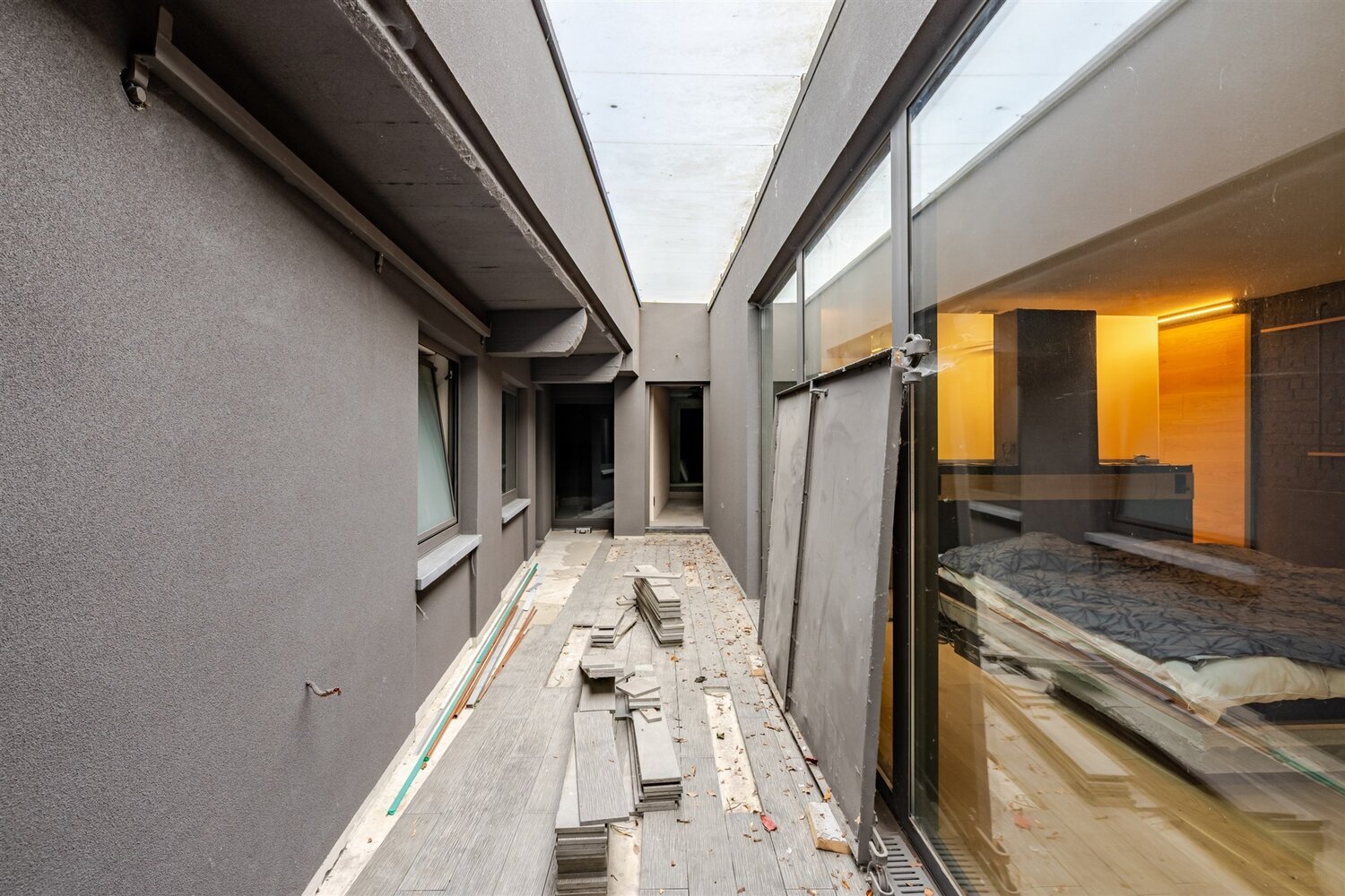Bij binnenkomst loop je door een eerste gemeenschappelijke hal die via een trap leidt naar een tweede gedeelde ruimte waar de technische installatie en een aparte berging zich bevinden. Van hieruit kom je bij een private deur die toegang geeft tot een overdekte buitenhal, een verbindende zone tussen de verschillende delen van de woning. Aan de rechterzijde bevindt zich een aparte studio met eigen badkamer, ideaal als gastenverblijf, praktijkruimte of unit voor verhuur.