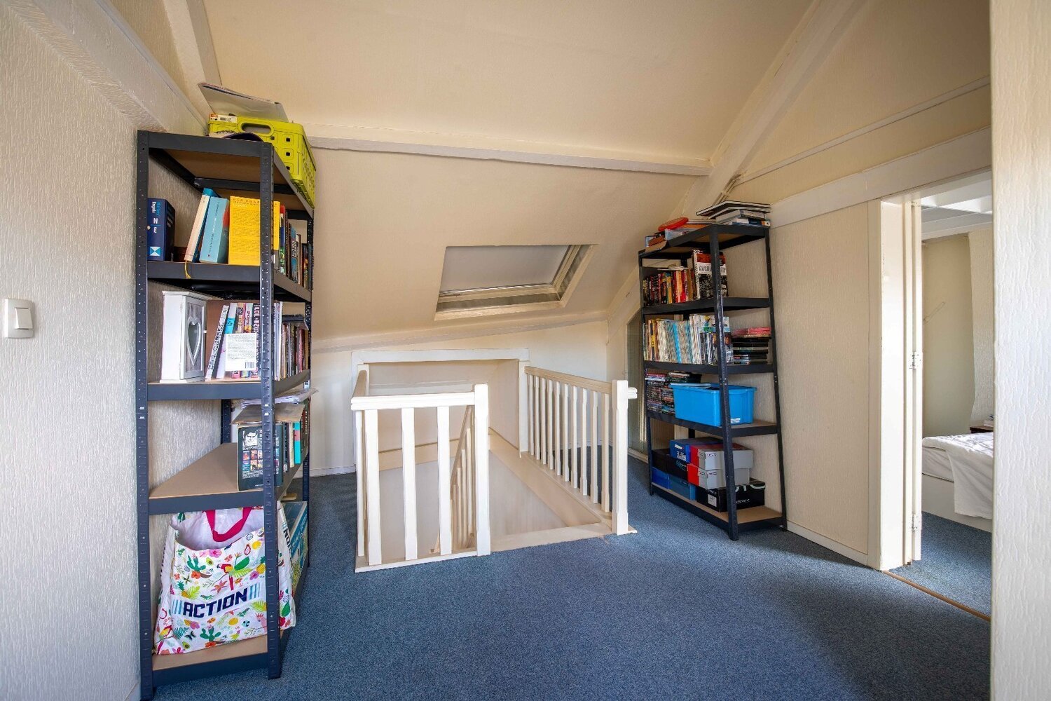 Het duplex appartement heeft een aparte praktische inkom met plaats voor bv. fietsen. Op de eerste verdieping kom je in een aangename leefruimte met open keuken en heel veel lichtinval, een badkamer, toilet en een ruime kamer die als bergruimte, bureau, hobbykamer of 3e slaapkamer kan dienen.