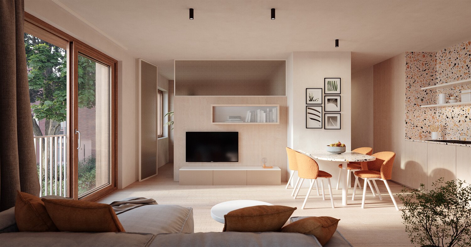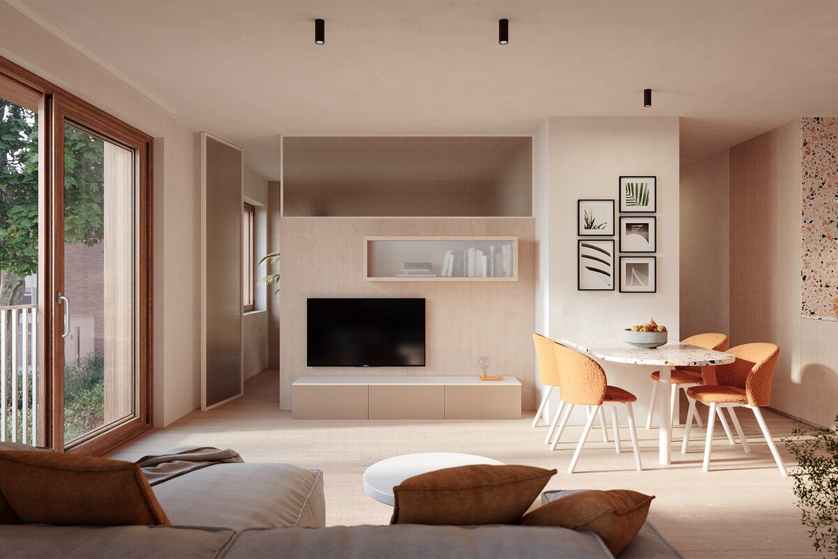 Hier woon je in het ritme van de seizoenen, met zicht op groen en het bruisende Mechelen vlakbij. De site ademt rust, maar leeft van verbondenheid. Het hart van het project vormt een weelderig binnengebied, ontworpen door landschapsarchitect Ars Horti. Oude lindes en een majestueuze tamme kastanjeboom blijven bewaard, een es krijgt een nieuwe plek. Samen creëren ze een natuurlijke luwte waar trage paden, speelplekken en ontmoetingsmomenten elkaar kruisen. Onder die kruinen vind je stijlvolle woningen en appartementen die met oog voor detail en duurzaamheid zijn ontworpen door dmvA architecten.