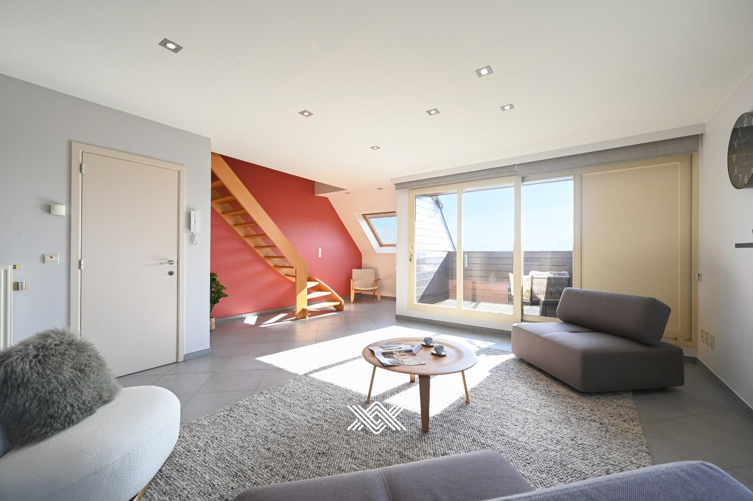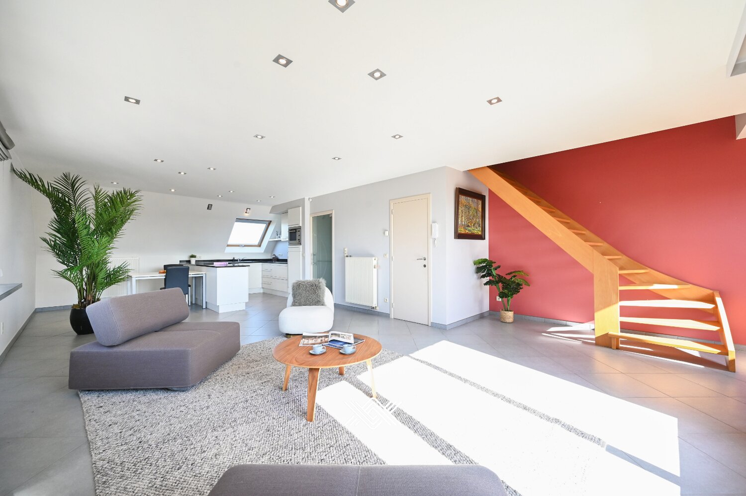 Bij binnenkomst kom je in een ruime hal die leidt naar een open en lichte leefruimte, die door grote raampartijen badend in natuurlijk licht wordt ondergedompeld. Aangrenzend ligt een zuidgericht terras, ideaal om de hele dag door van de zon te genieten. De open keuken is volledig uitgerust met moderne toestellen, wat koken tot een aangename ervaring maakt.