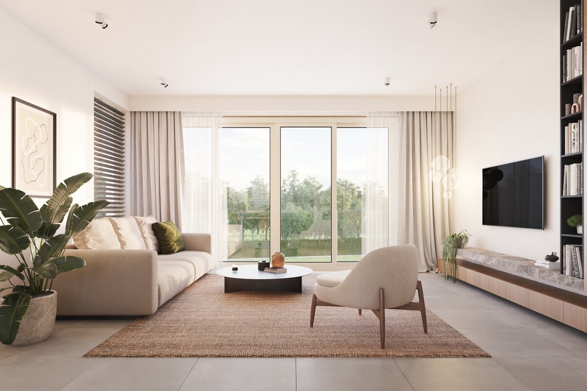 Ou vous pouvez opter pour les appartements bel-étage : vous entrez par le hall d’entrée, qui donne accès au garage, à un bureau et à l’escalier menant au 1er étage. A cet étage, vous trouverez le salon lumineux avec cuisine ouverte, qui donne sur le magnifique jardin. À côté de la cuisine, vous trouverez un débarras pratique et des toilettes. Au 2ème étage, les appartements disposent de 3 chambres et d’une salle de bain avec baignoire et douche à l’italienne.