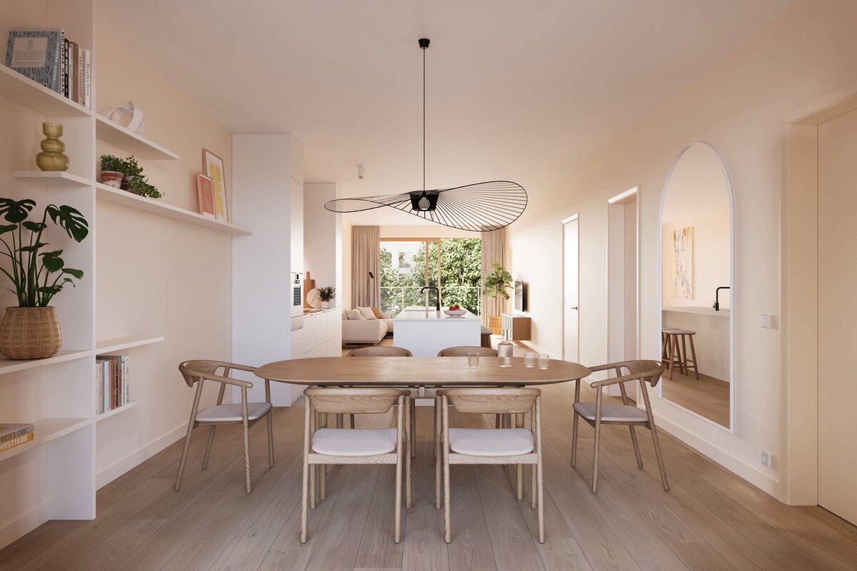 De tijdloze architectuur – met duurzame baksteen en elegante aluminium ramen – sluit naadloos aan bij de omgeving. Alle appartementen beschikken over een hoogwaardige afwerking, volledig uitgeruste keukens en badkamer(s), en een doordachte indeling met maximale privacy.