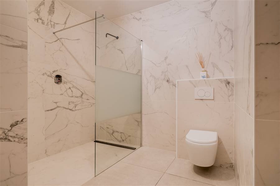 De moderne stijl en hoogwaardige afwerking zal worden doorgetrokken tot in de badkamer. Deze zal volledig ingericht worden met een grote inloopdouche, dubbel lavabomeubel en extra toilet.