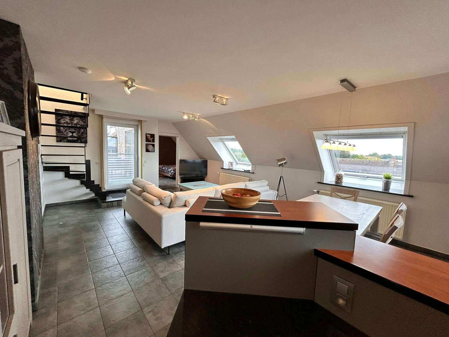 Un avantage supplémentaire est l'espace polyvalent dans la zone duplex, entièrement équipé de lignes électriques. Il peut parfaitement servir de deuxième chambre, de bureau ou de salle de loisirs.