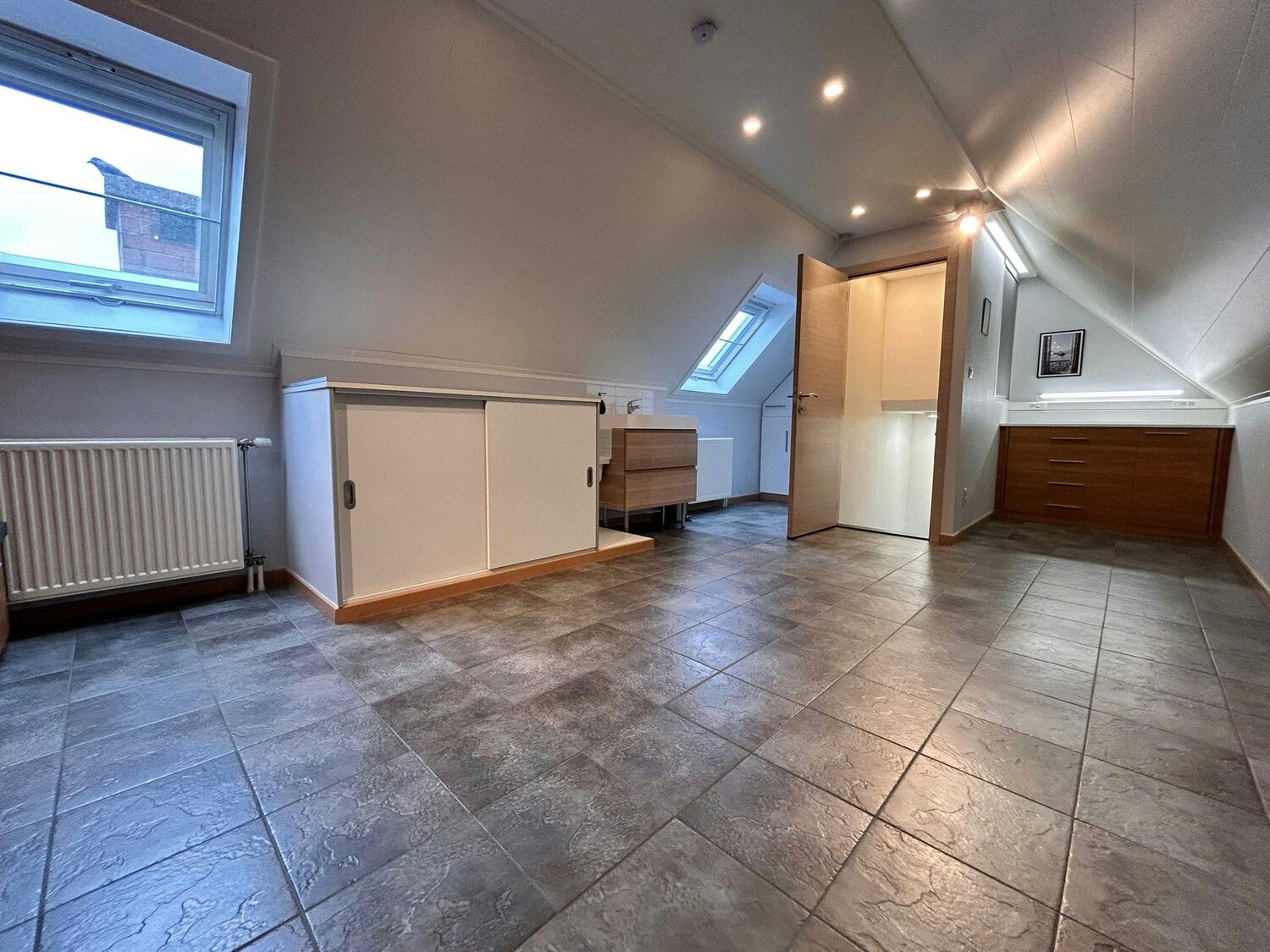 La chambre est équipée de placards intégrés et est adjacente à la salle de bain avec lavabo, douche, baignoire et deuxième toilette.