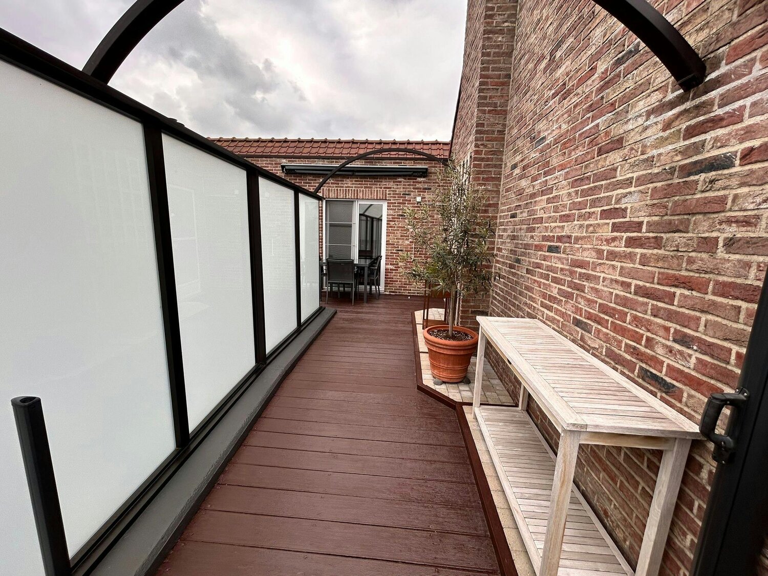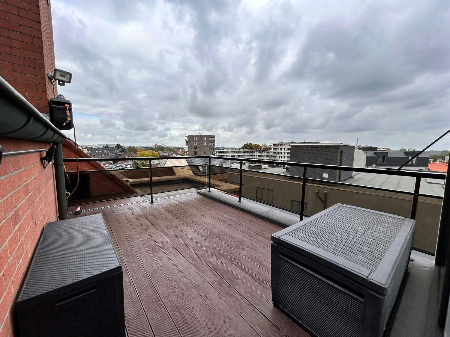 En entrant, vous trouverez un hall d'entrée avec un vestiaire intégré et des toilettes invités avec lavabo. Le salon lumineux avec coin repas et cuisine ouverte constitue le cœur de l'appartement et s'ouvre sur une spacieuse terrasse d'angle qui s'étend sur deux côtés. Parfait pour se détendre ! Ensuite, vous trouverez une salle de rangement/buanderie pratique.