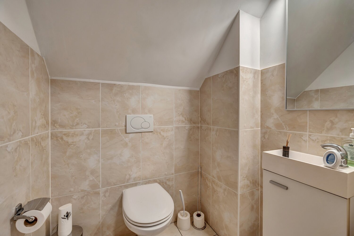 Binnenkomen doe je via de aparte inkomhal met gastentoilet. Vervolgens vind je de ruime, lichtrijke woonkamer met salon en een open, volledig geïnstalleerde keuken met aansluitend een bergruimte/wasplaats.