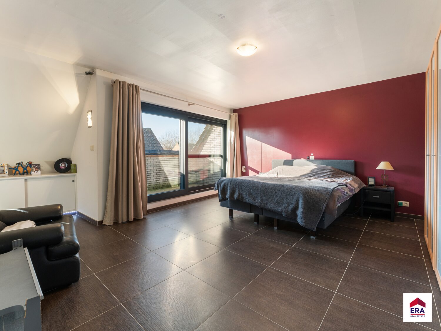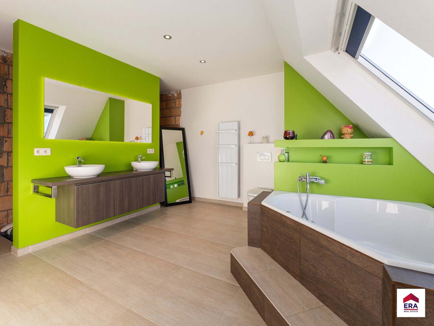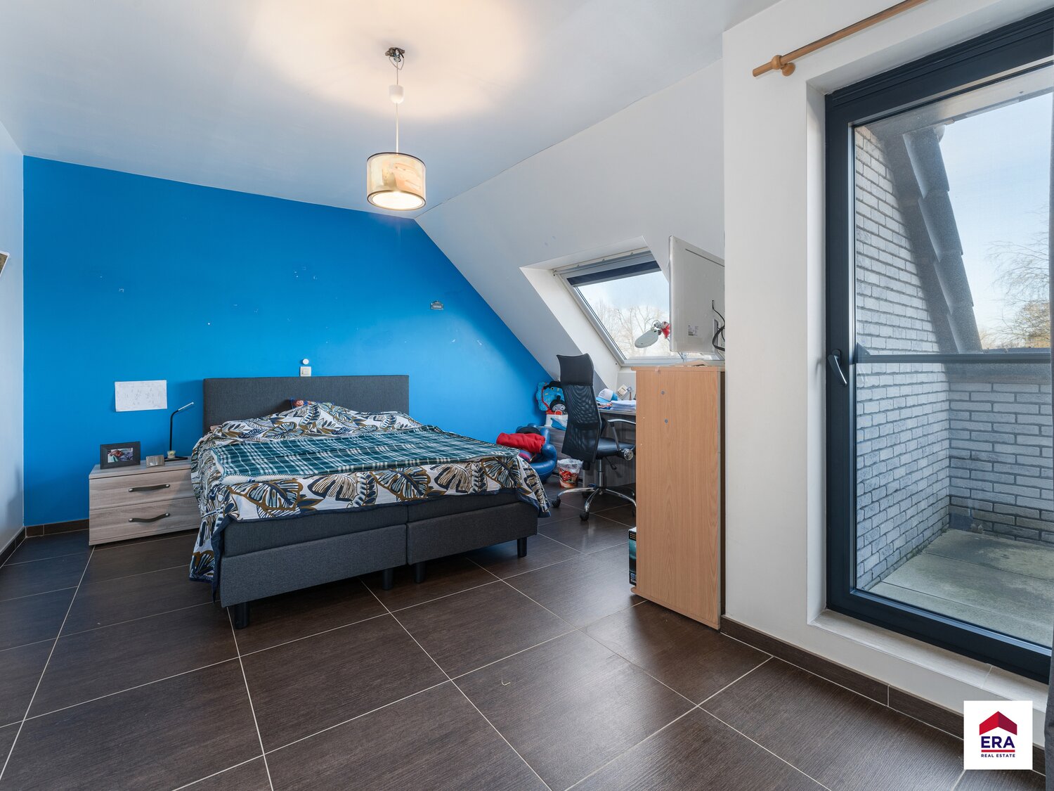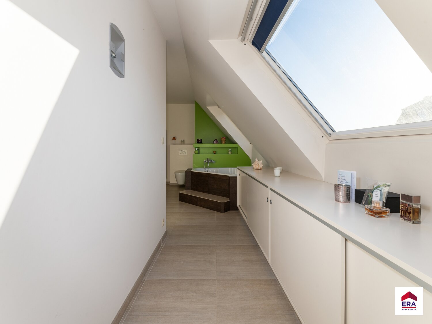 Tweede verdiep: 3 slaapkamers van resp. 20m², 23m², 25m². Badkamer met bad, dubbel lavabomeubel, toilet en voorziening voor dubbele douche. Eén van de slaapkamers heeft zijn eigen ensuite badkamer met douche en lavabo. Terras voor en achteraan.