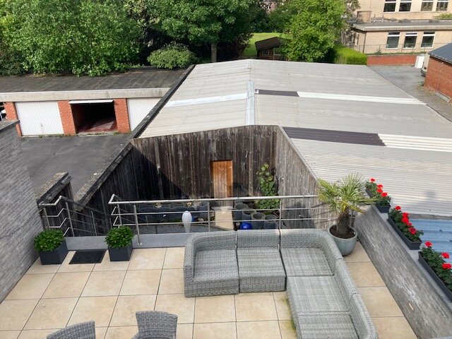 Polyvalente ruimte van +/- 120m² met berging en apart toilet. Perfect mogelijk om in te richten als tweeslaapkamer appartement (plannen reeds beschikbaar) of handelsruimte. Achterliggend magazijn van 198m².