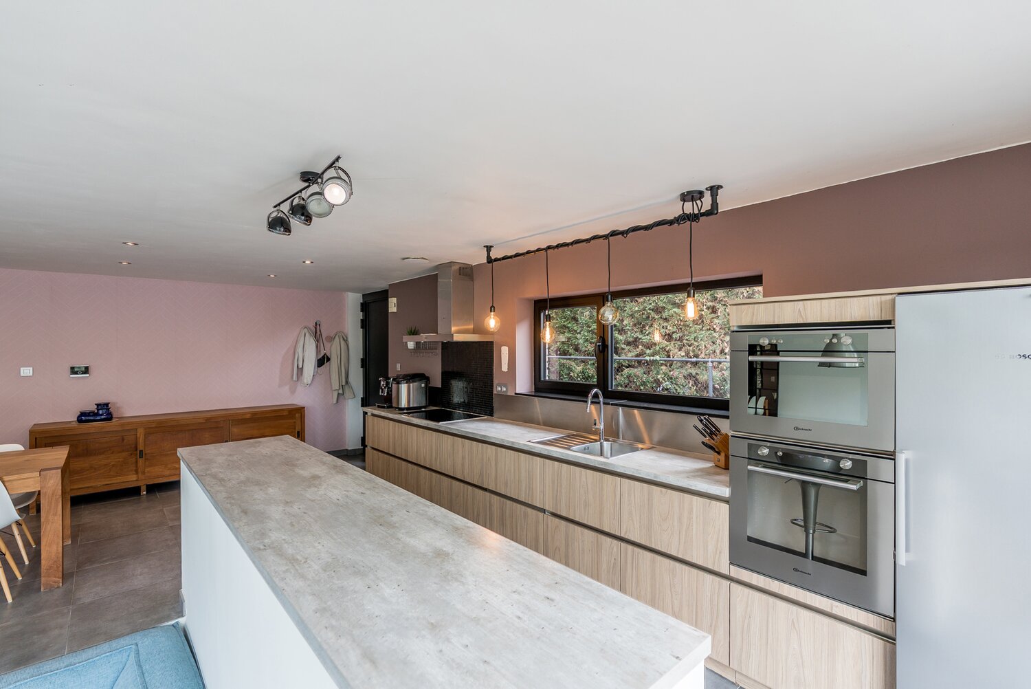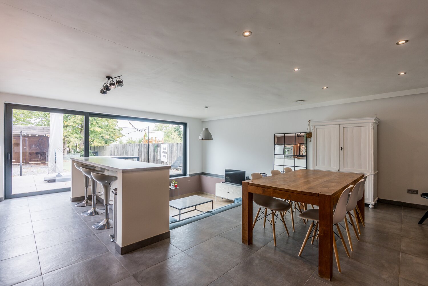 We parkeren ons vooraan en gaan langs de linkse zijde van het gebouw naar de privatieve inkom. Bij het betreden van dit appartement valt ons meteen de openheid en de lichtrijke leefruimte op. Deze is onderverdeeld in een uitermate gezellige zithoek in een lagergelegen niveau, een eetkamer met overview naar de tuin en de uit de kluiten gewassen keuken. Deze is voorzien van alle hedendaags comfort en geeft ook toegang naar het achterliggende terras.