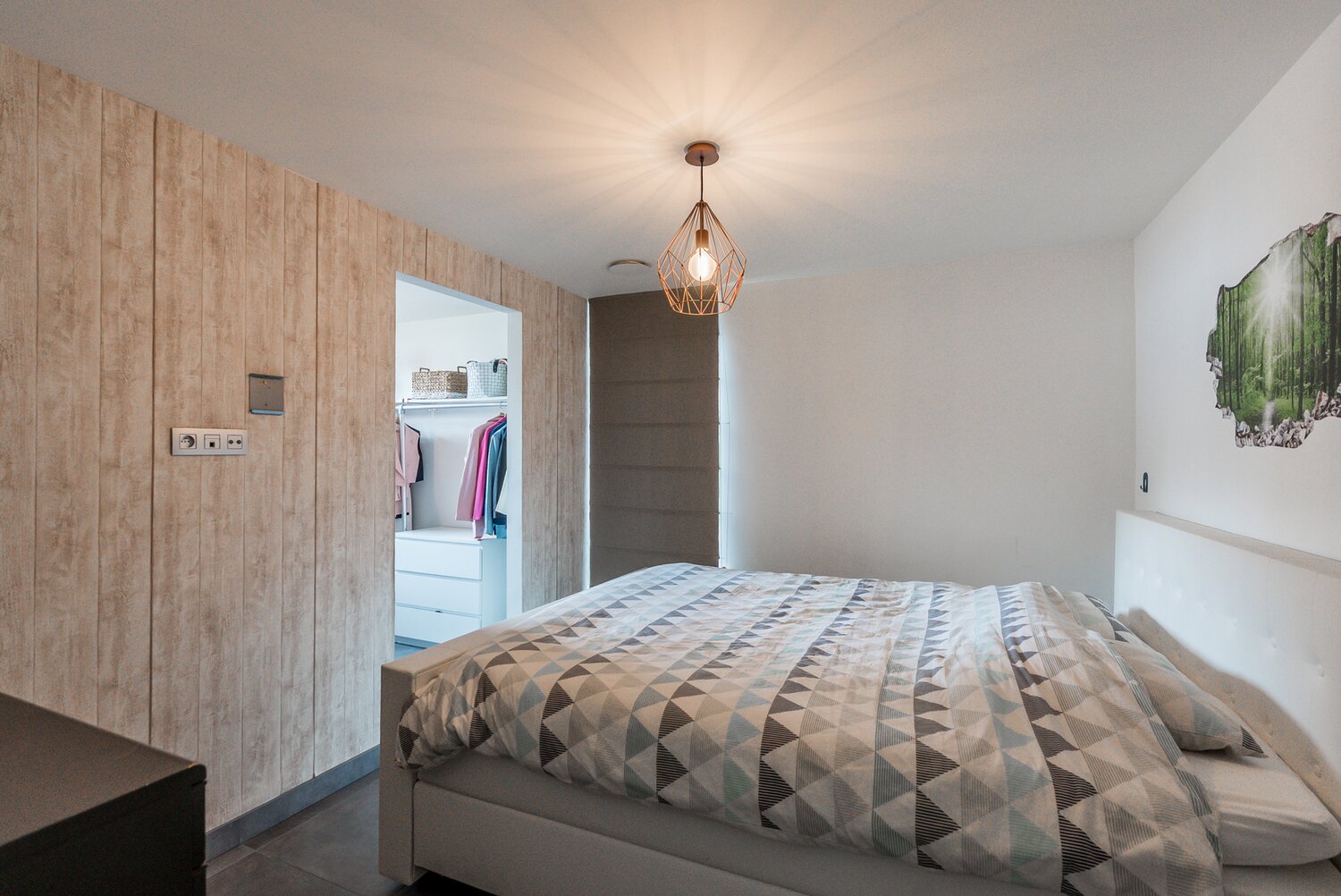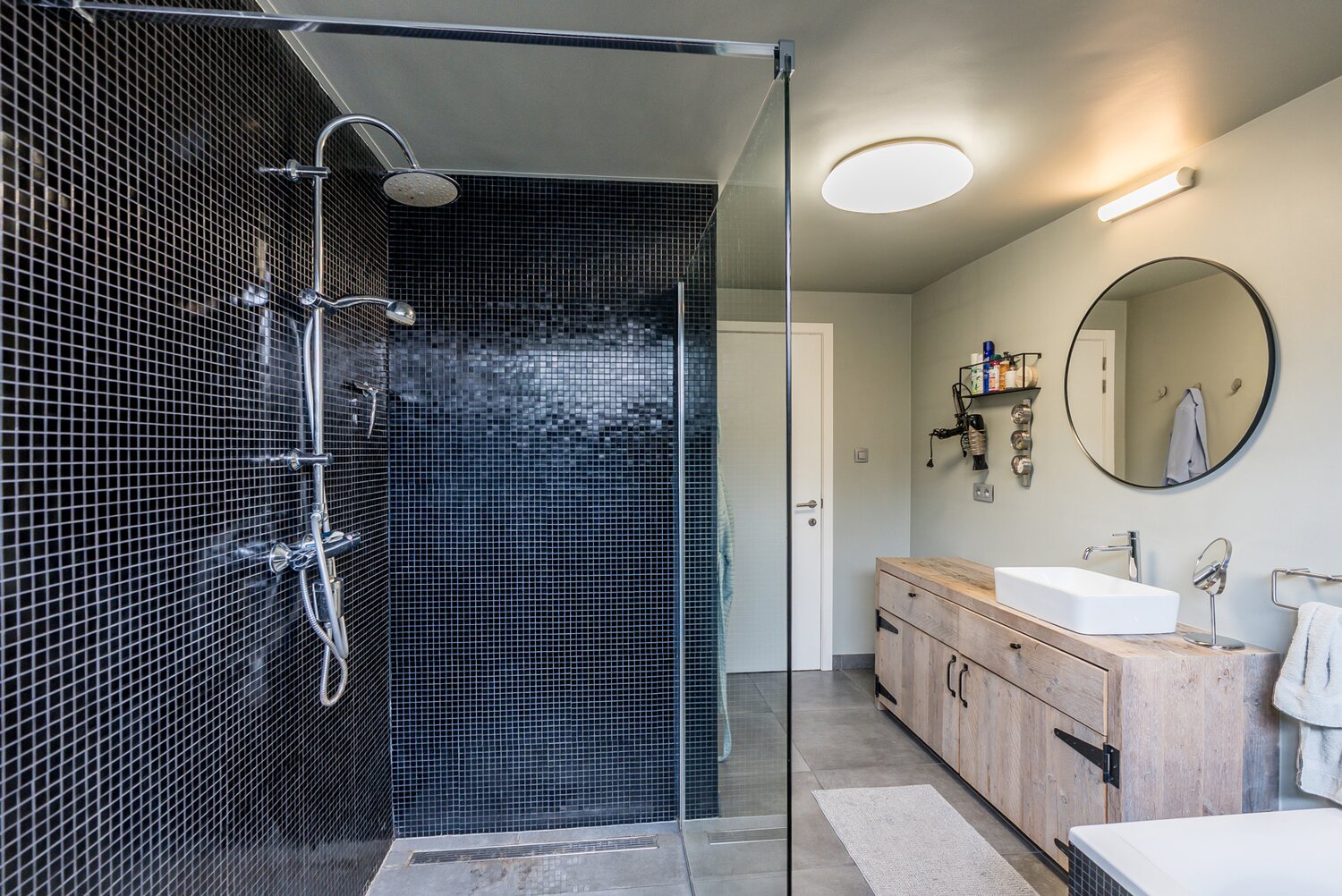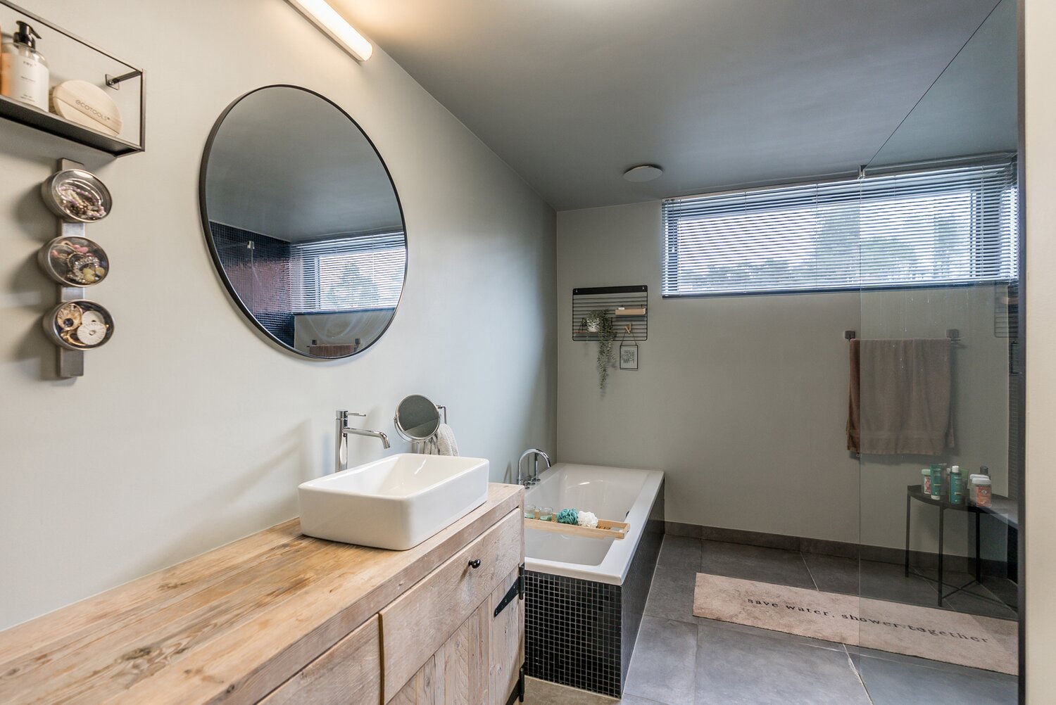 Gaan we vervolgens door naar het nachtgedeelte hebben we hier een koele berging, een wasplaats, een toilet op de gang, 2 slaapkamers, waarvan één met connectie naar de naastliggende dressing en de badkamer. Deze laatste werd voorzien van alle comfort (bad, inloopdouche en lavabo). Ook is er een toegang via de wasplaats naar de kelder.