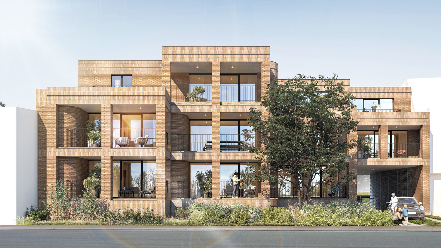 Le design élégant de CAAN Architects combine des briques de façade légères, des menuiseries élancées et des terrasses intérieures pour une sensation d'aération. L'abri à voitures commun avec toit vert renforce le caractère vert de la zone.