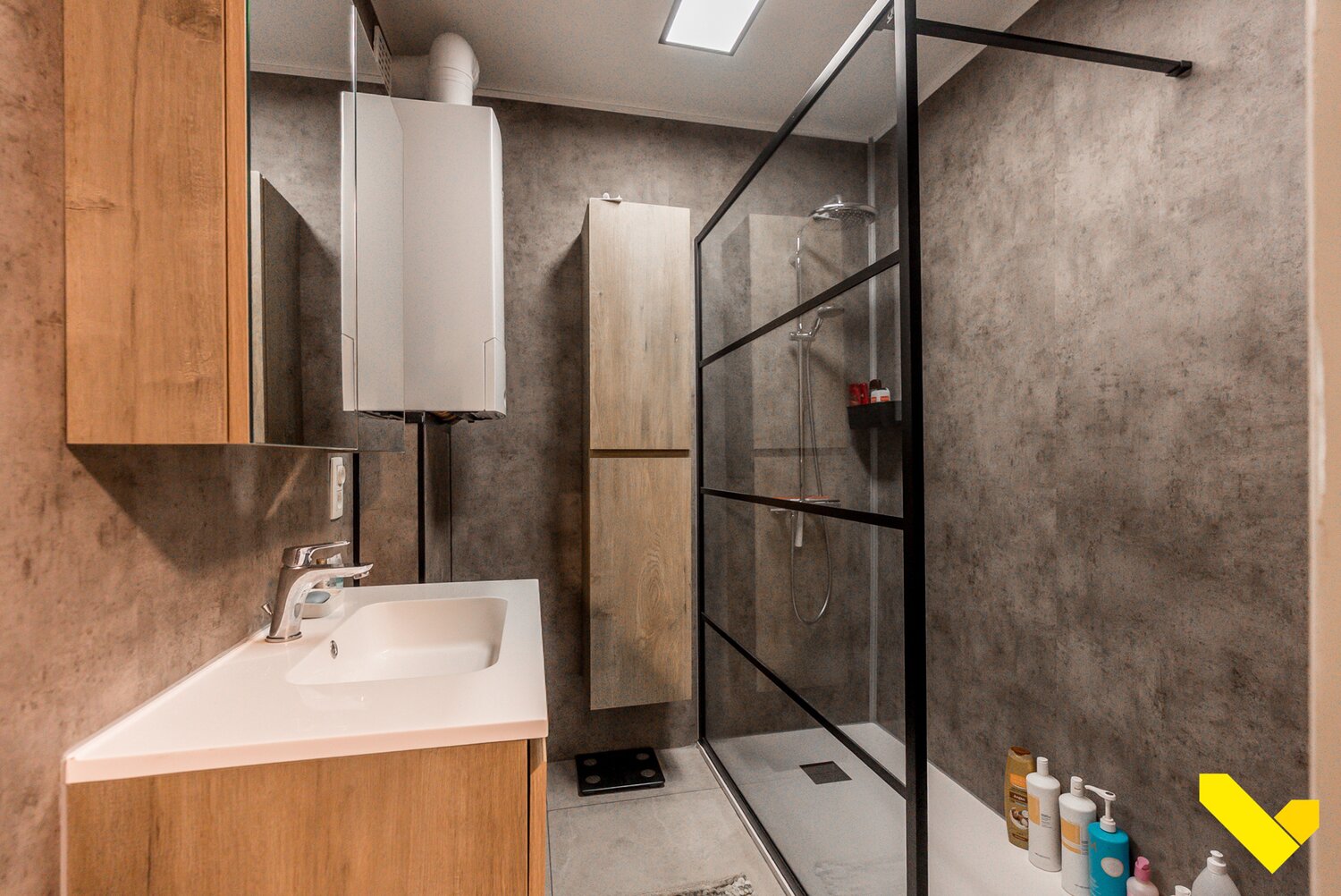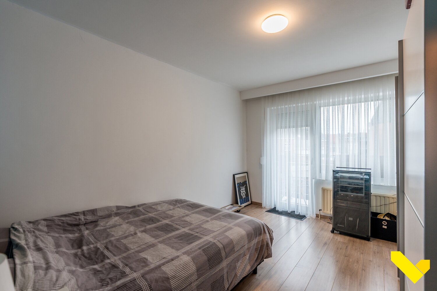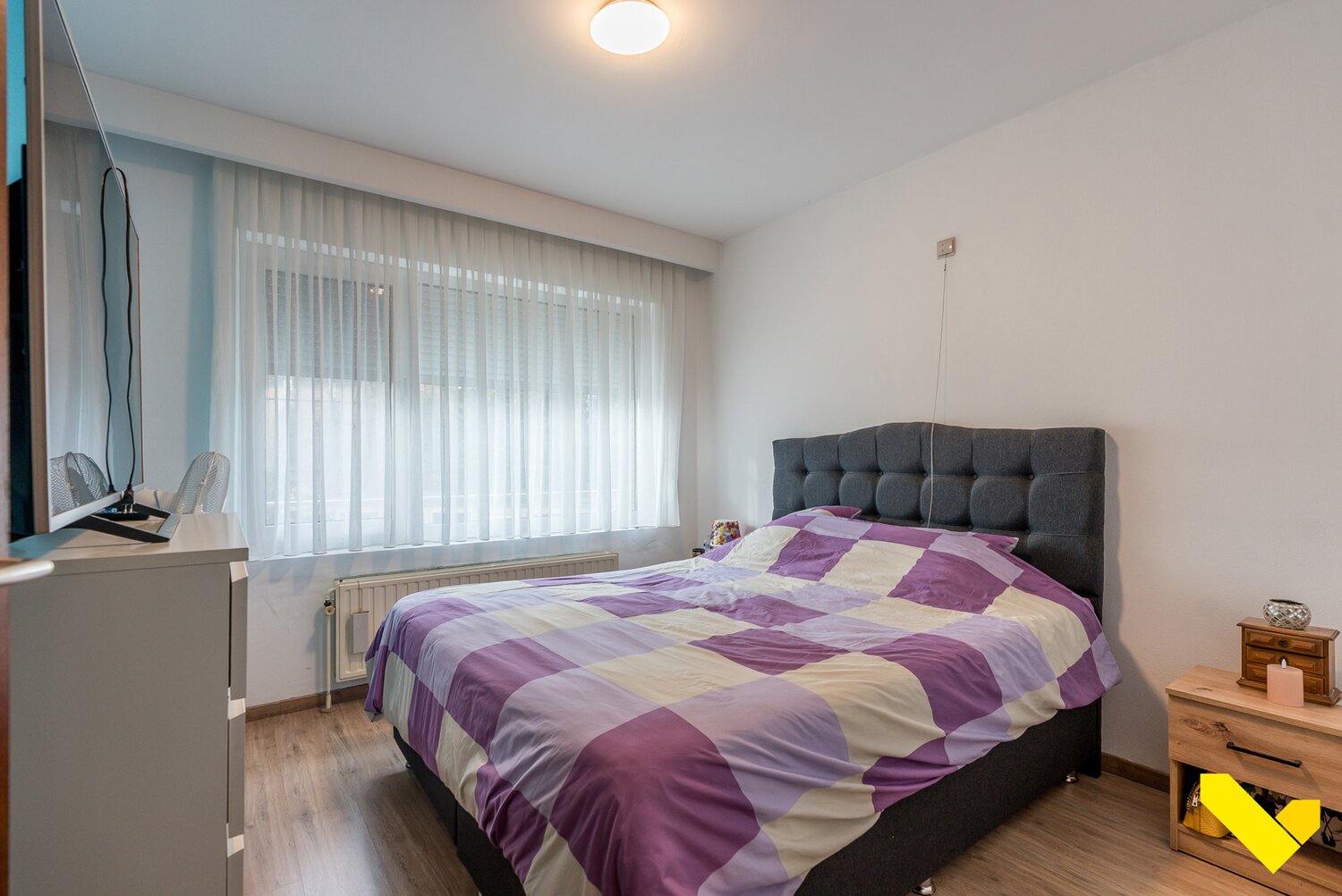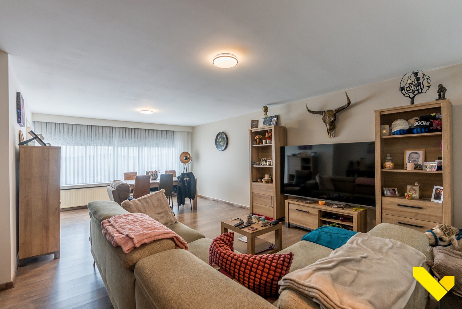 Omschrijving: De inkomhal met vestiaire geeft uit op 2 slaapkamers, derde kamer (6m2) nu gebruikt als bergruimte, badkamer en toilet (vernieuwd 2025). Grote lichtrijke leefruimte (woon/eetkamer) met aansluitend een volledig recent vernieuwde keuken (2024) voorzien van alle hedendaags comfort. Achteraan is er tevens een terras van 7m².